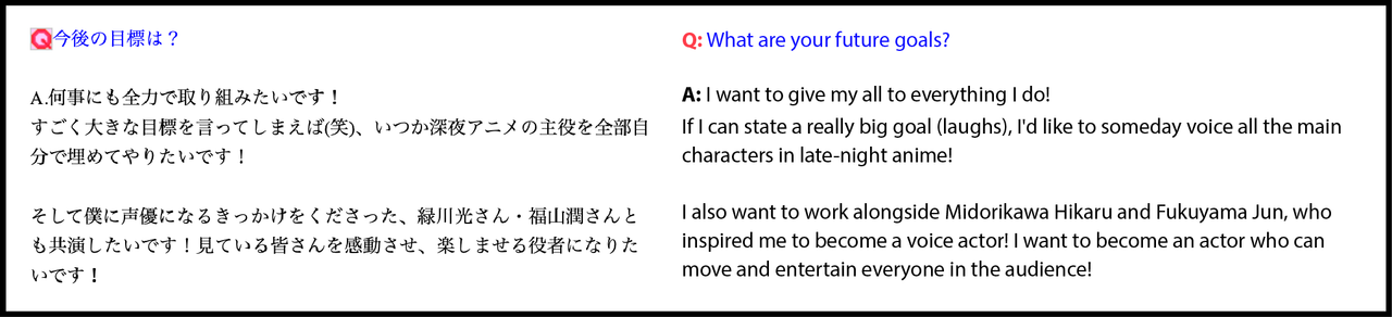 He was inspired to look into voice acting by Fukuyama Jun’s performance as Lelouch in Code Geass. Like Silver’s VA Shimazaki, he also cites Lilia’s VA Midorikawa as an inspiration.