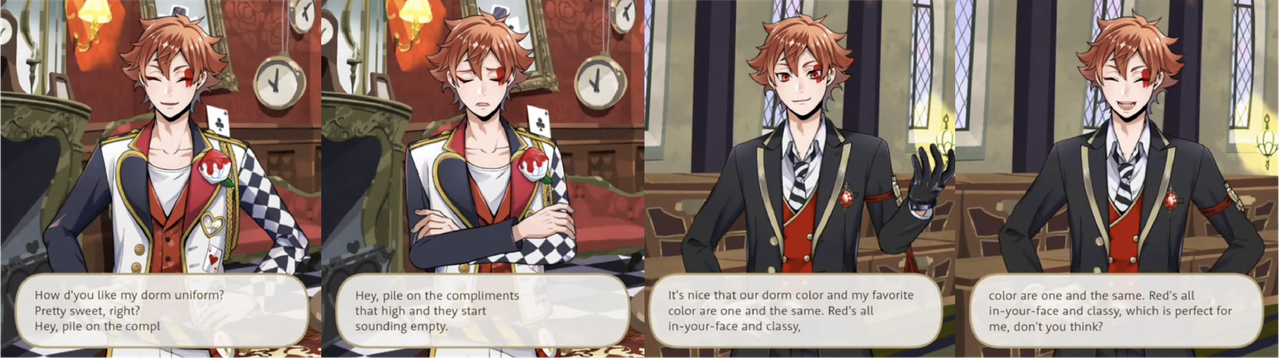Ace seems to like the Heartslabyul dorm uniform, and says his favorite color is red: “Red’s all in-your-face and classy, which is perfect for me, don’t you think?”