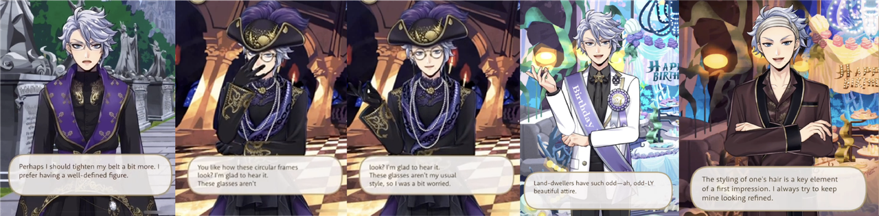 He might not be fond of his outfit for the first birthday series, saying, “Land-dwellers have such odd–ah, odd-LY beautiful attire,” and that he did his best to study “land-dwellers’ fashion.”