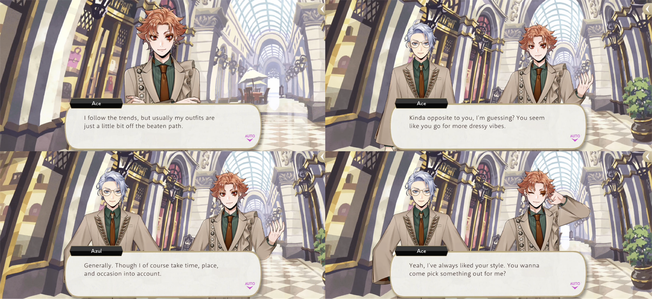 Ace says that Azul seems like he goes for “more dressy vibes” than himself and Azul responds, “Generally. Though I of course take time, place, and occasion into account.”