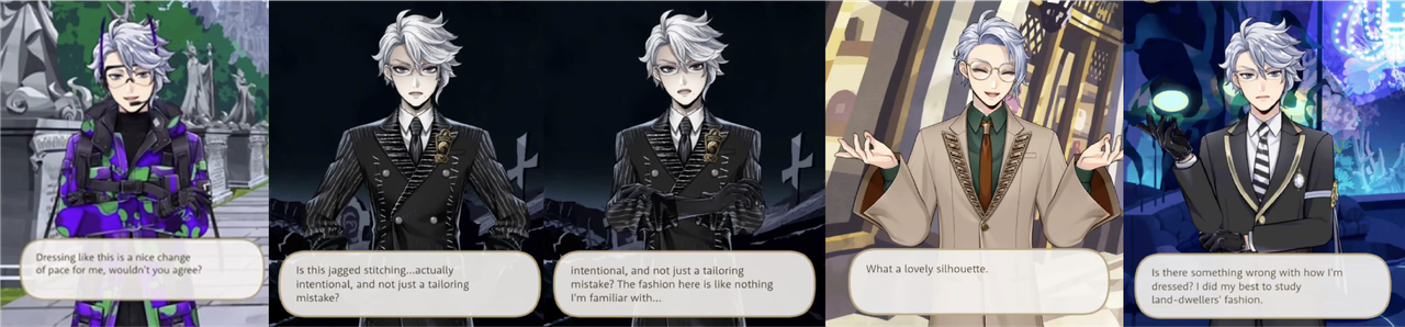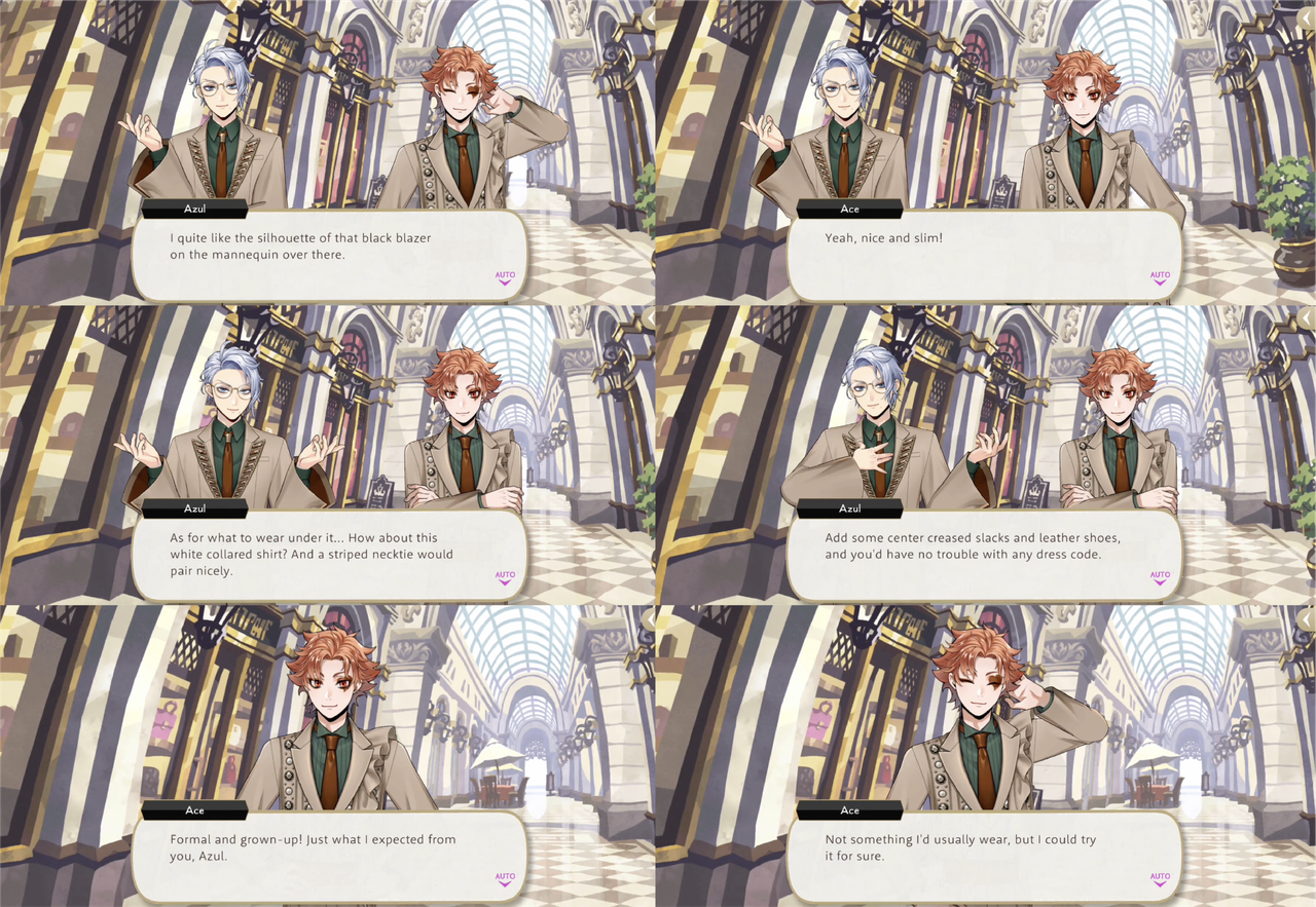 Ace asks Azul to pick out an outfit for him in the Fairest City and Azul suggests a black blazer with a “nice and slim” silhouette, a white collared shirt, a striped necktie, center-creased slacks and leather shoes.
