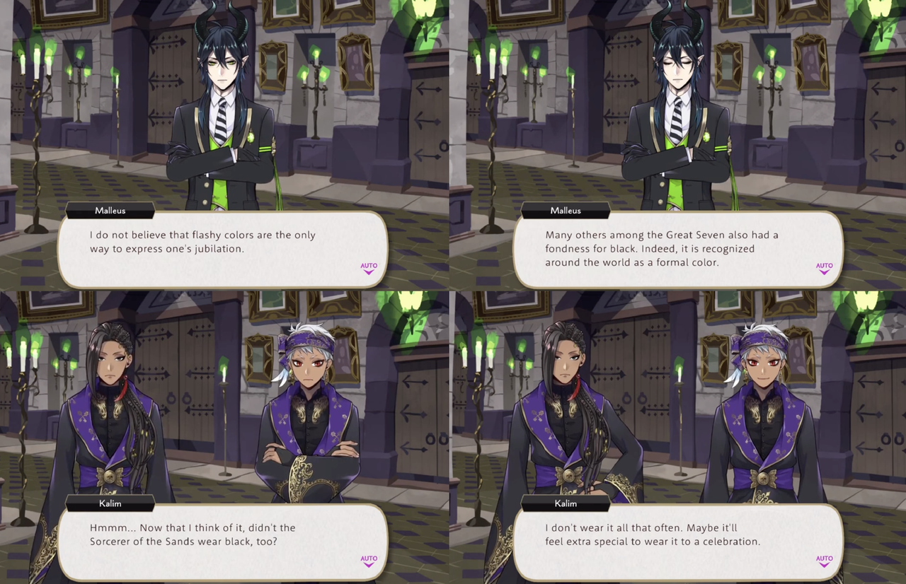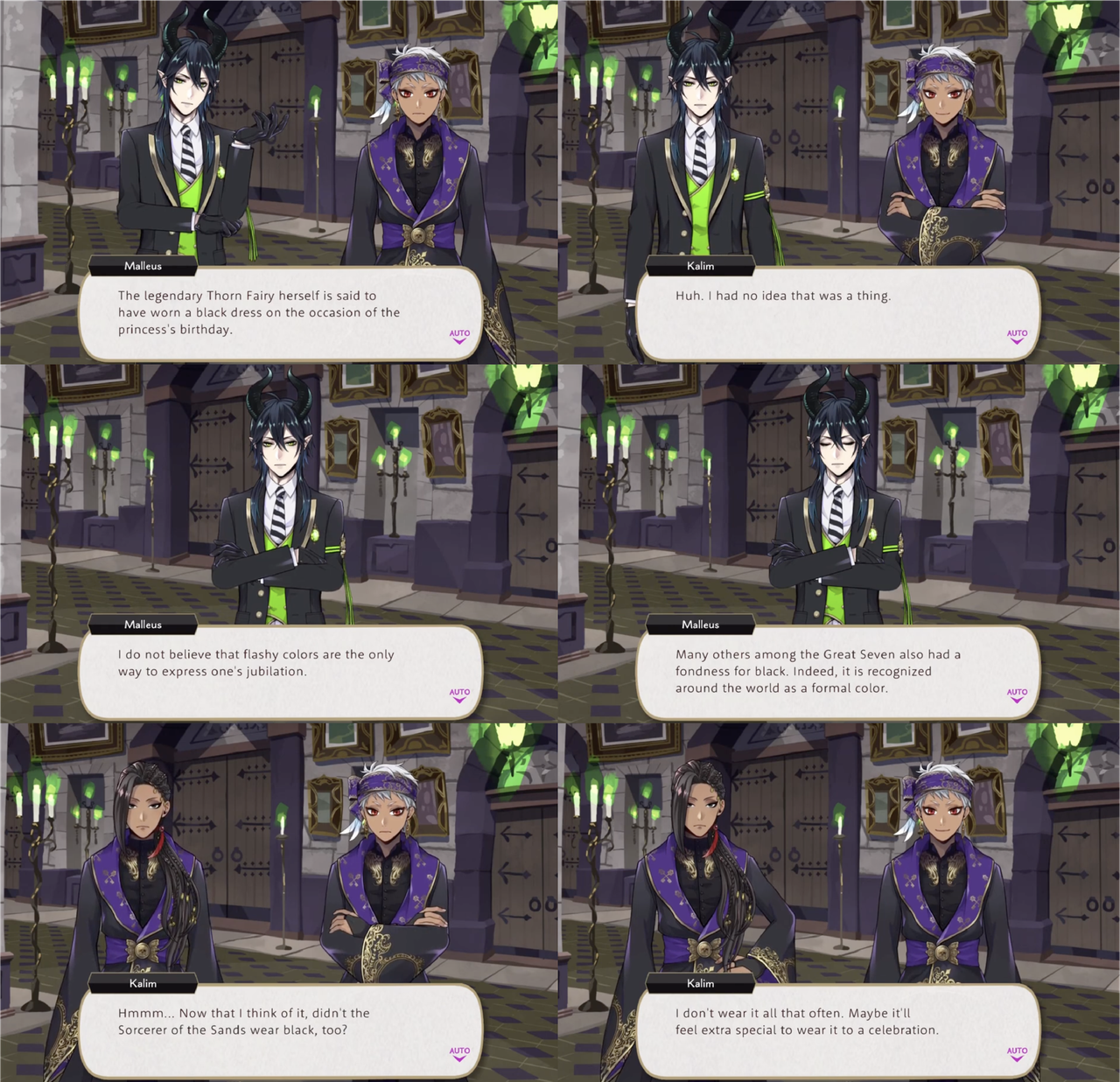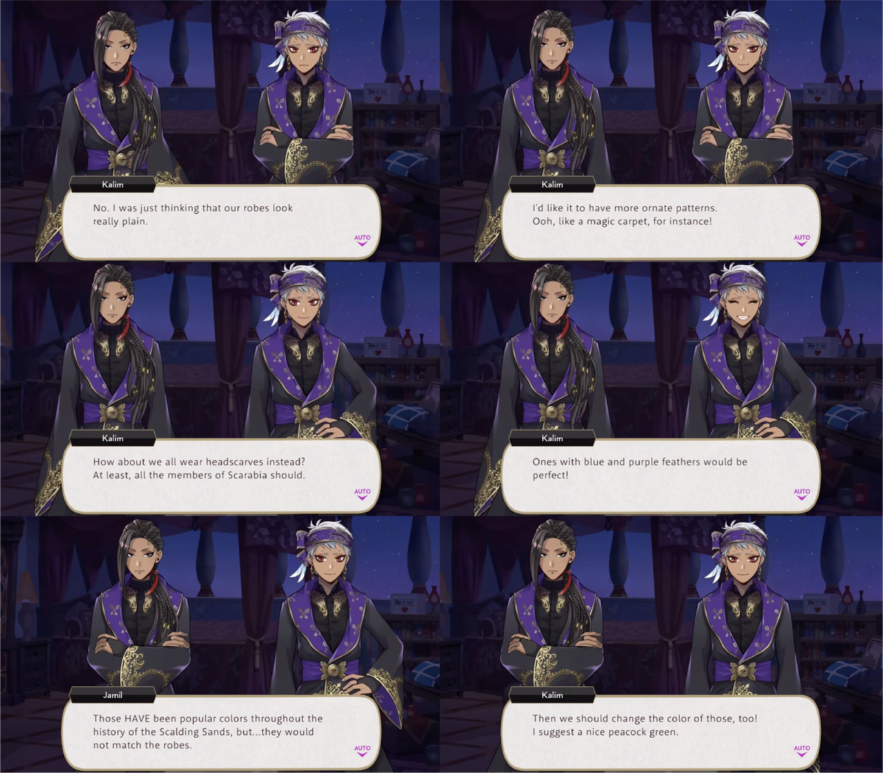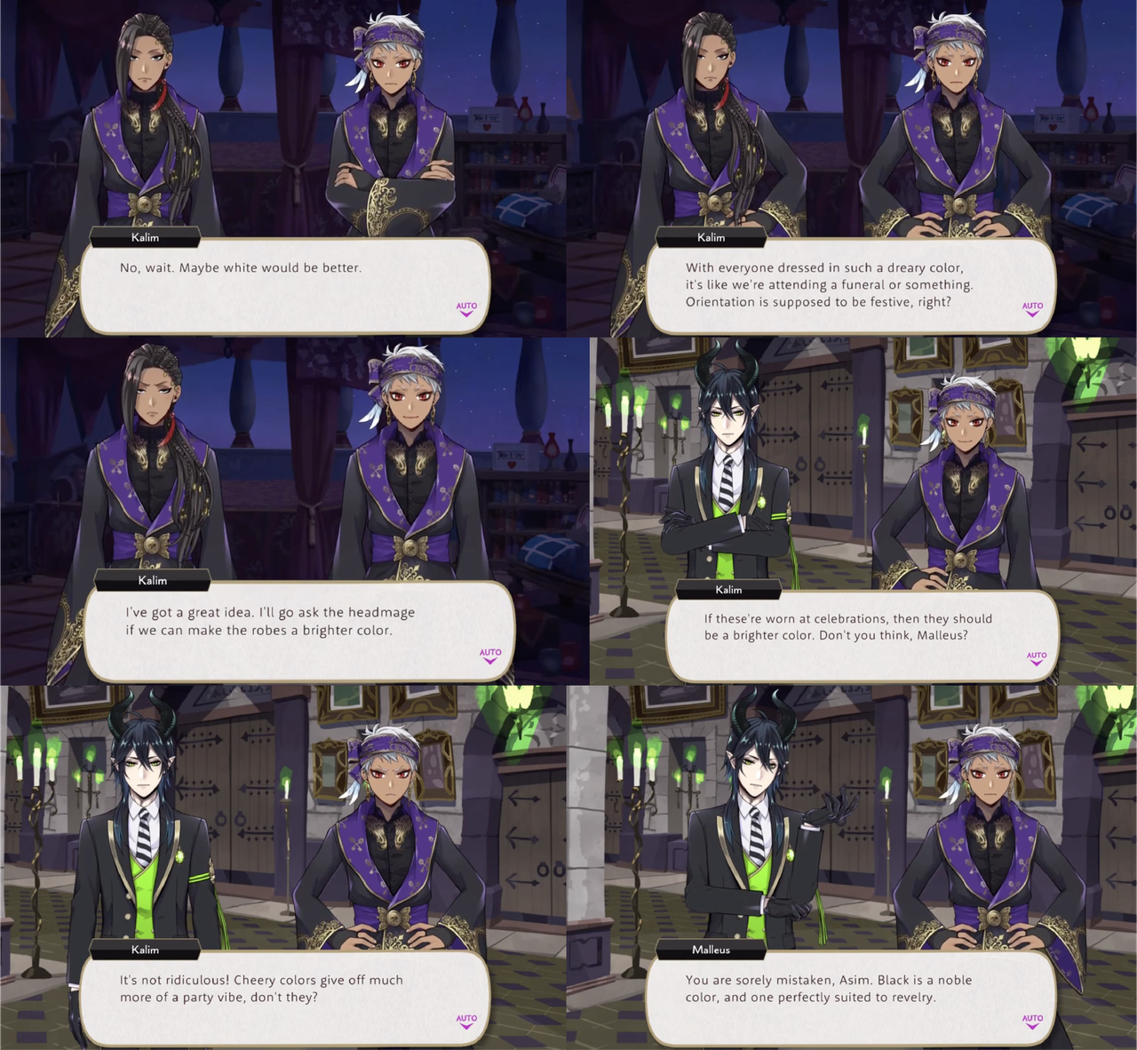 Kalim’s ceremonial vignette revolves around him deciding to convince Crowley to change the color of the ceremonial robes to something brighter and add more ornate designs. Malleus convinces him not to do so.
