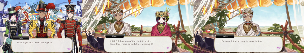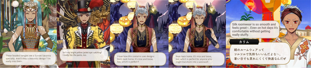 Kalim says that he likes the design of his “beaded bangles” for the Cloudcalling event and his pants and jacket for Playfulland, but those are maybe closer to costumes than everyday wear and might or might not reflect his preferences for his usual clothing.