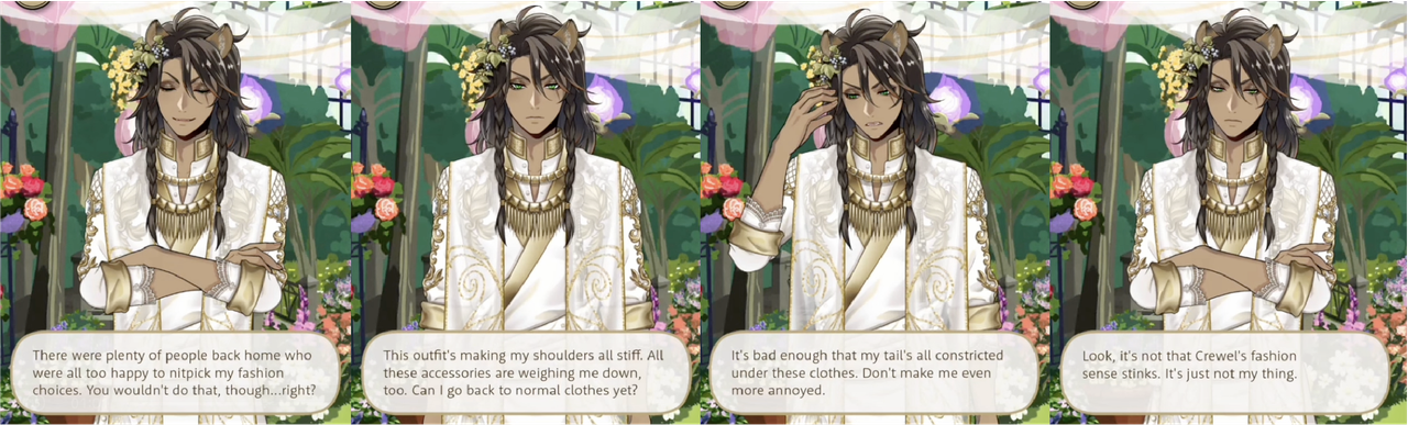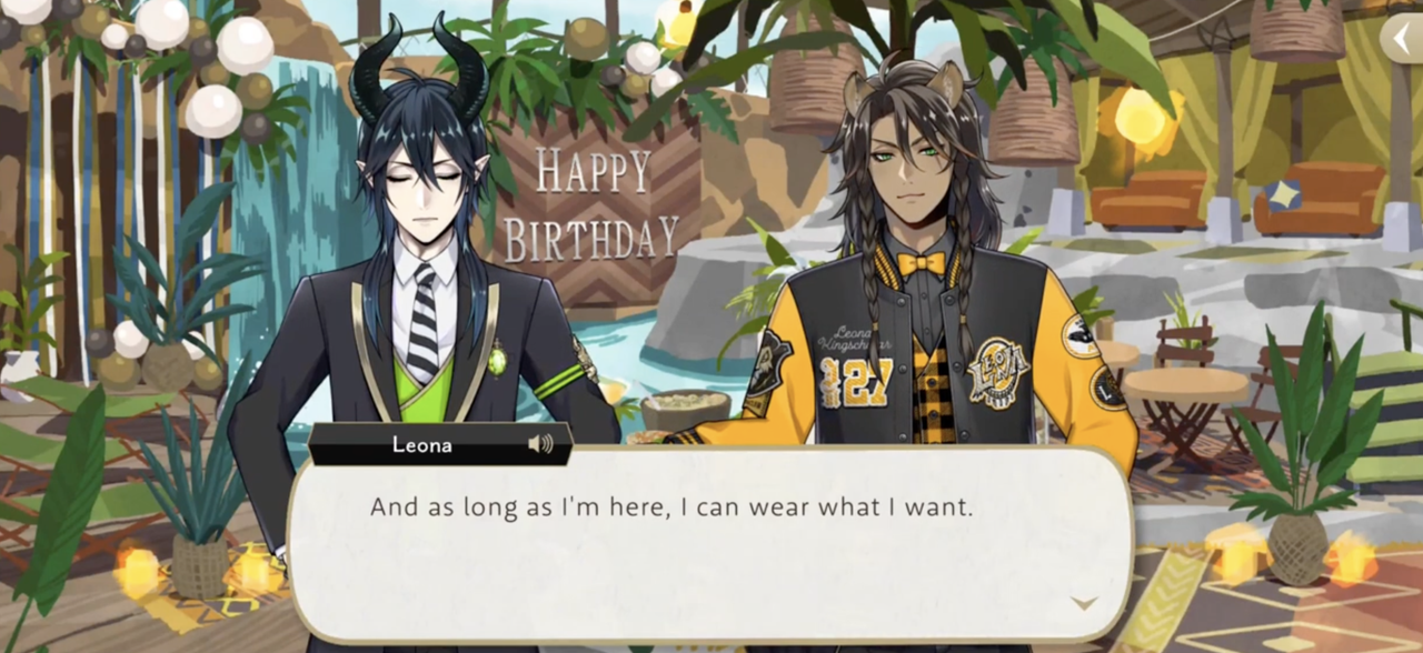 It is possible that Leona’s style does not meet the approval of others back home: he tells Malleus that one of the things he likes about NRC is, “as long as I’m here, I can wear what I want,” and he has a Fairy Gala line about how there are “plenty of people back home who were all too happy to nitpick (his) fashion choices.”