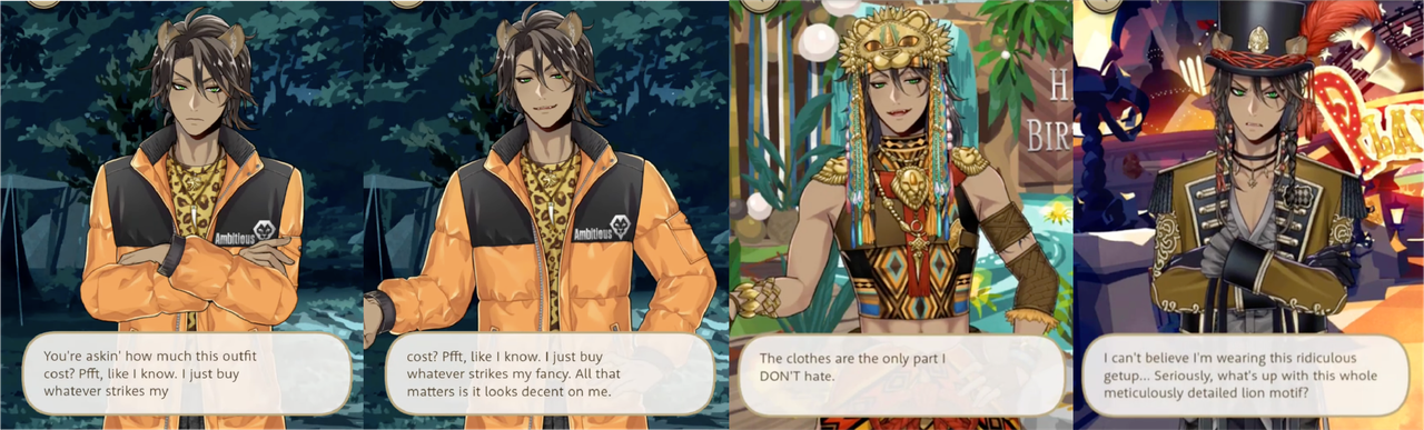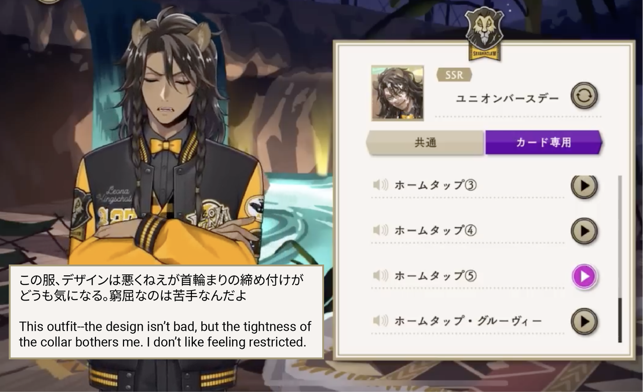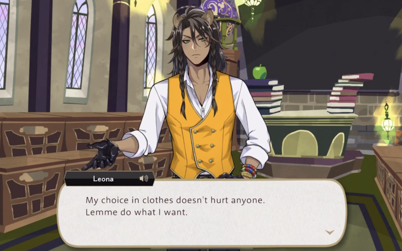 Leona says he hates clothes that feel restrictive (“Who cares if I wear things loose?”). When asked why he does not wear his necktie with his school uniform Leona responds, “As if l’d suffocate myself wearing that.”