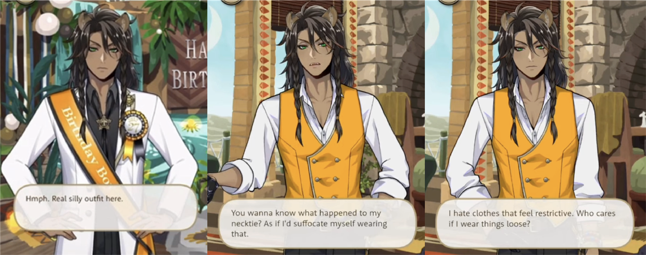 Leona refers to the suit of the first birthday series as a “real silly outfit,” and while he says that the design of the second birthday series’ outfit isn’t bad, he does not like the tightness of the collar.