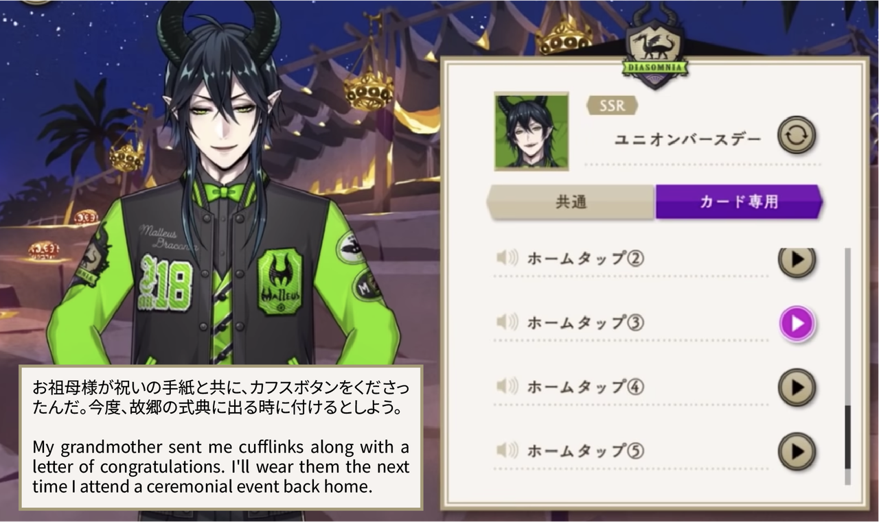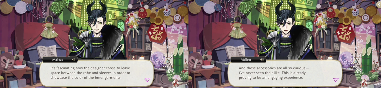 Malleus describes his New Year’s outfit: “It’s fascinating how the designer chose to leave space between the robe and sleeves in order to showcase the color of the inner garments. And these accessories are all so curious—I’ve never seen their like.”