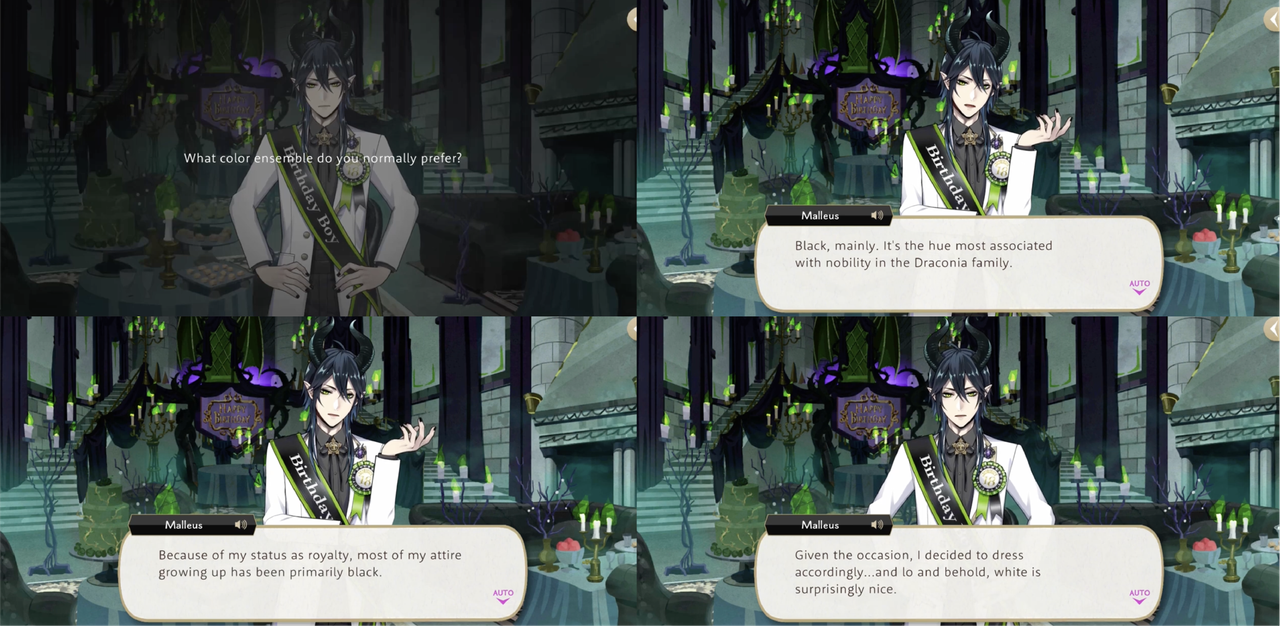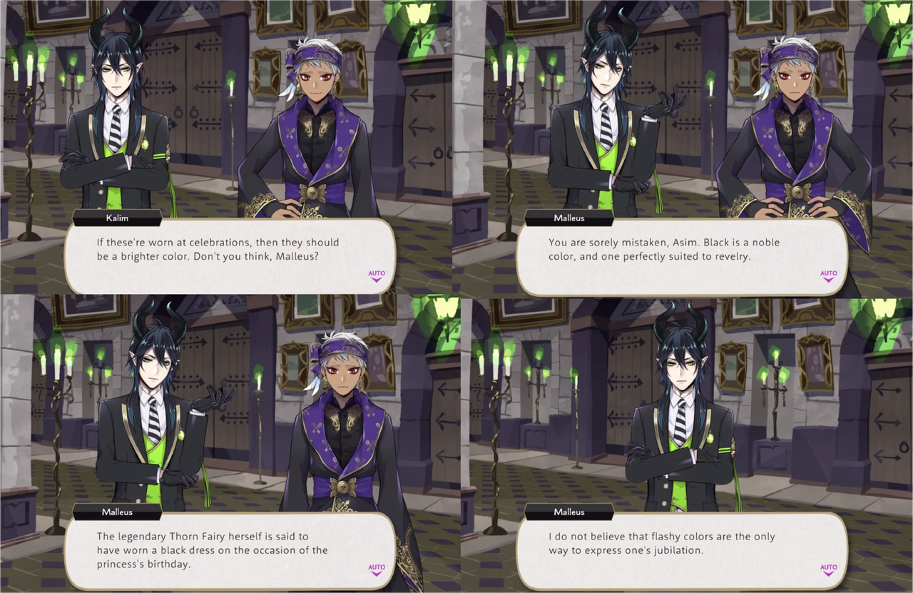 When Kalim says that brighter colors should be worn at celebrations, Malleus disagrees: “Black is a noble color, and one perfectly suited to revelry…I do not believe that flashy colors are the only way to express one’s jubilation.”
