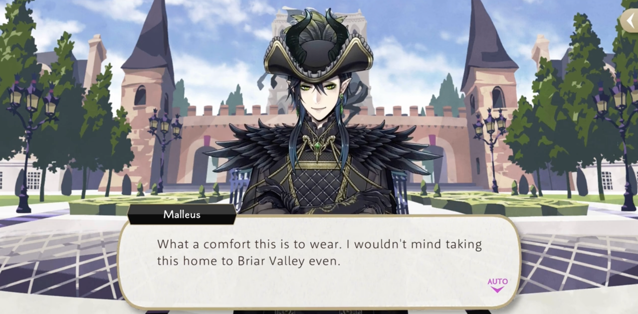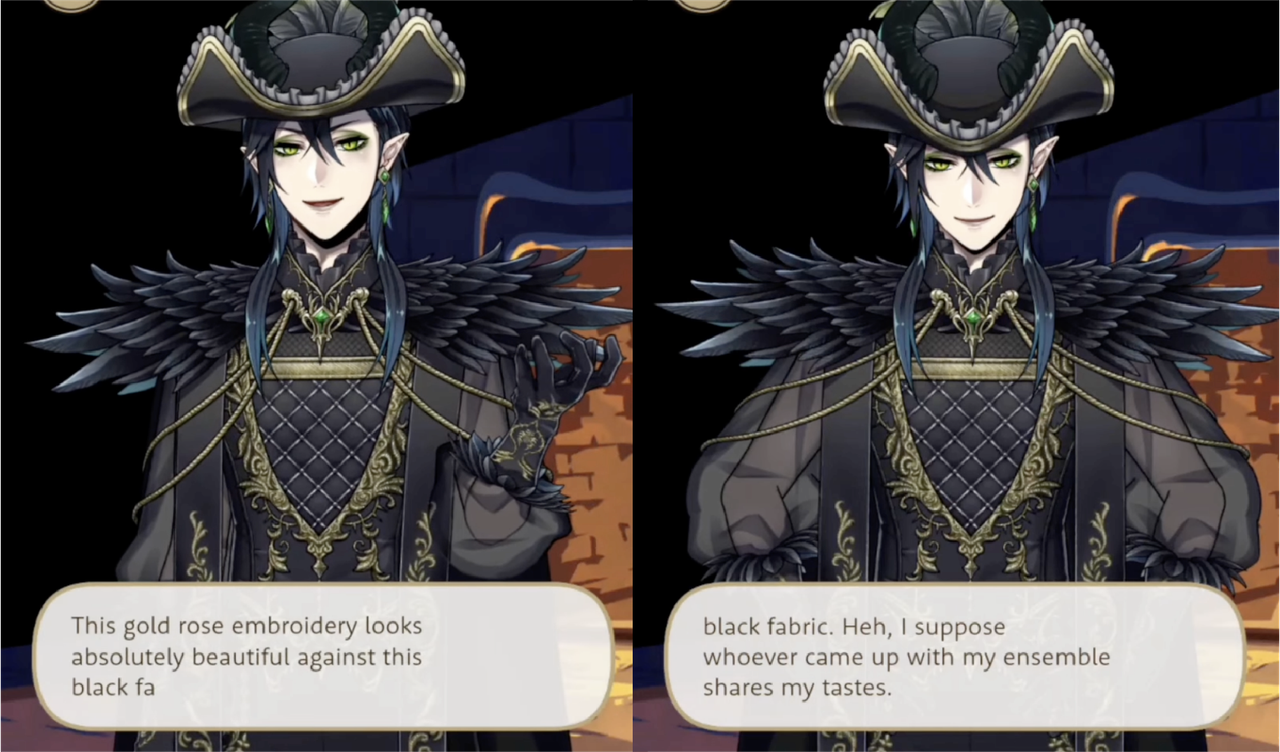 Malleus says that his Glorious Masquerade outfit is “a comfort to wear” and is to his tastes, mentioning the gold rose embroidery on black fabric specifically.