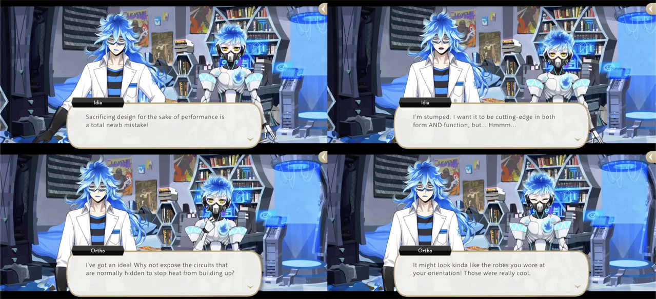 It is possible that such designs were sometimes encouraged by a specific request from Ortho (in order to match his big brother?), who says, “I had my brother build this body to match his dorm uniform!” about his Dorm Gear, and he gives Idia the idea to make his Burst Gear look like the school’s Ceremonial Robes.