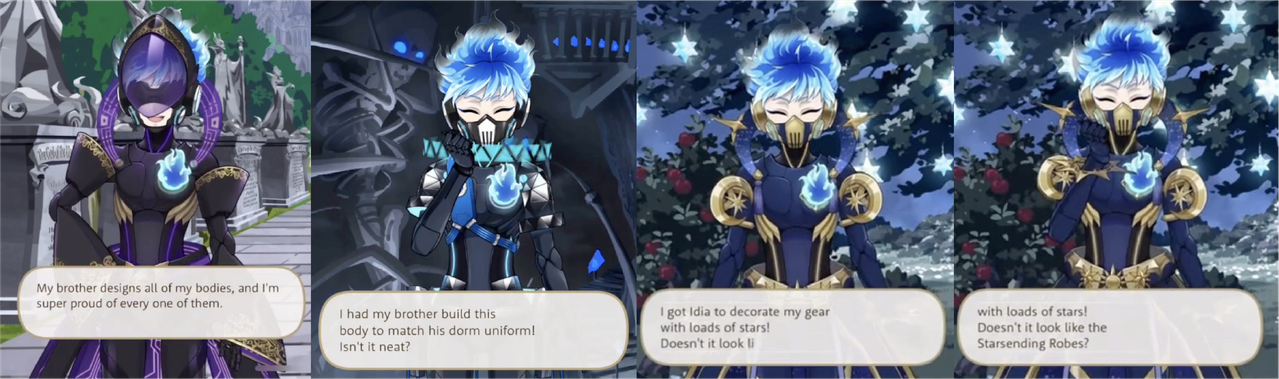 In an early voiceline Ortho says that Idia designs all of his bodies (“And I’m super proud of every one of them”), and it seems the gear that Idia would make for him would often be inspired by Idia’s own clothes for the school, such as the ceremonial robes, Ortho’s dorm uniform and his Stargazer look.