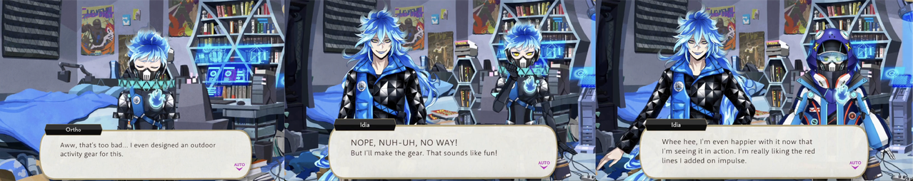 While it is Ortho who draws up the blueprints for his Outdoor Gear it is Idia who builds it, and Idia also seems to contribute alterations to the design (“I’m really liking the red lines I added on impulse”), so the Outdoor Gear might also not be 100% an example of Ortho’s personal tastes.