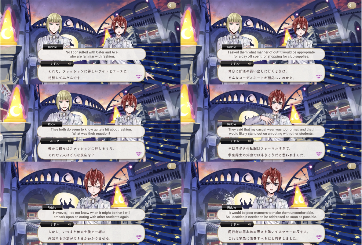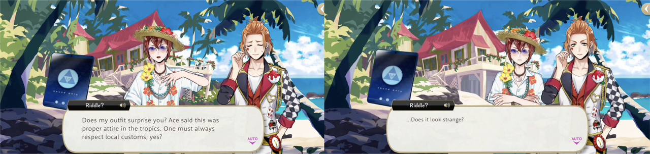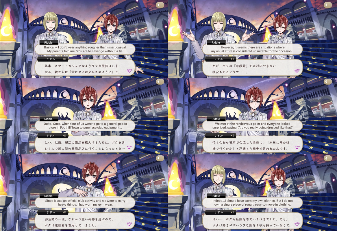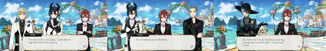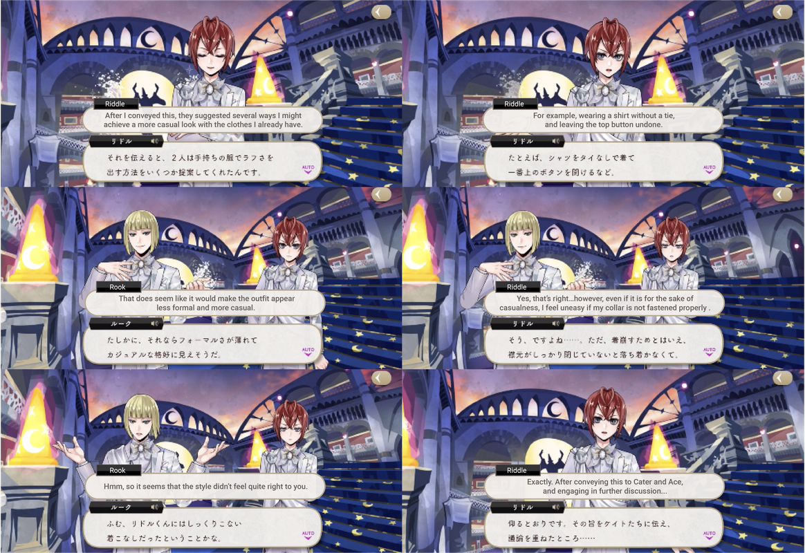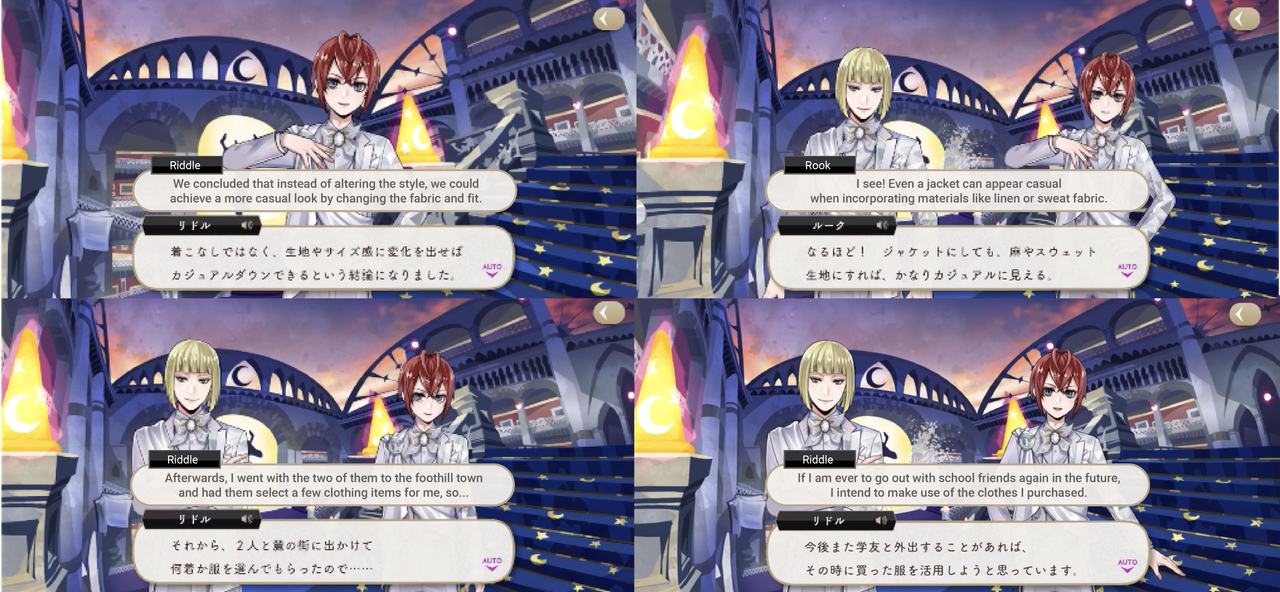 Riddle has a conversation with Rook about his outside-of-NRC clothing in his platinum vignette, where he explains that he does not own anything less formal than “smart casual” as his parents have told him that he is never to be without a necktie.