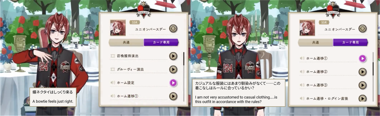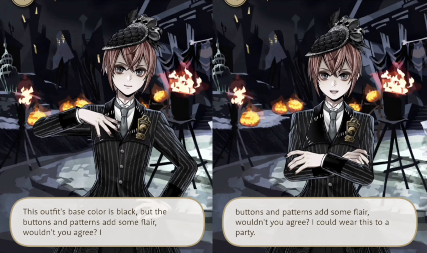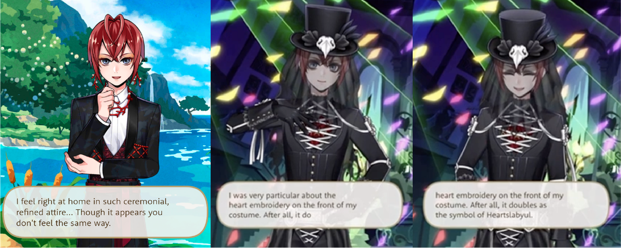 Riddle has a voices line complimenting the elaborate embroidery of his masquerade outfit, and may have an eye for quality, saying that he was “very particular about the heart embroidery” on the front of his Halloween costume (“After all, it doubles as the symbol of Heartslabyul”).