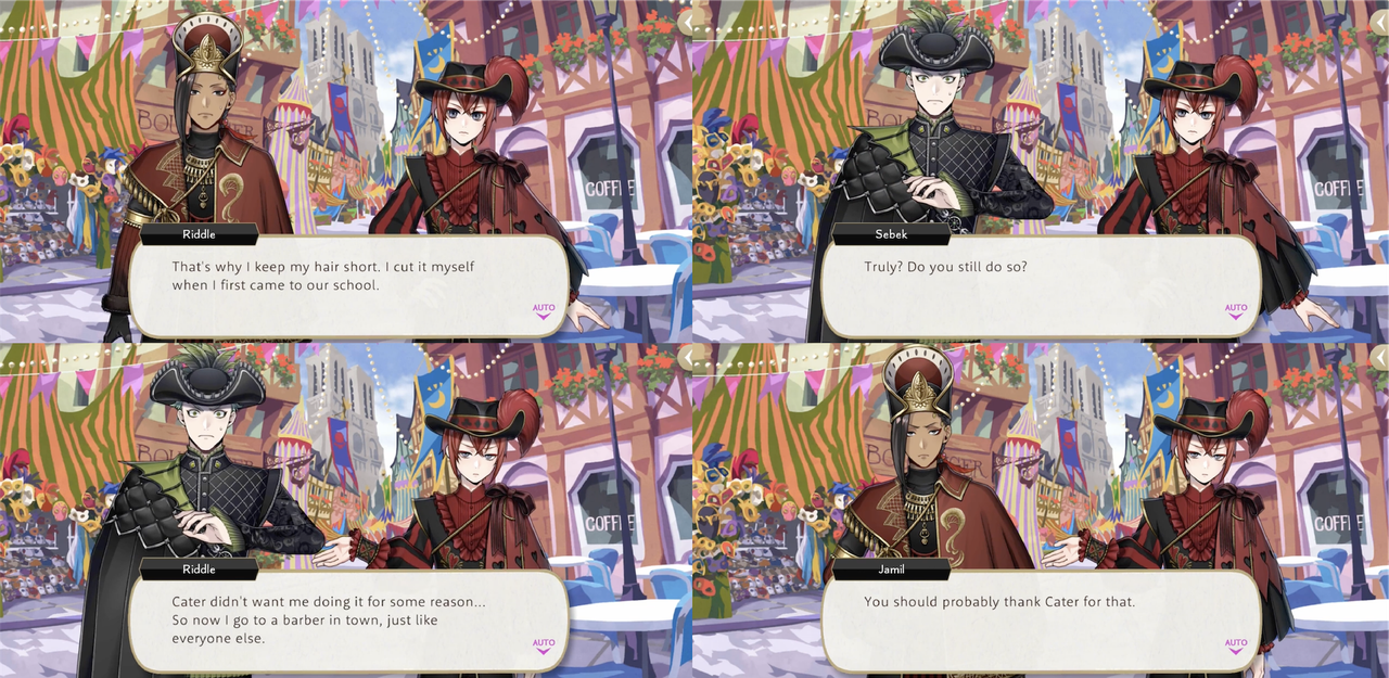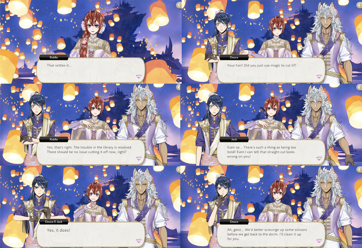 We get an example of Riddle cutting his own hair during the Rapunzel event when he does so with magic and is confused when Jack and Deuce react with surprise, with Jack saying, “Even I can tell that straight cut looks wrong on you!,” and Deuce insisting on fixing Riddle’s hair himself before they return to the dorm.