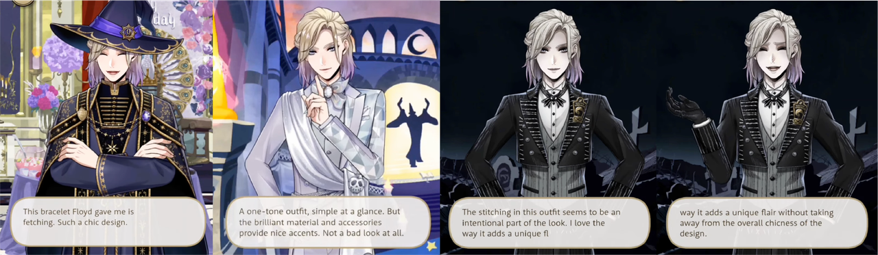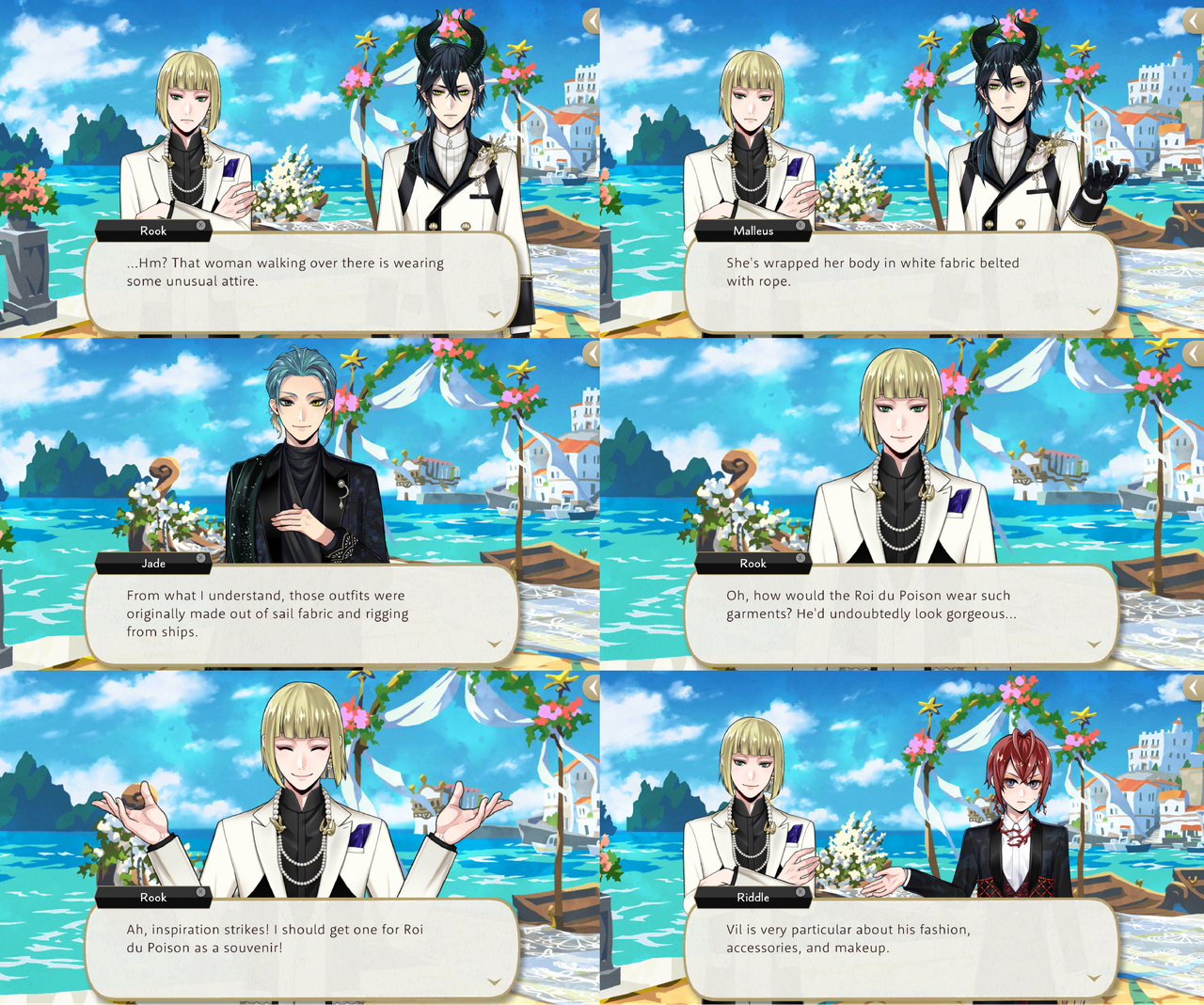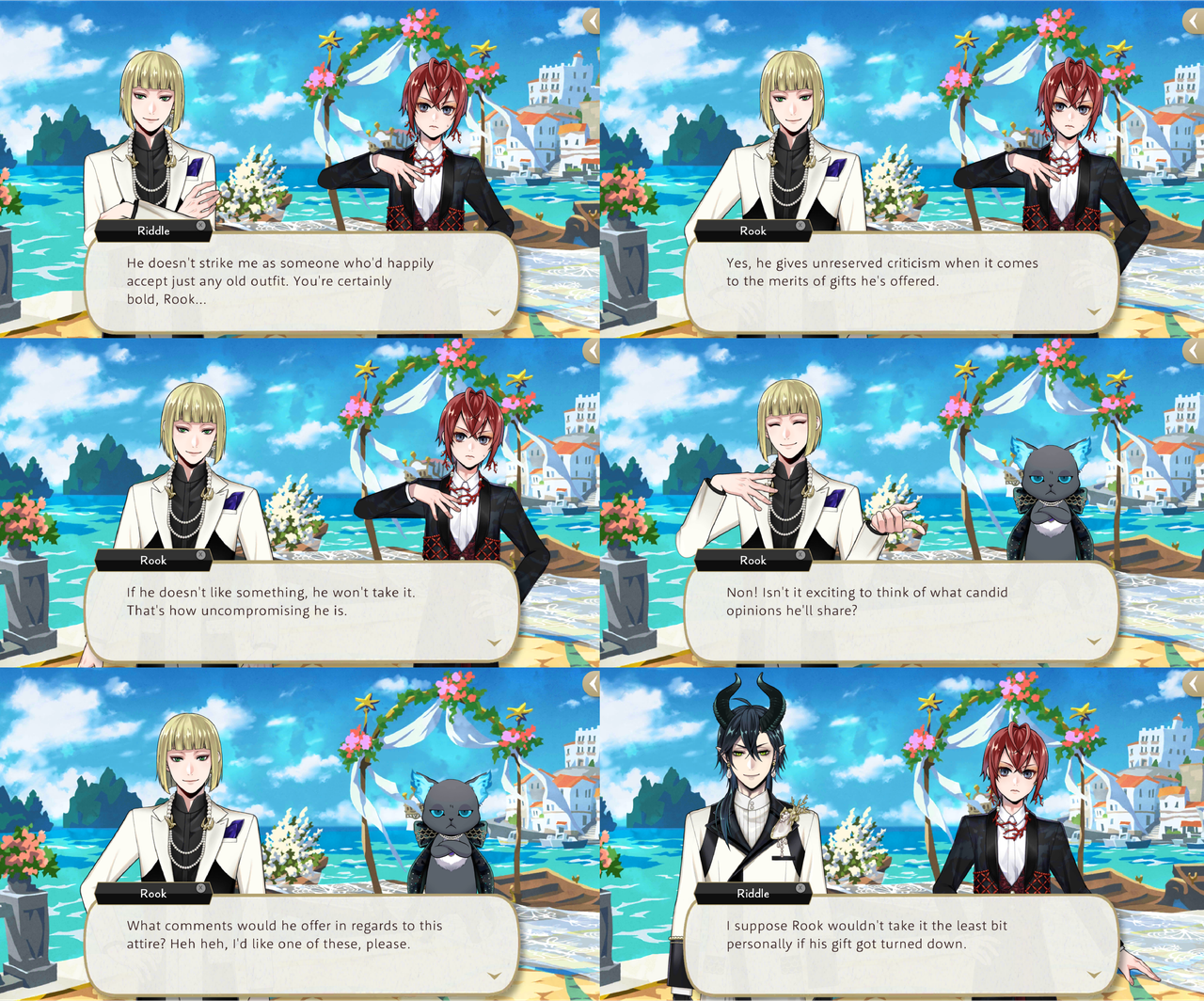 When Riddle says that he cannot imagine Vil happily accepting “just any old outfit” Rook says, “If he doesn’t like something, he won’t take it. That’s how uncompromising he is,” and that he looks forward to hearing Vil’s candid opinions on the gift.