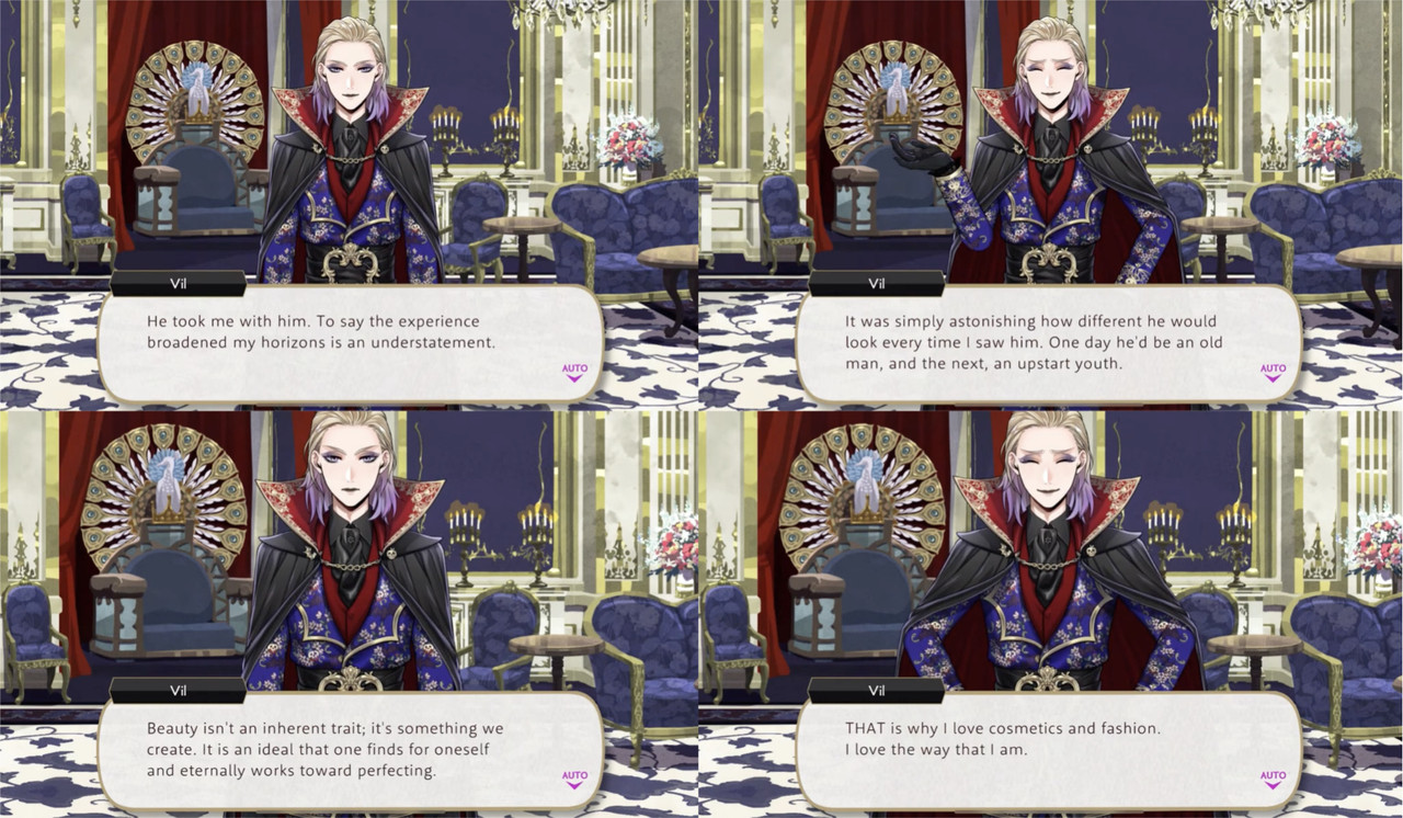 Vil says that he loves cosmetics and fashion, having been influenced strongly by his father.
