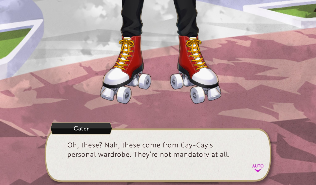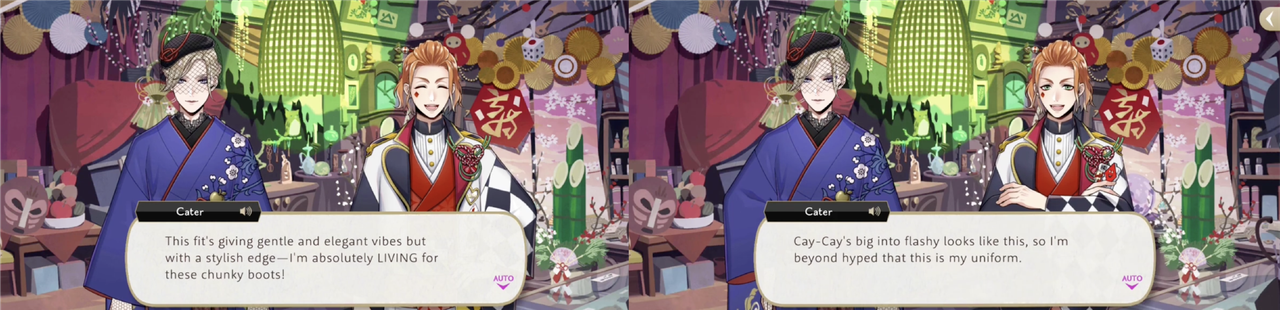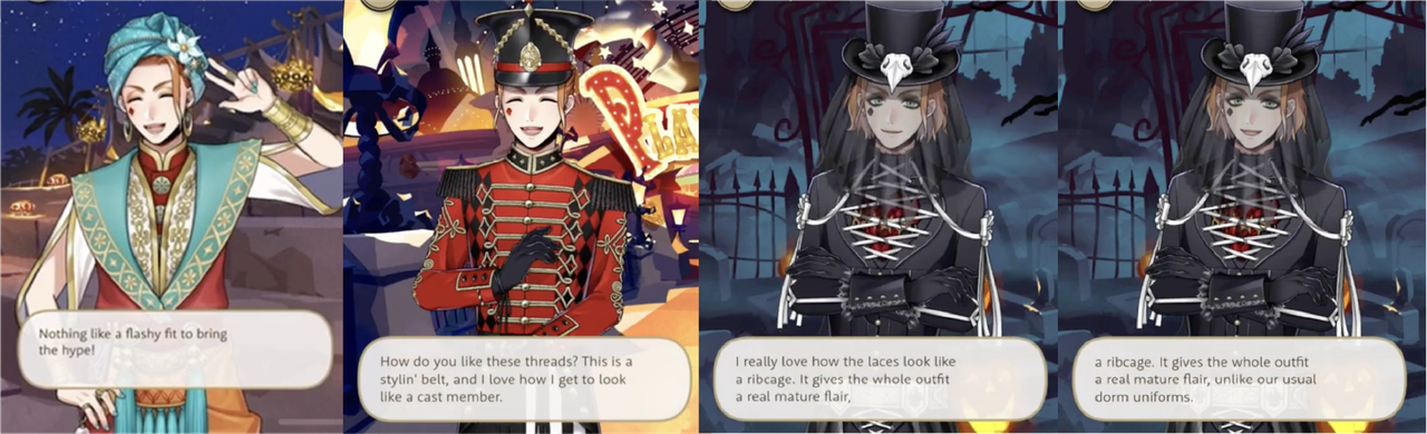 Cater says, “nothing like a flashy fit to bring the hype” about his Firelit Sky outfit and that he likes the belt that comes with his Playfulland clothing, but also says that he likes the laces of his Halloween look: “It gives the whole outfit a real mature flair, unlike our usual dorm uniforms.”