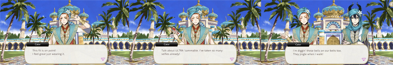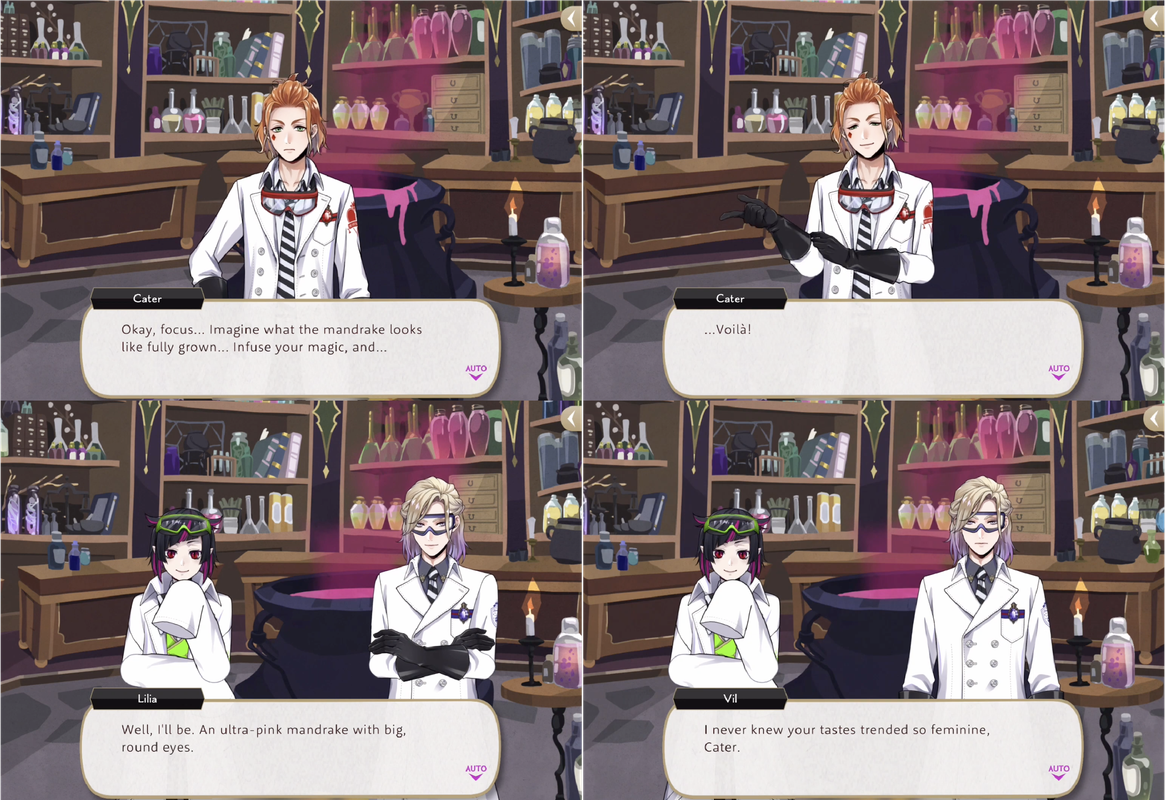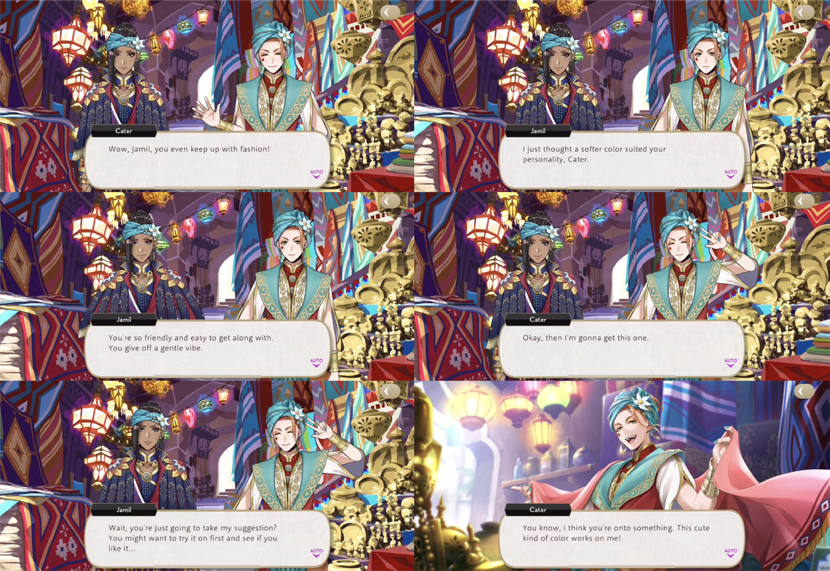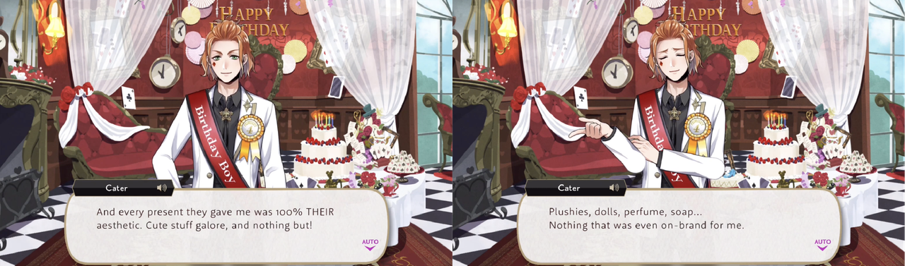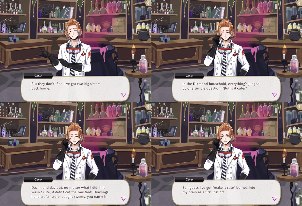 Vil says, “I never knew your tastes trended so feminine, Cater,” and Cater insists that he does not actually have such “feminine” tastes at all, but because of his sisters, “In the Diamond household, everything’s judged by one simple question: ‘But is it cute?’ Day in and day out, no matter what I did, if it wasn’t cute, it didn’t cut the mustard! Drawings, handicrafts, store-bought sweets, you name it! So I guess l’ve got ‘make it cute’ burned into my brain as a first instinct.”