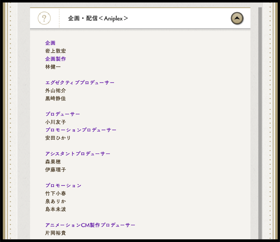 Production Producers: Kataoka Hiroki (Aniplex), Ogawa Tomoko (Aniplex), Mori Kaho (Aniplex)