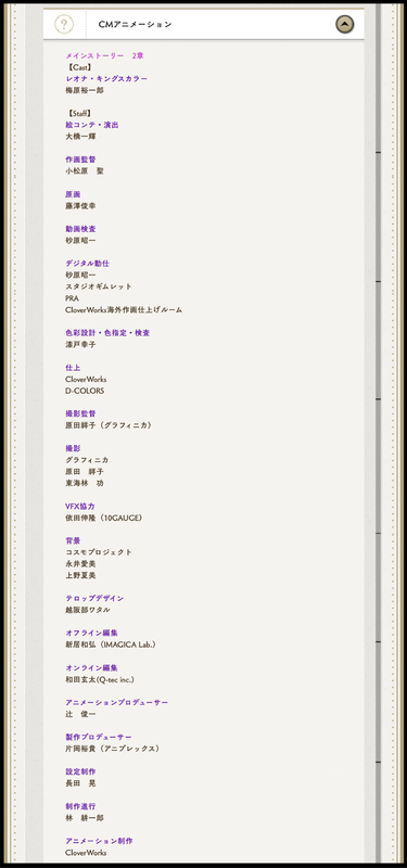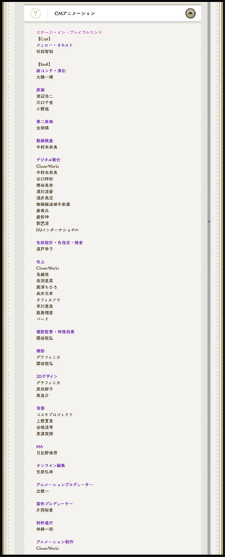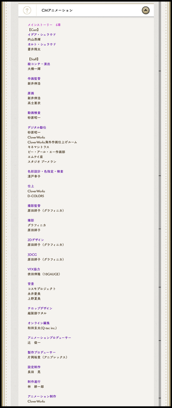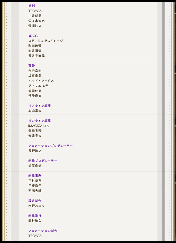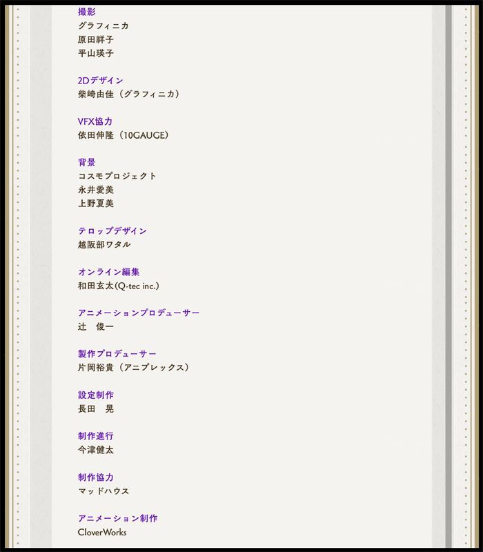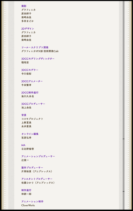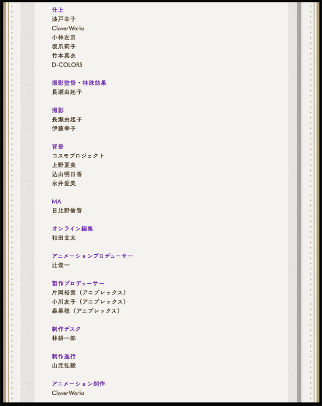 Finishing: CloverWorks Finishing Department, Torigoe Shiori, Tsuji Momoka, Fast Snail Studio, D-COLORS, Office Fuu
