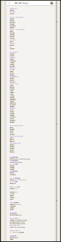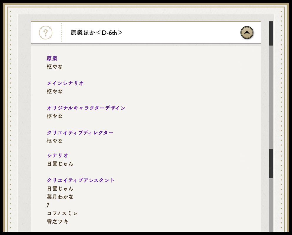 Creative Assistants: Hioki Jun, Hazuki Wakana, 7, Kowono Sumire, Sorano Tsuki
