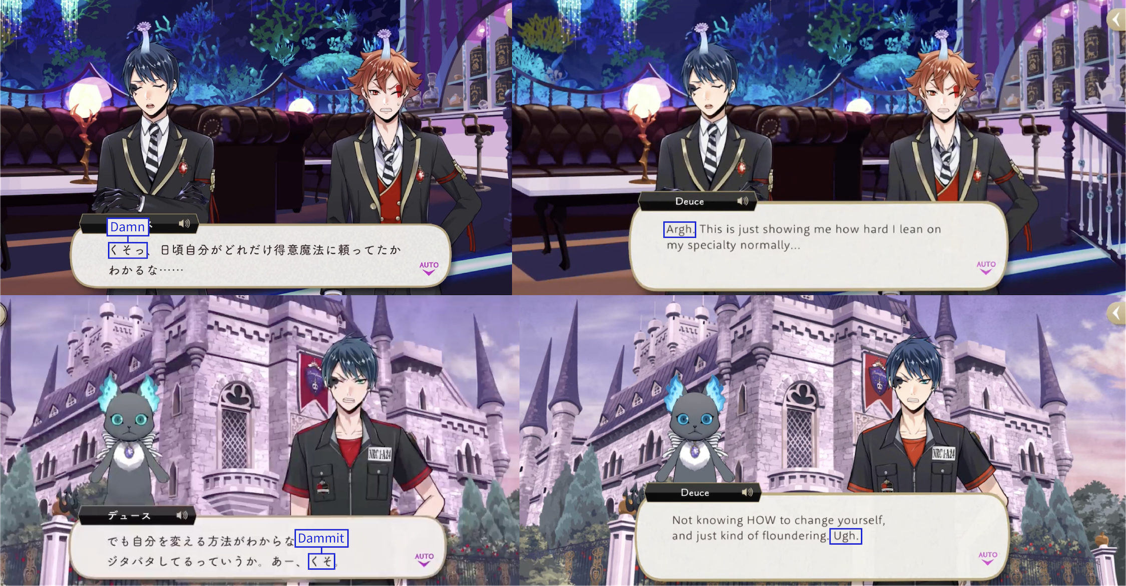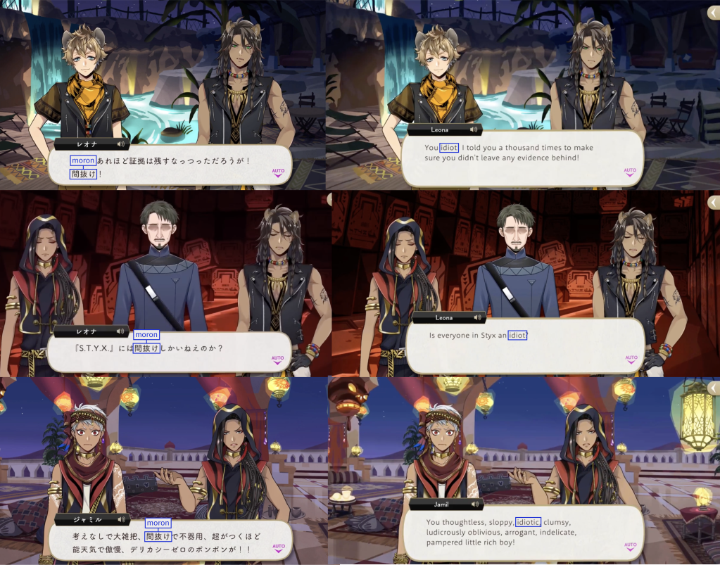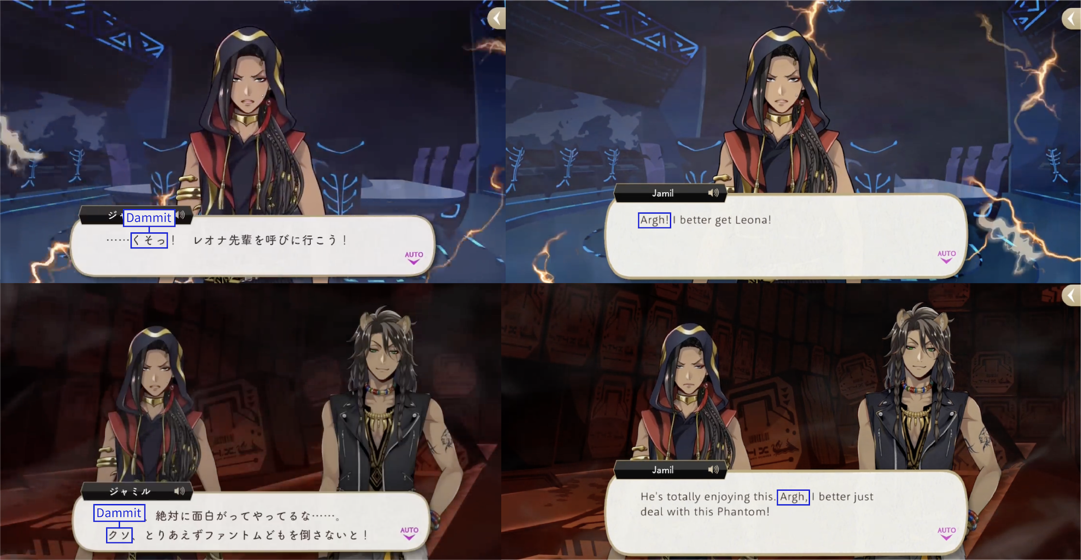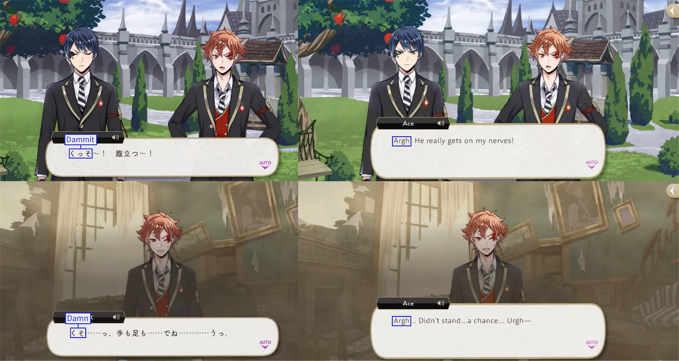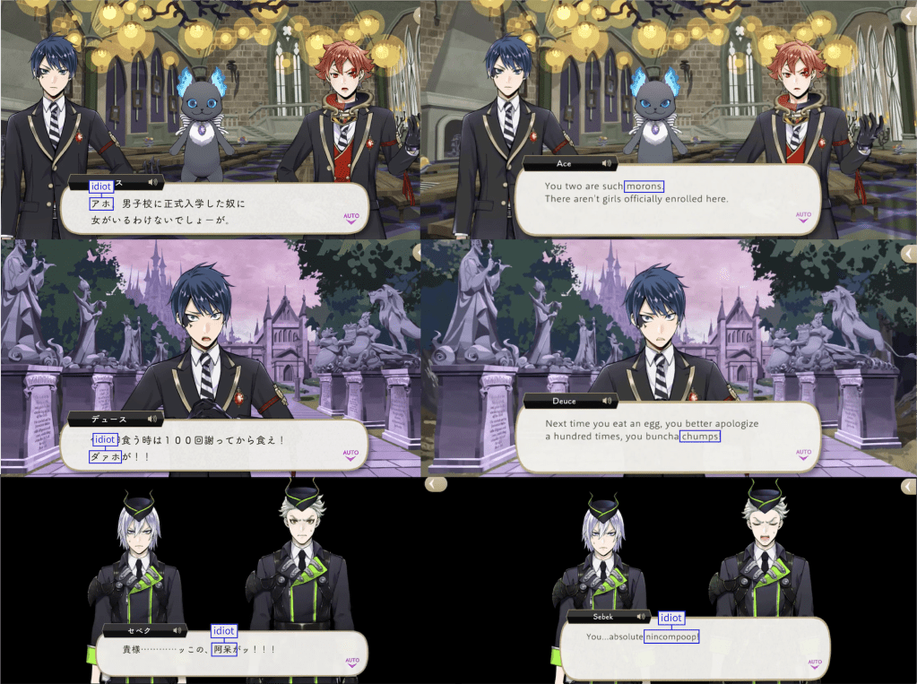 Note: These localizations are not literal translations (“くそ” does not literally mean “to damn something,” for example), and are more so examples of what the characters might be saying if they were speaking American English.