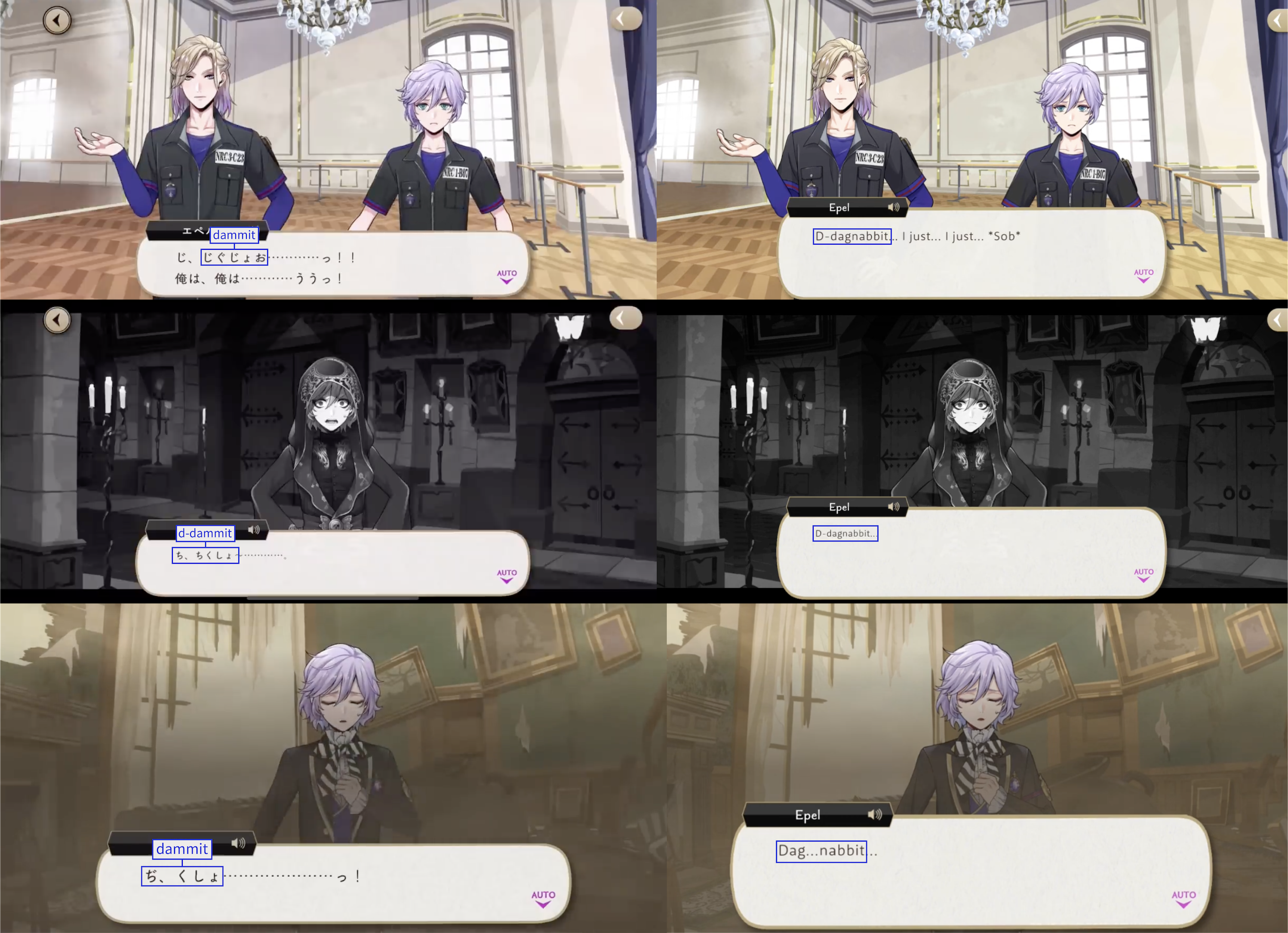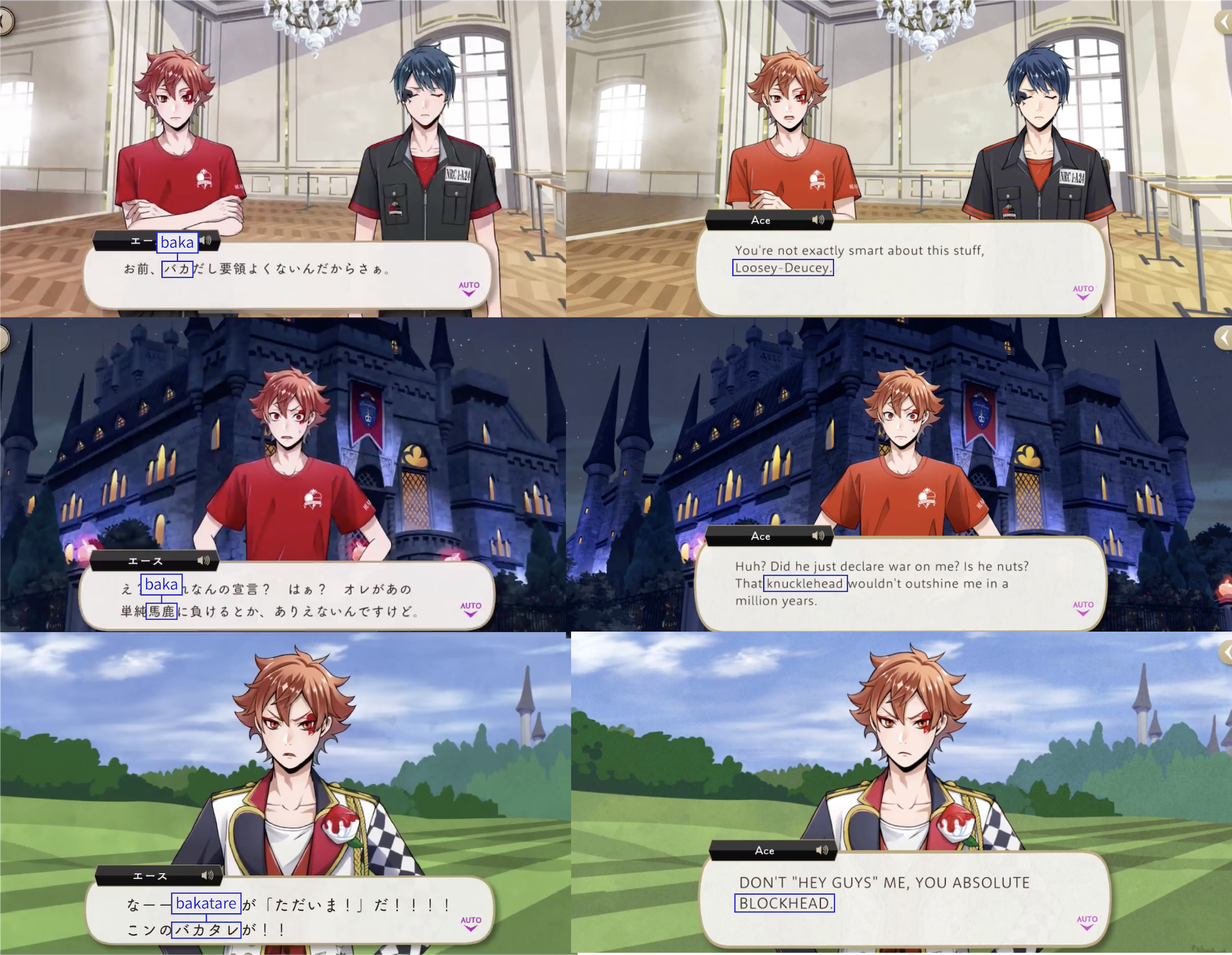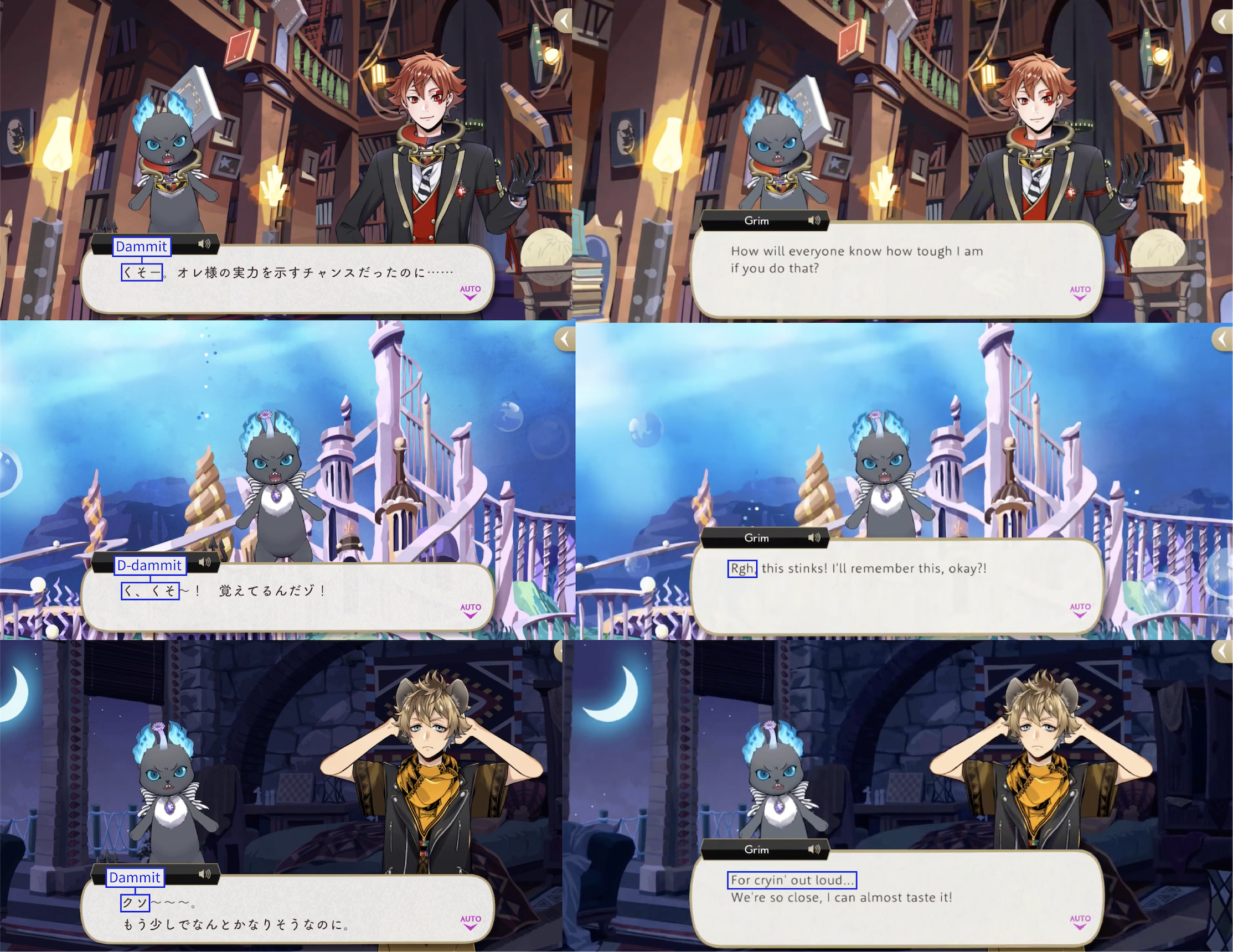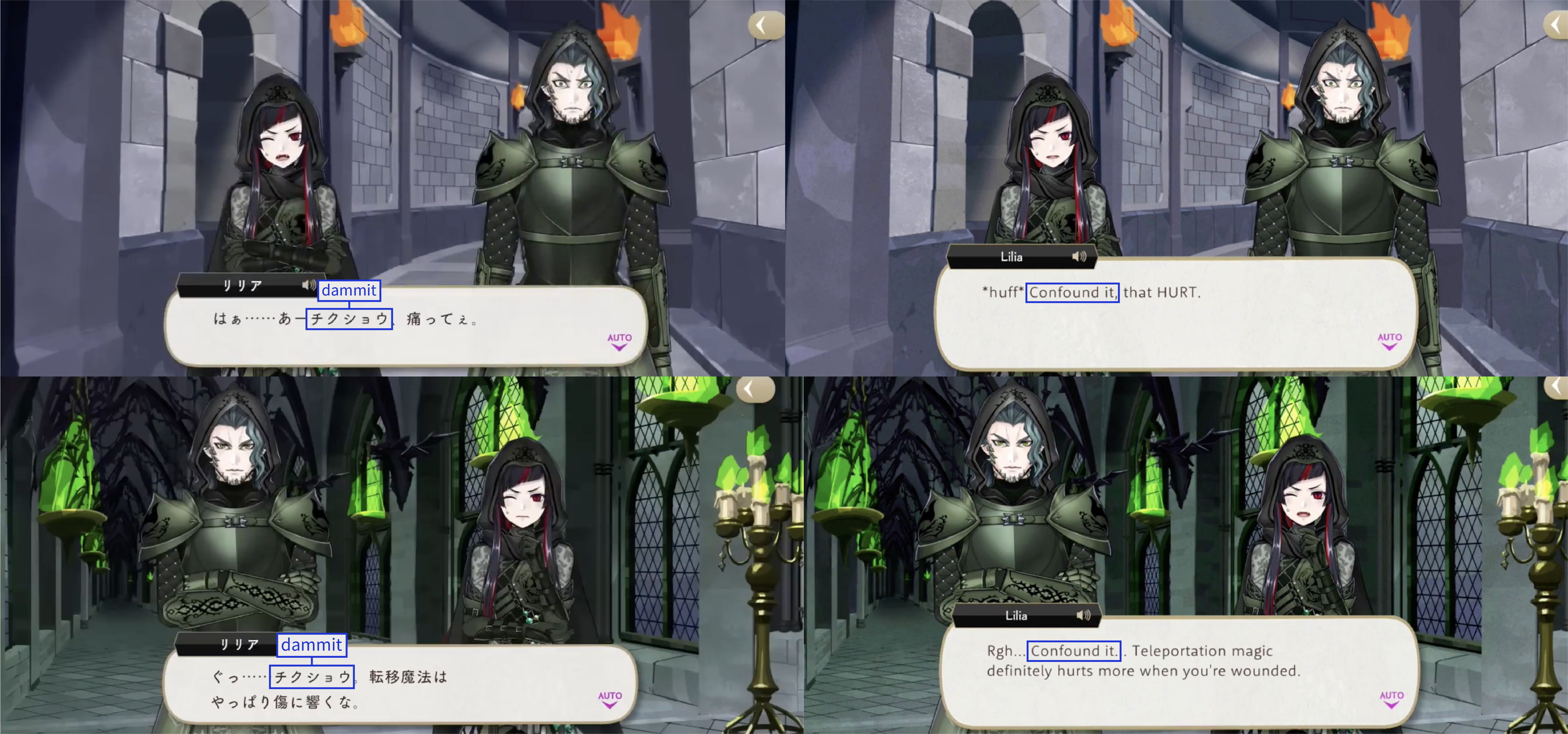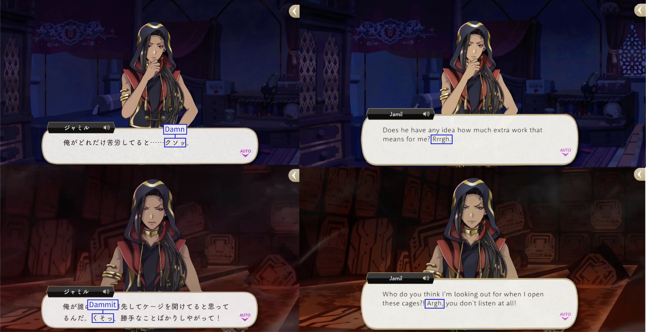 Note: These localizations are not literal translations (“くそ” does not literally mean “to damn something,” for example), and are more so examples of what the characters might be saying if they were speaking American English.