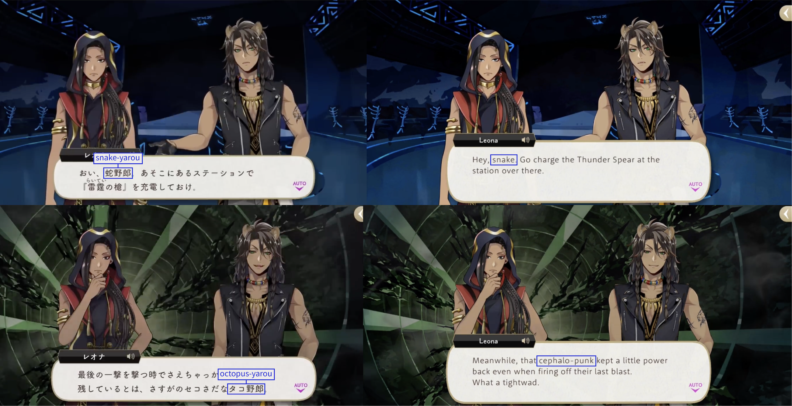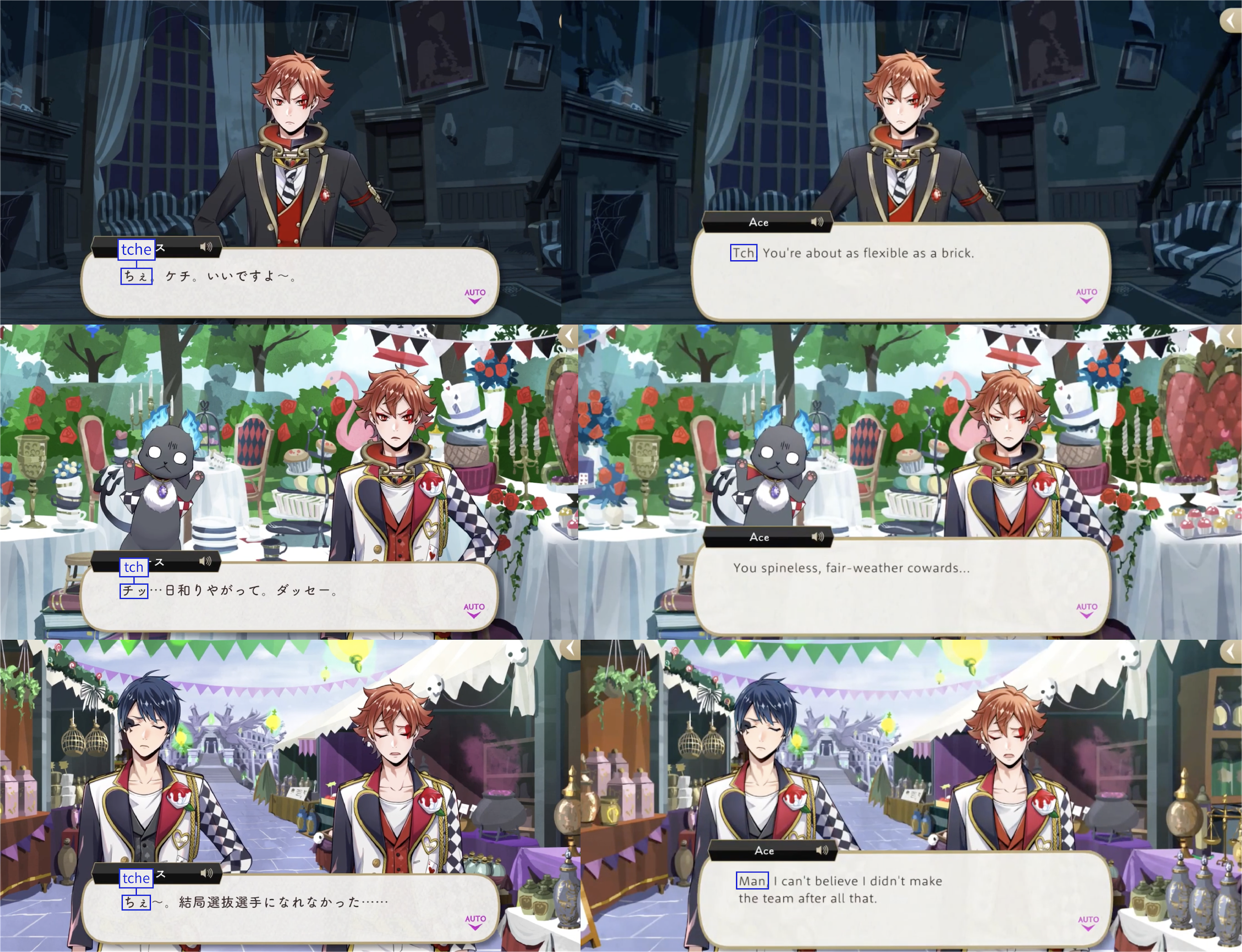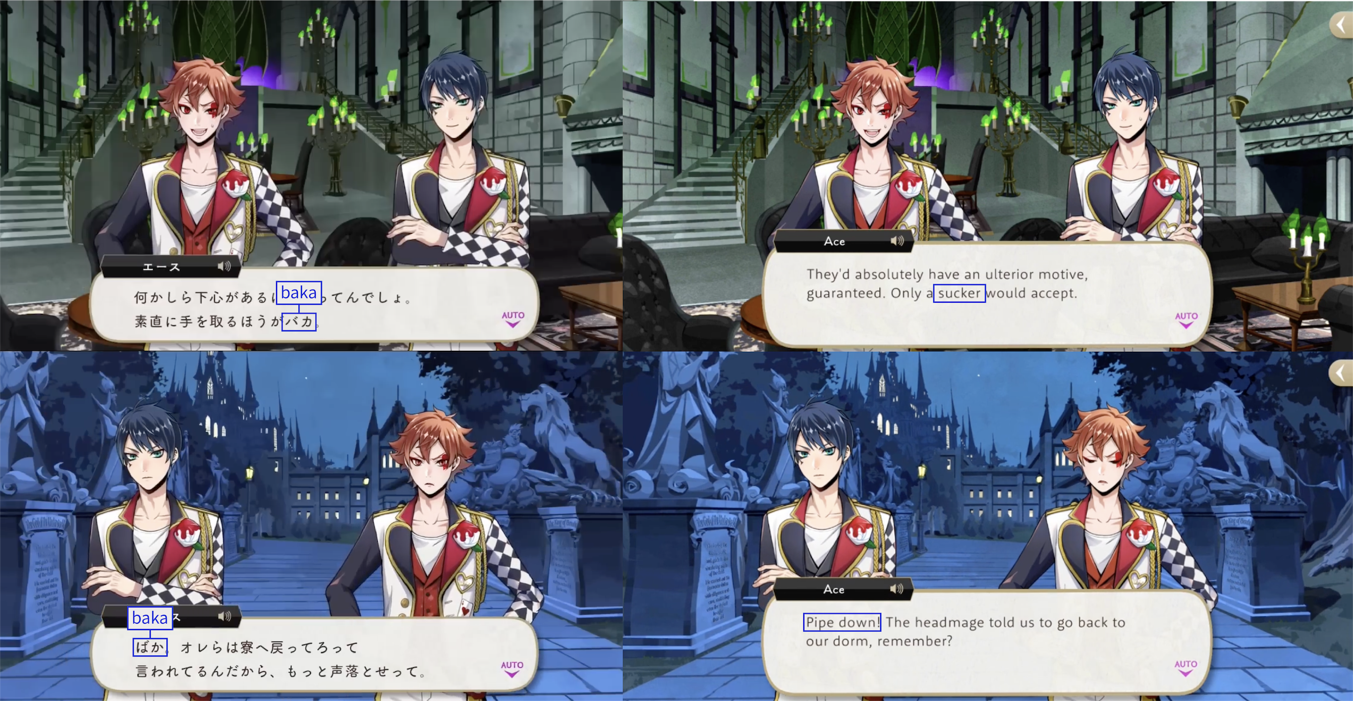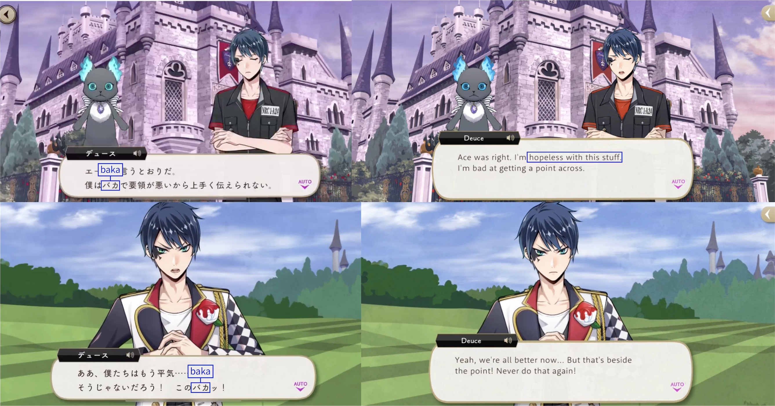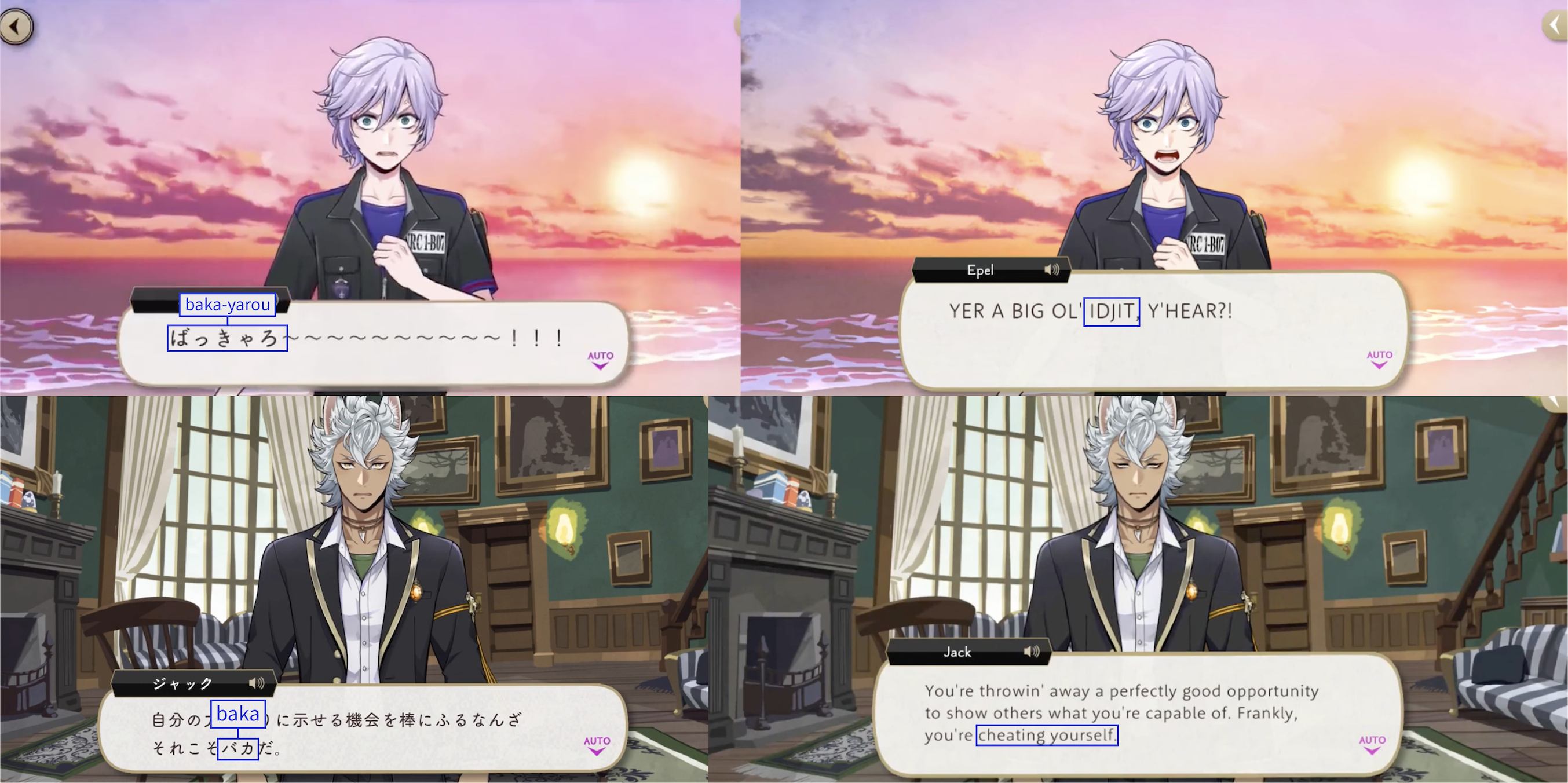 Note: These localizations are not literal translations (“くそ” does not literally mean “to damn something,” for example), and are more so examples of what the characters might be saying if they were speaking American English.