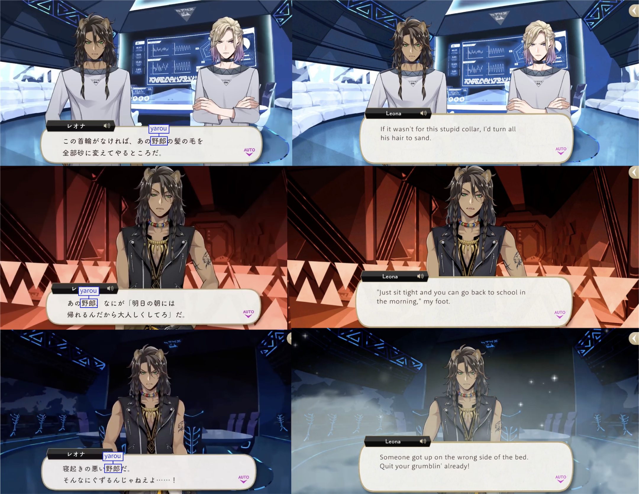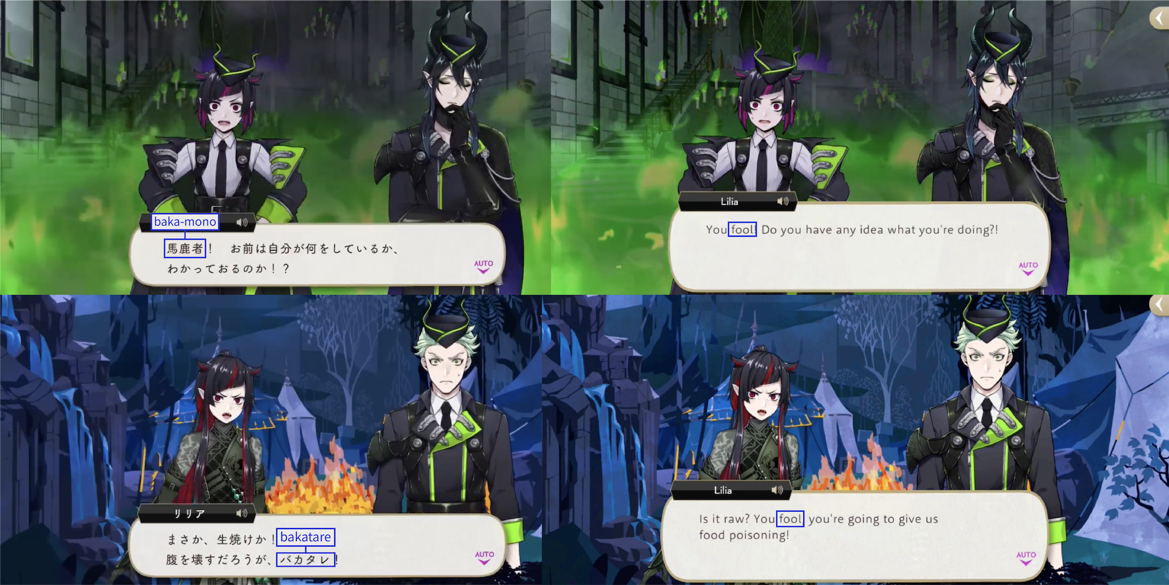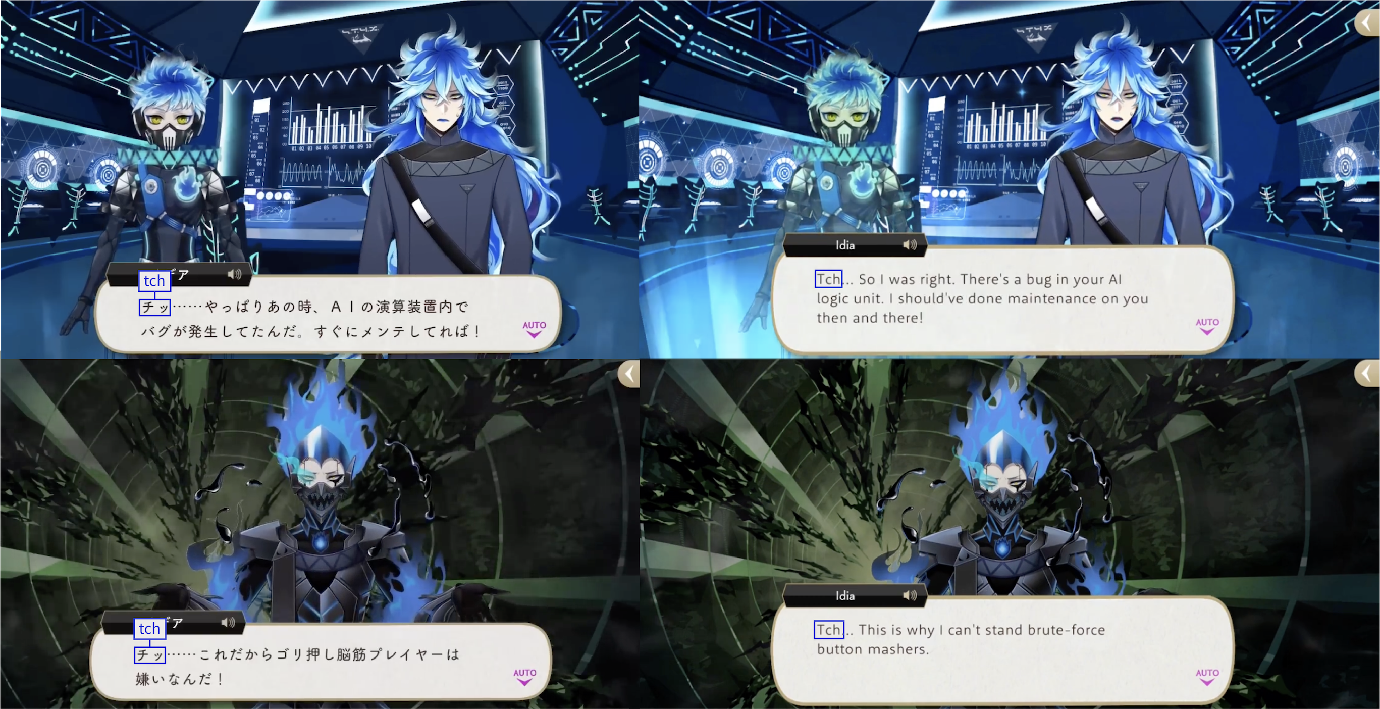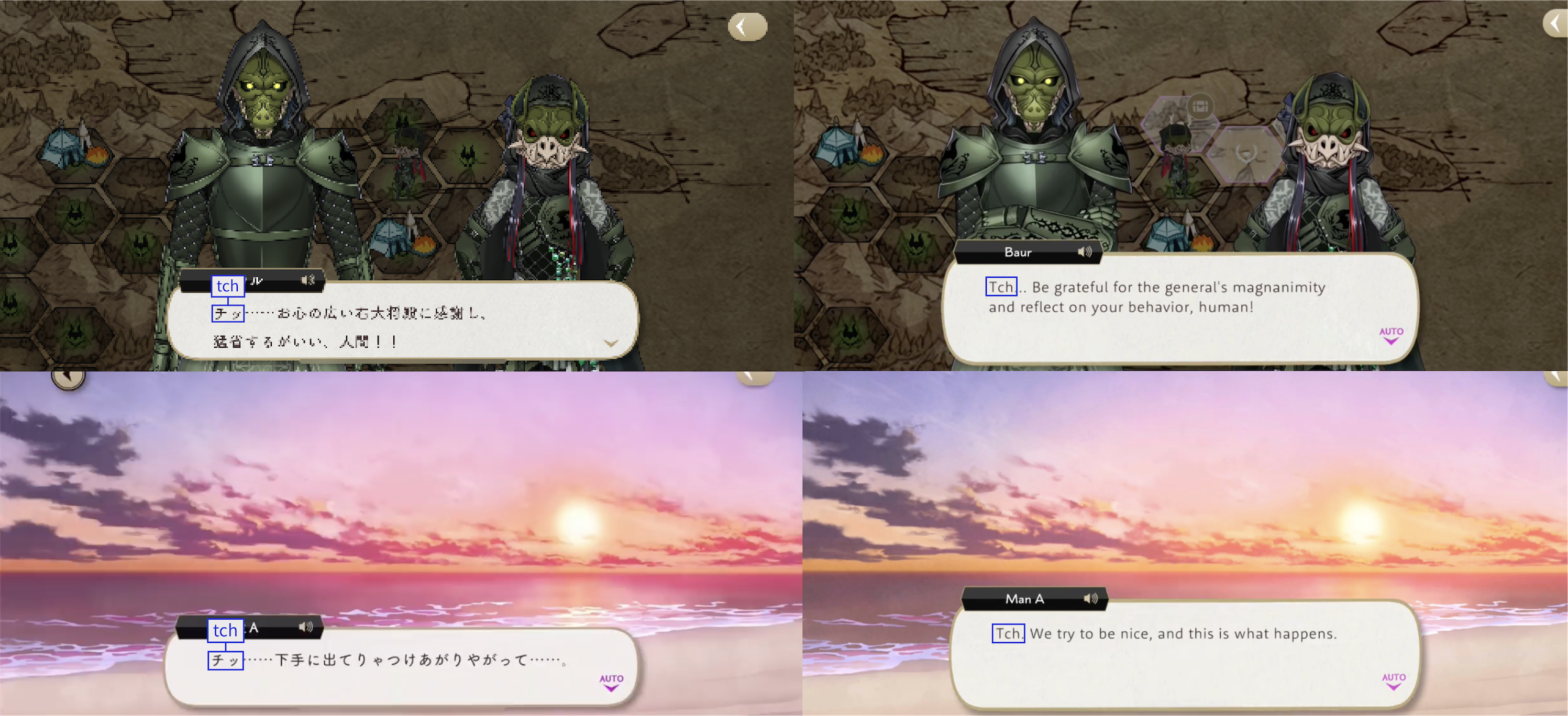 Note: These localizations are not literal translations (“くそ” does not literally mean “to damn something,” for example), and are more so examples of what the characters might be saying if they were speaking American English.