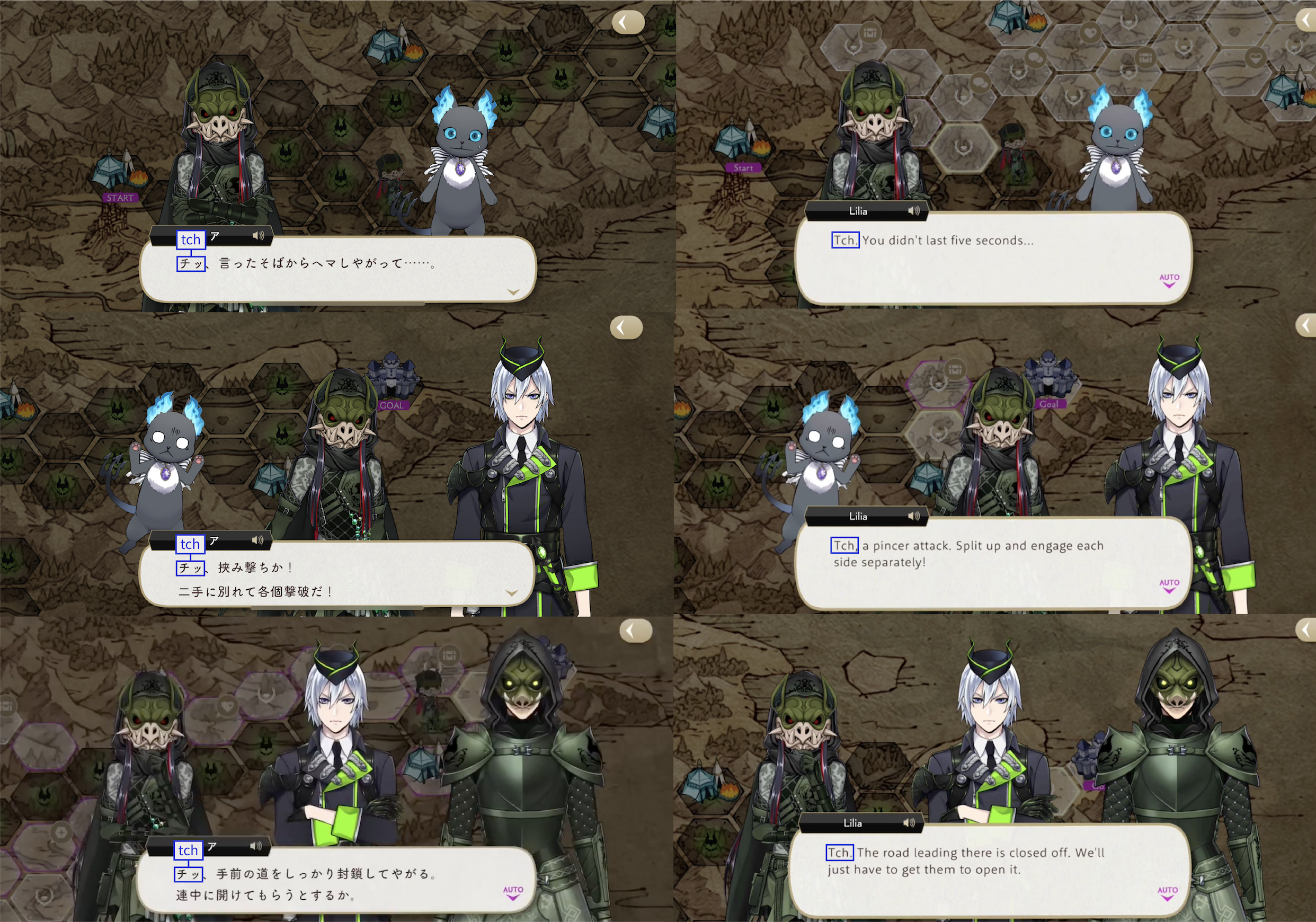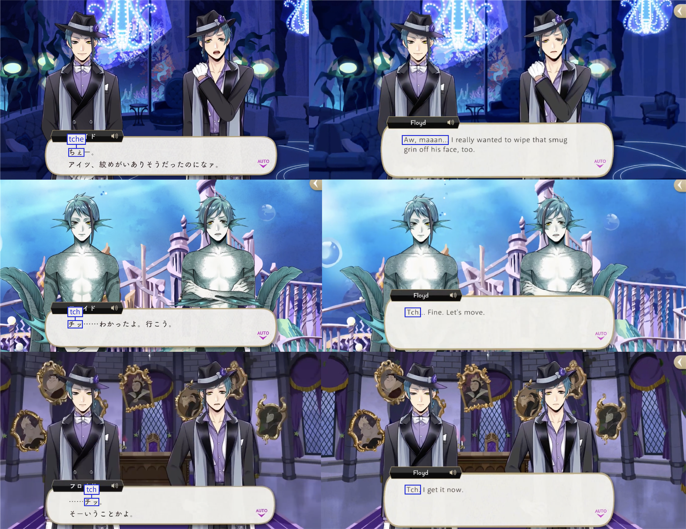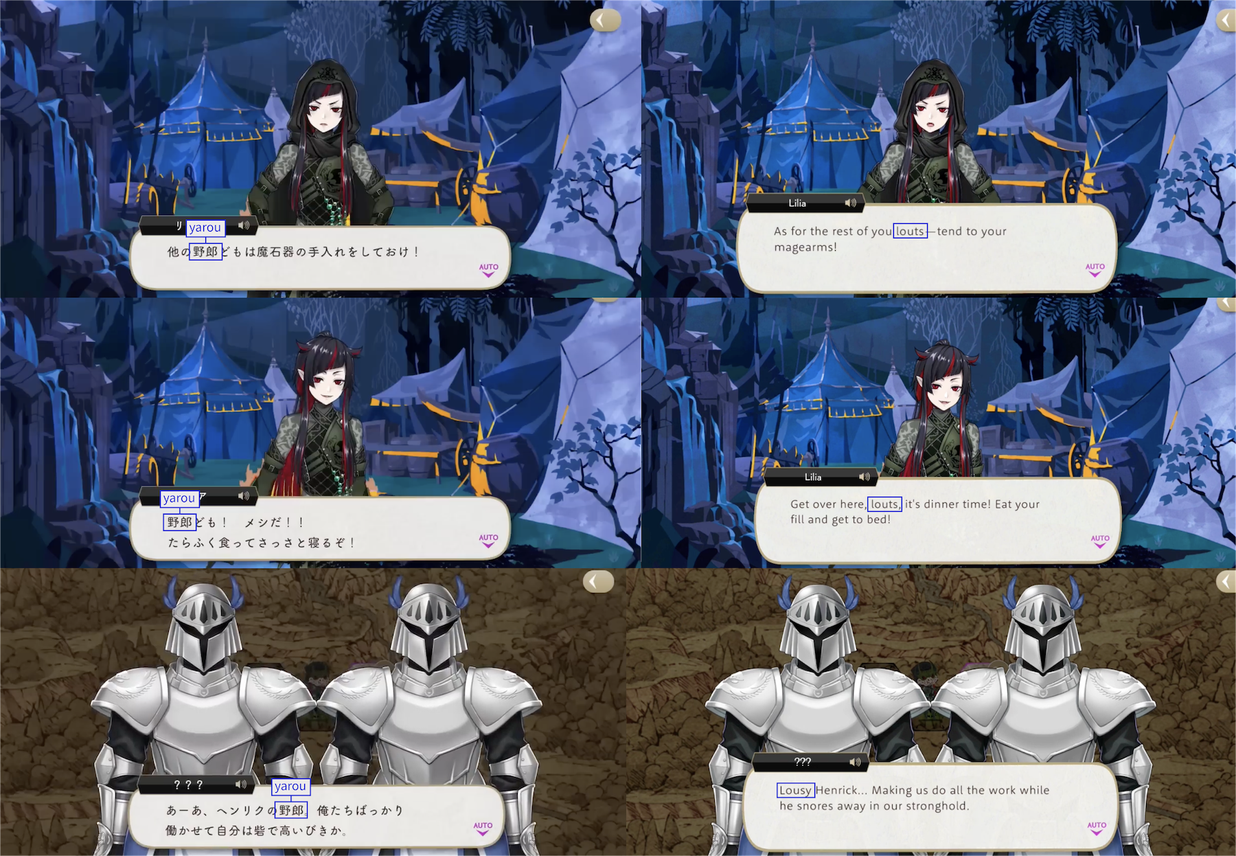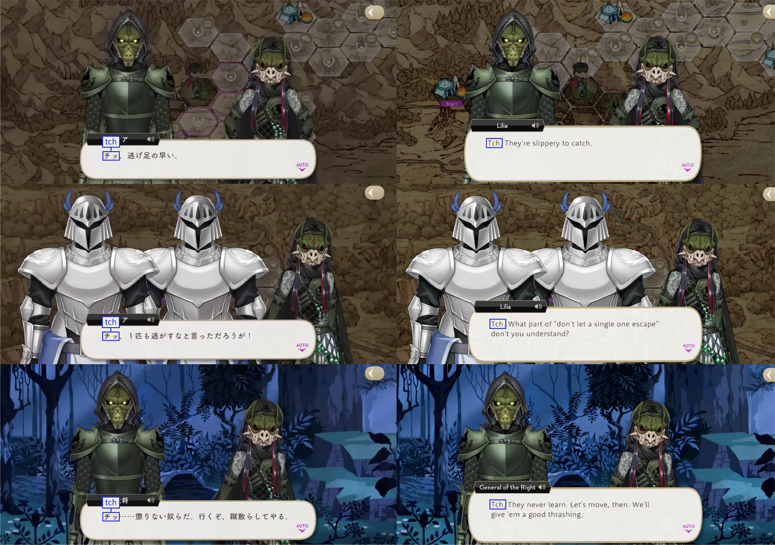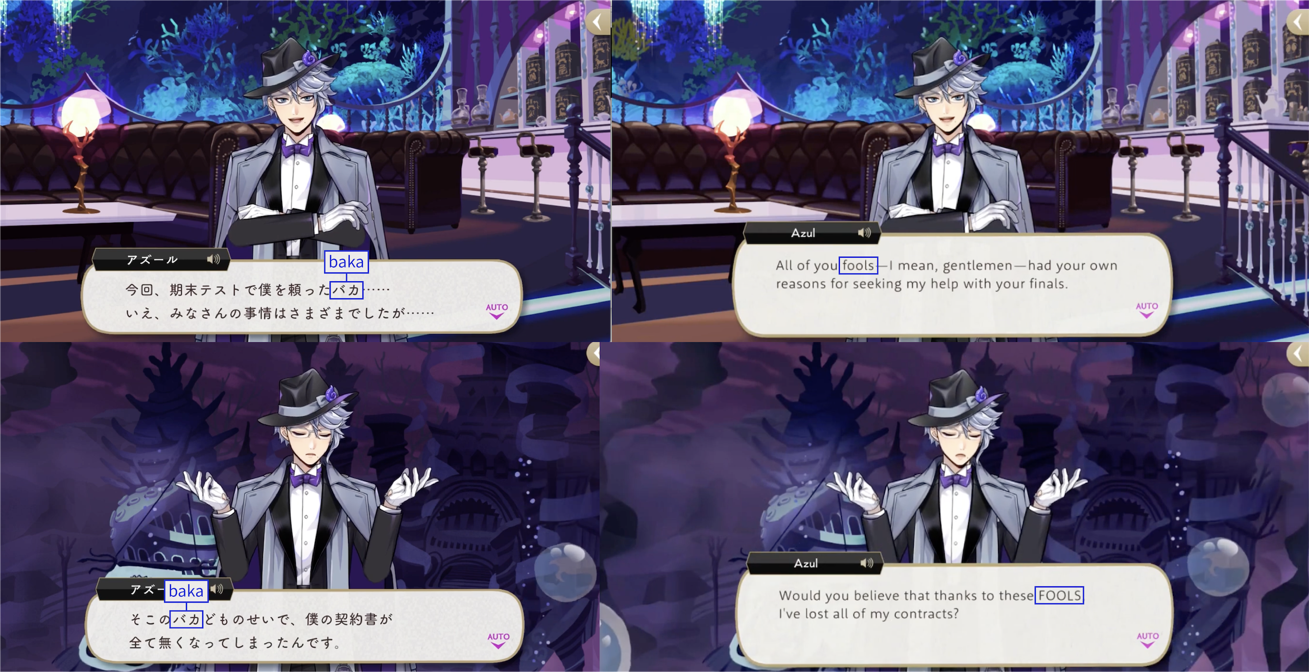 Note: These localizations are not literal translations (“くそ” does not literally mean “to damn something,” for example), and are more so examples of what the characters might be saying if they were speaking American English.