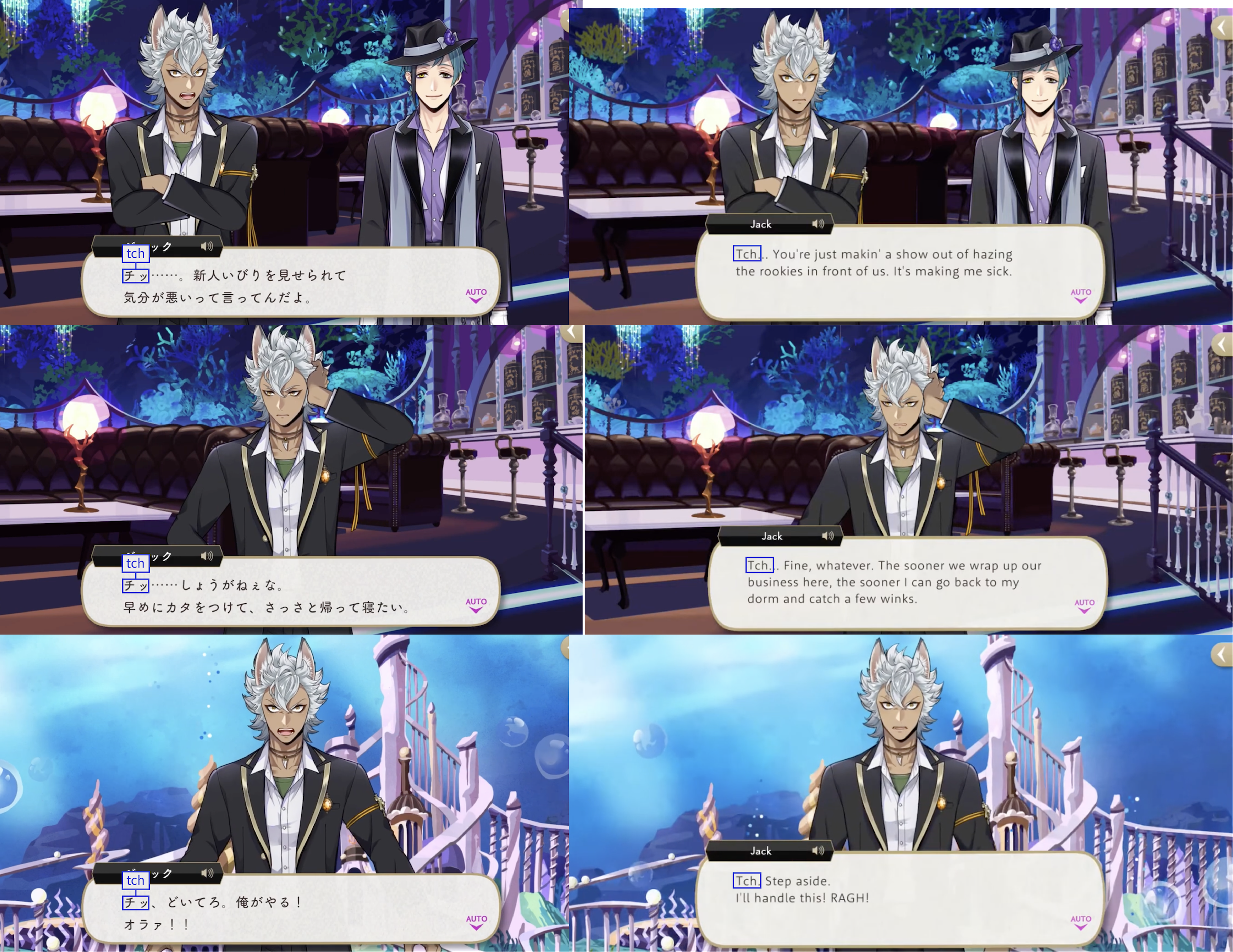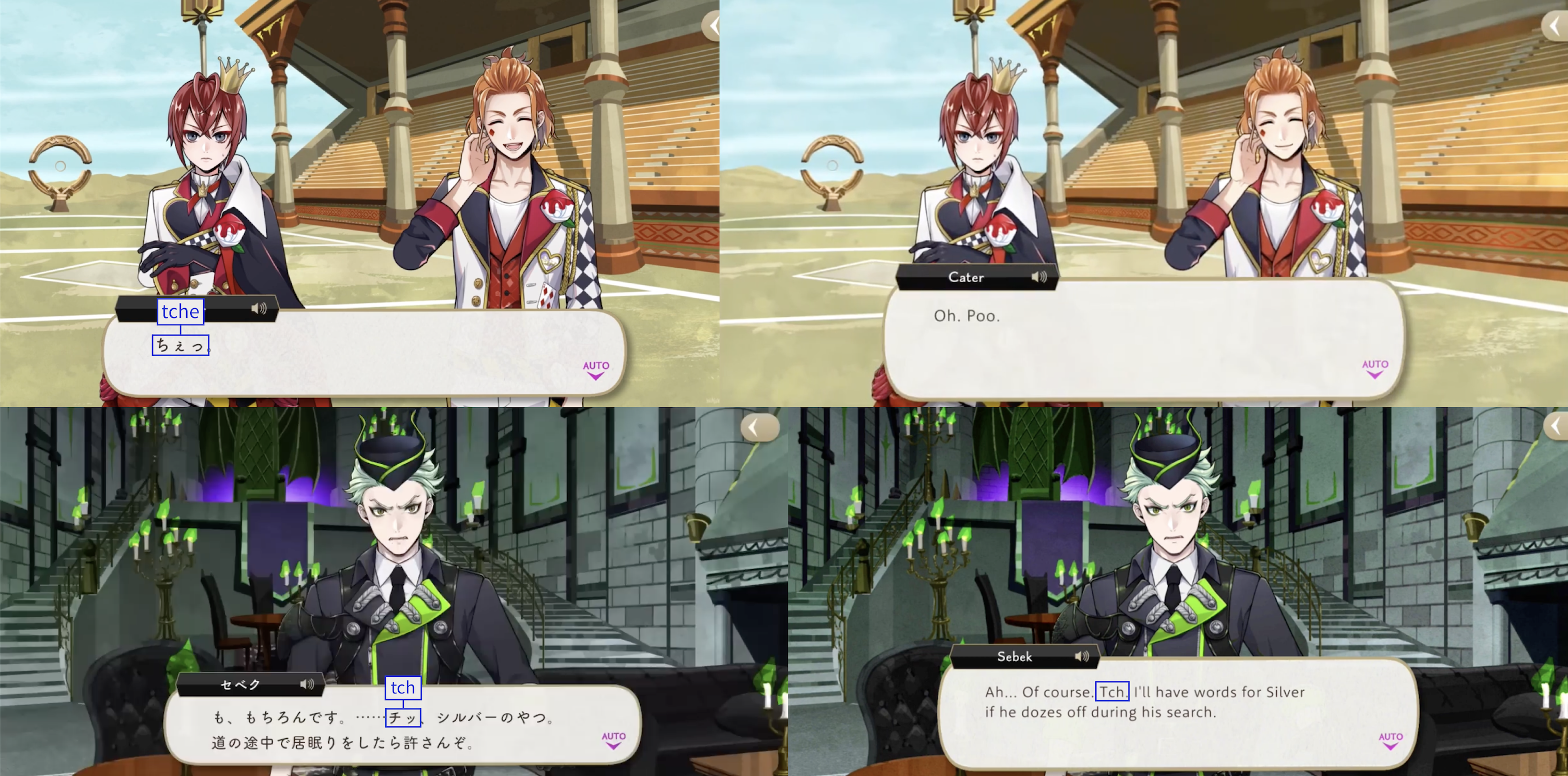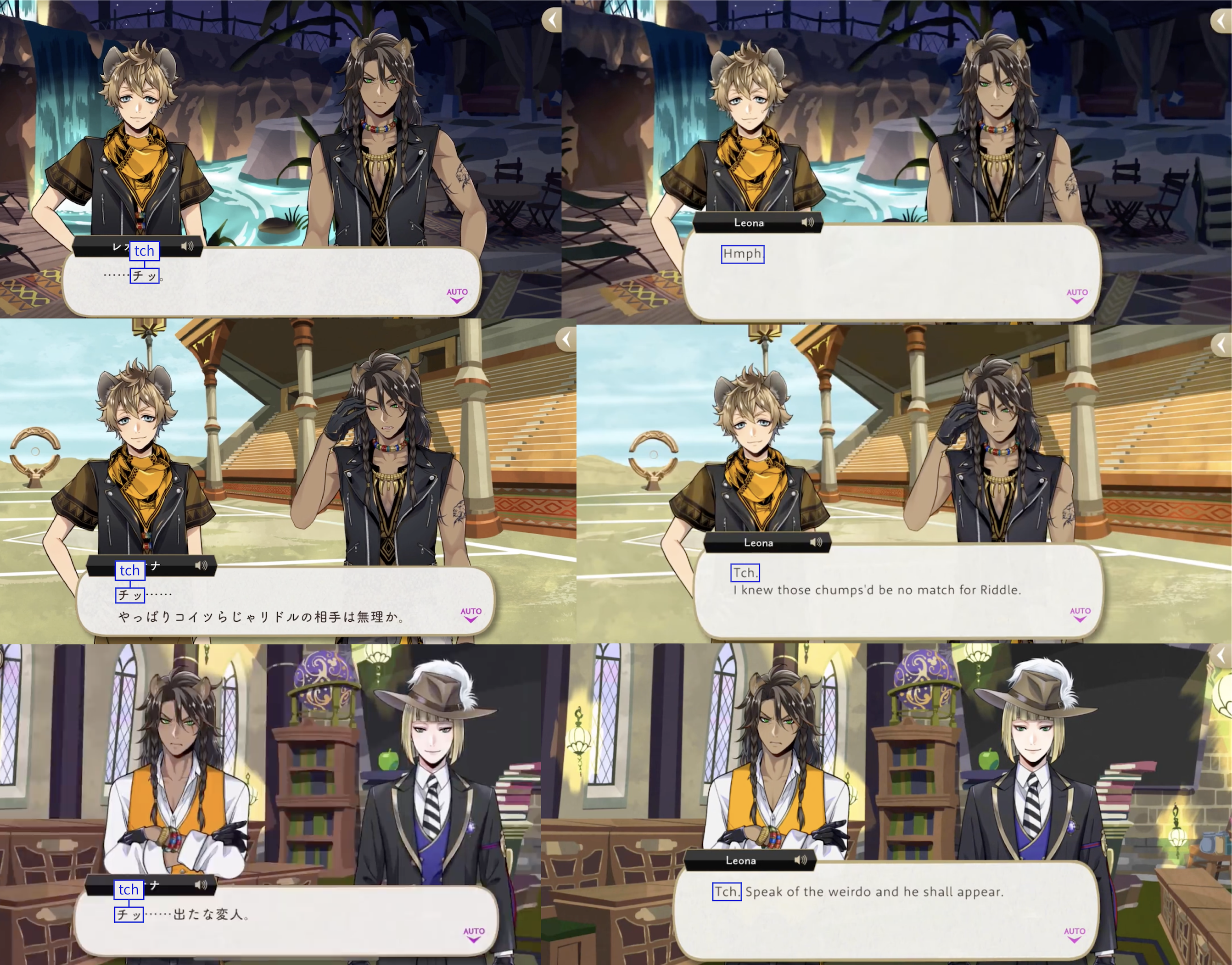 Leona is the #1 user of this sound. It was initially changed to sounds like “ugh” and “hmph” in Leona’s EN-dialogue until the middle of Book 2, when it started to be written literally. While less rude, this ranking has also counted the more childish/playful version ちぇ (tche), said by characters like Kalim and Ace.