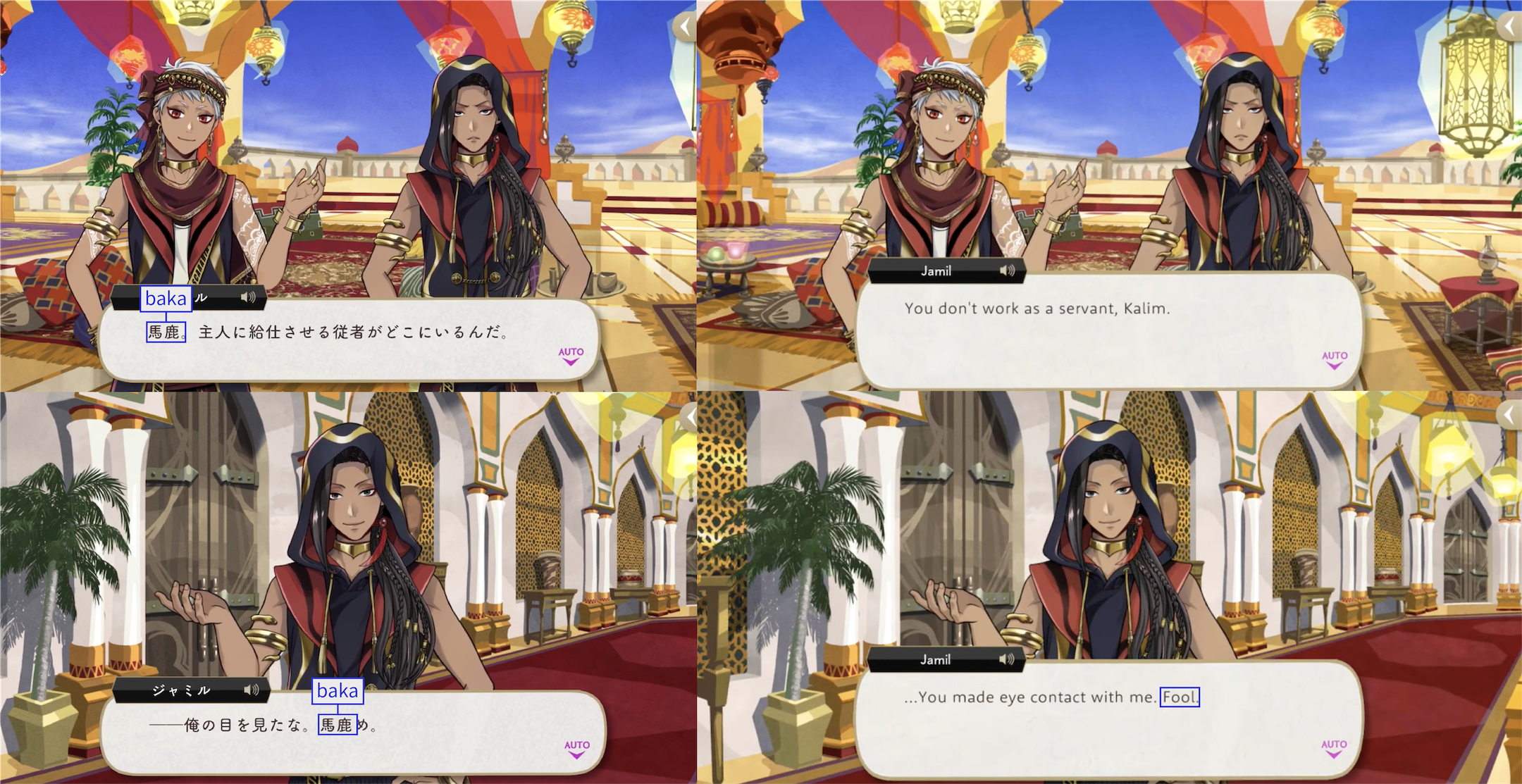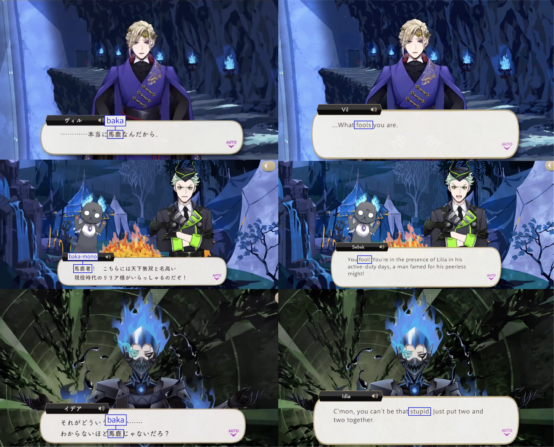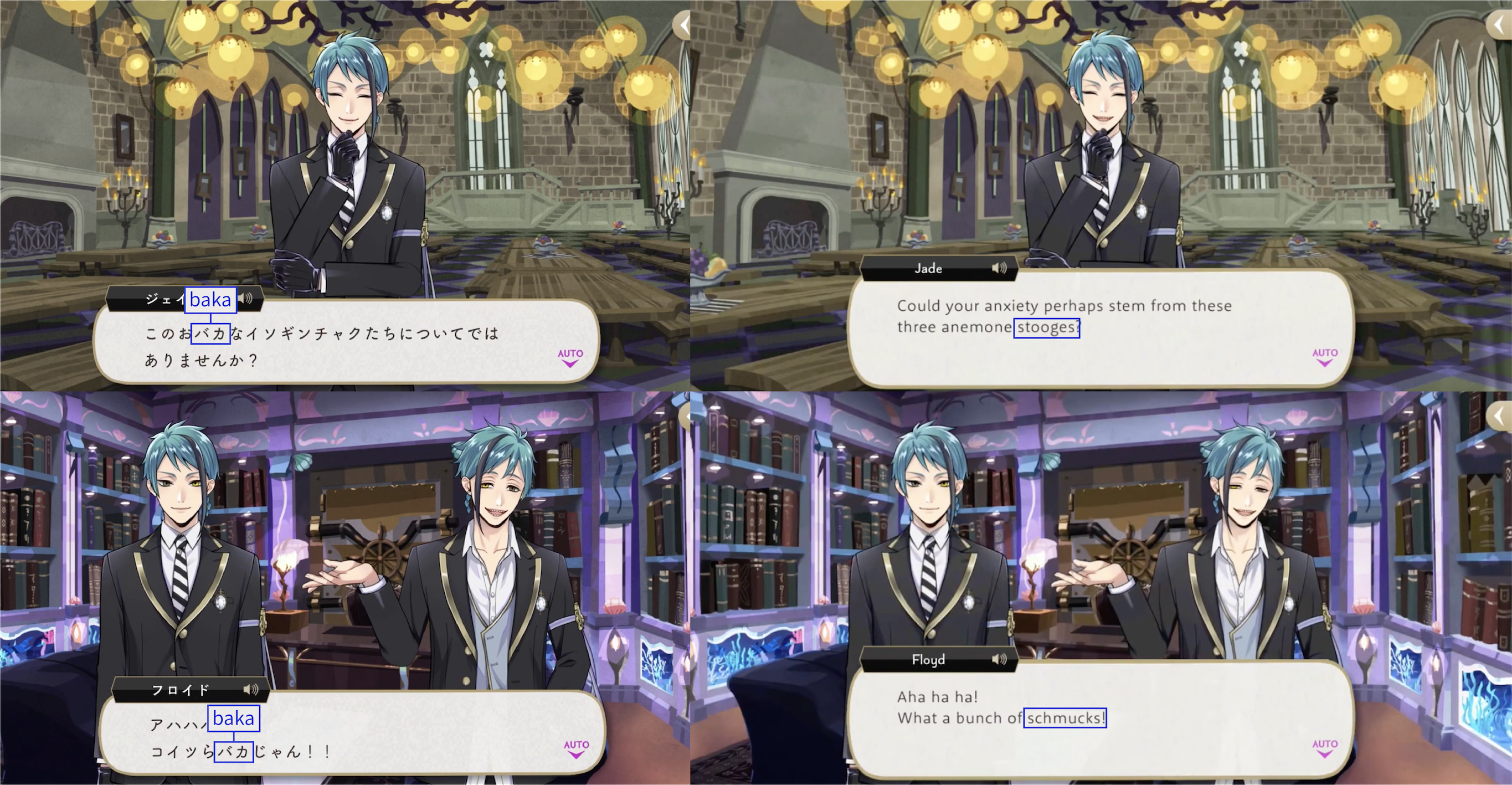 EN localization: “Are you payin’ attention?,” “Are ya braindead?,” chump, “Are you kidding?,” “hah,” dimwit, chump, Loosey-Deucey, knucklehead, blockhead, sucker, “pipe down,” fool, hopeless, stooges, schmucks, idjit, “cheating yourself,” stupid, nincompoop.