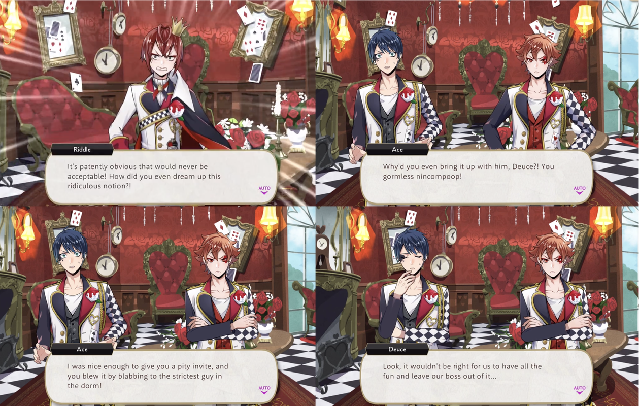 (Deuce: “it wouldn’t be right for us to have all the fun and leave our boss out of it…” – Trey: “To think our dorm has students willing to actively plan on skipping school AND invite Riddle along for it…”)