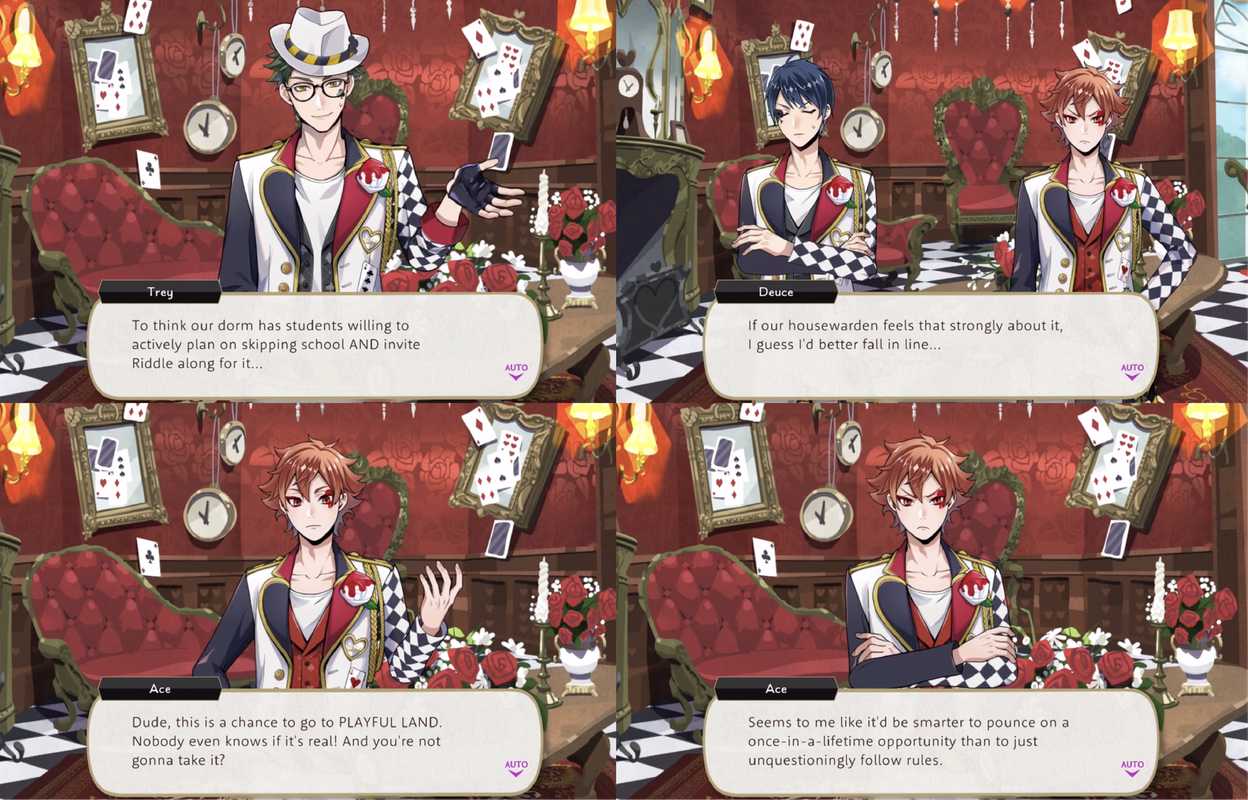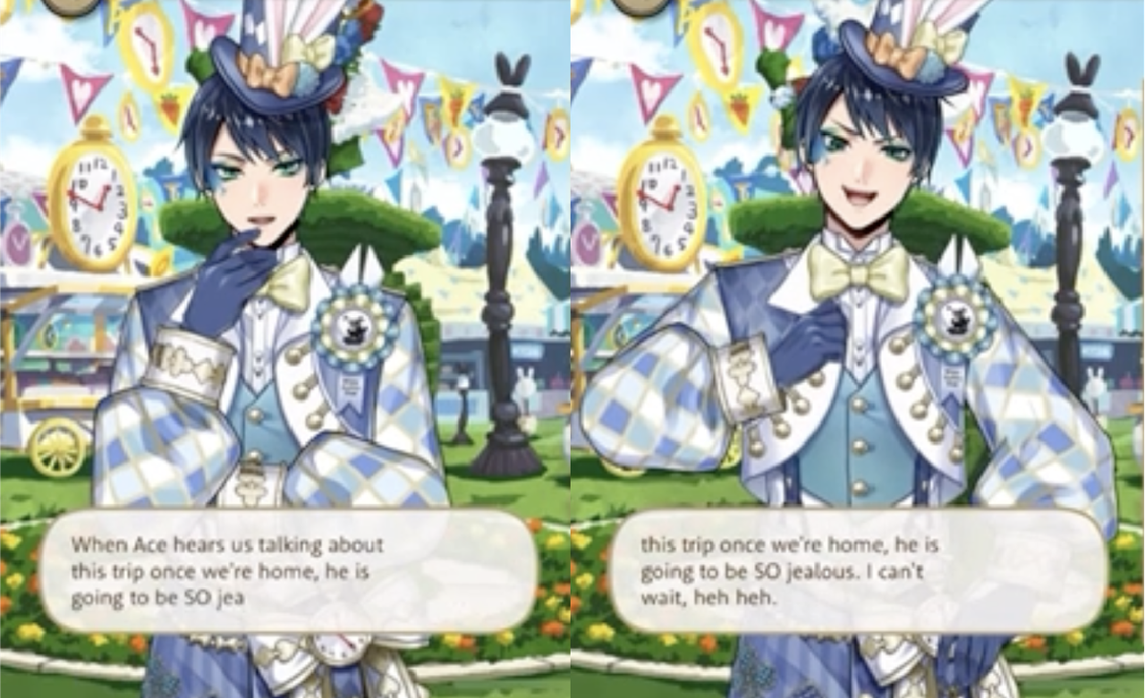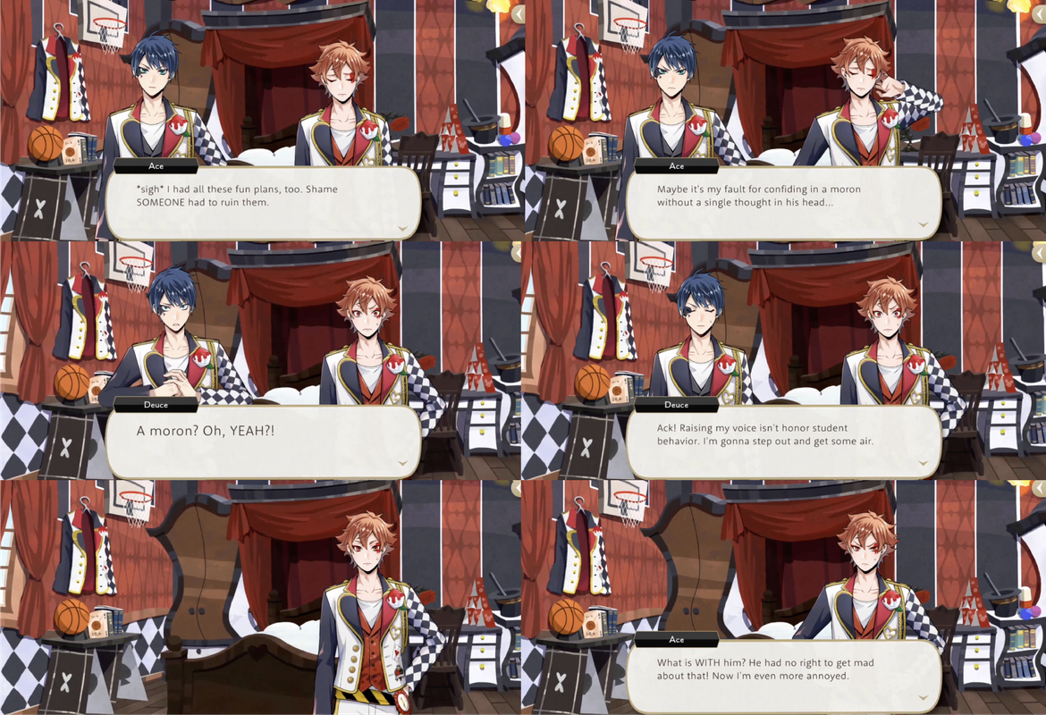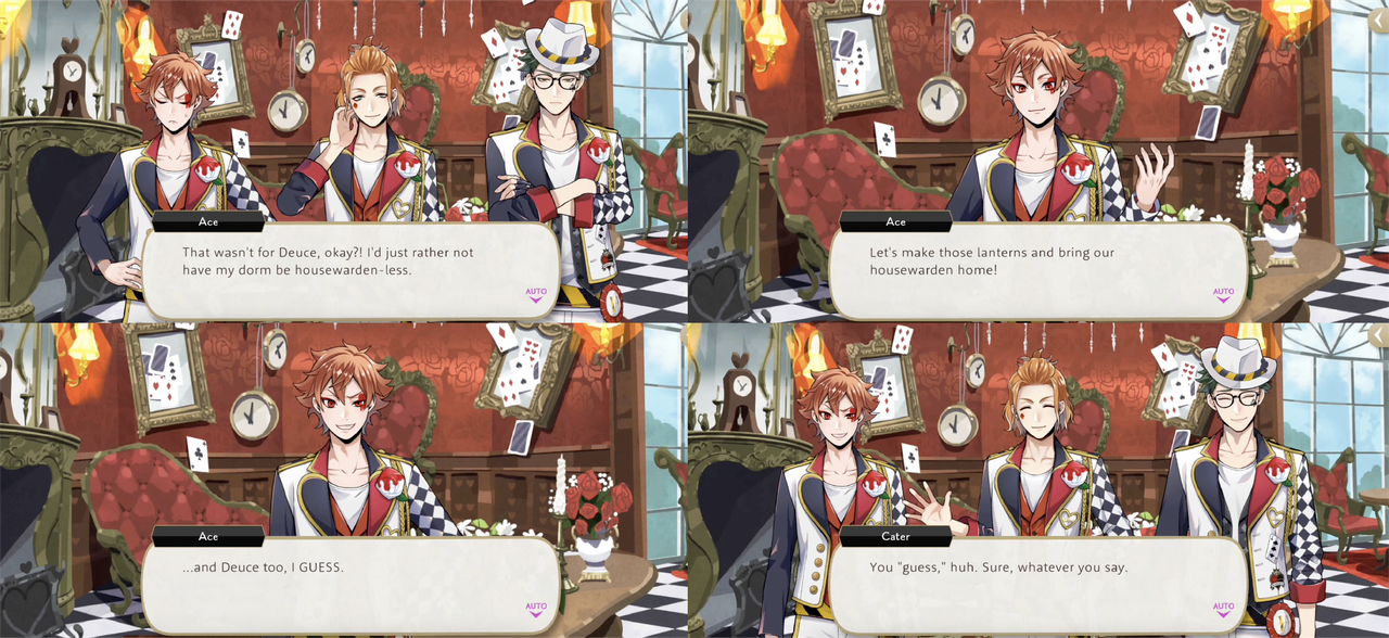 Trey and Cater try to convince the rest of Heartslabyul that they need to help Riddle and Deuce get out of the library where they become trapped during the lantern event and Ace says, “Having Deuce gone would be like a breath of fresh air, if you ask me,” but Cater does not seem convinced, pointing out that Ace went along with Trey to the library to deliver supplies to aid in their escape.