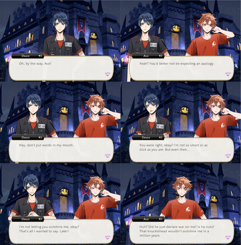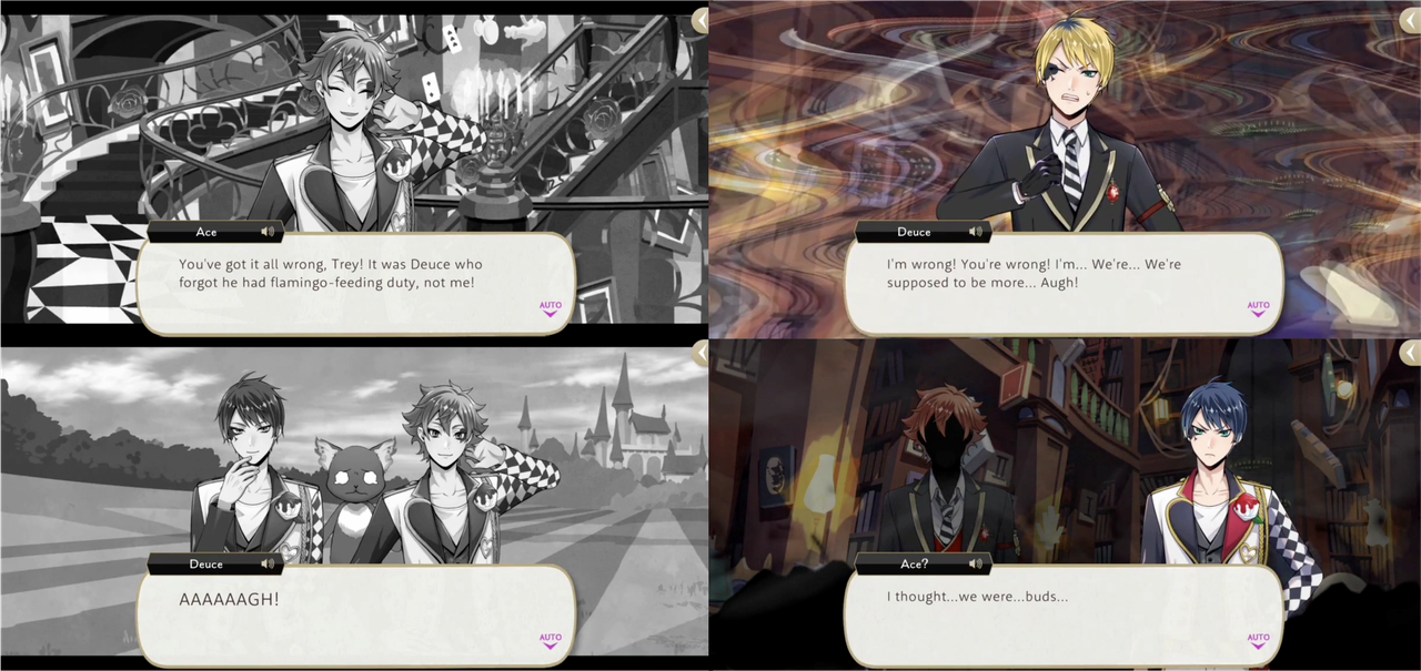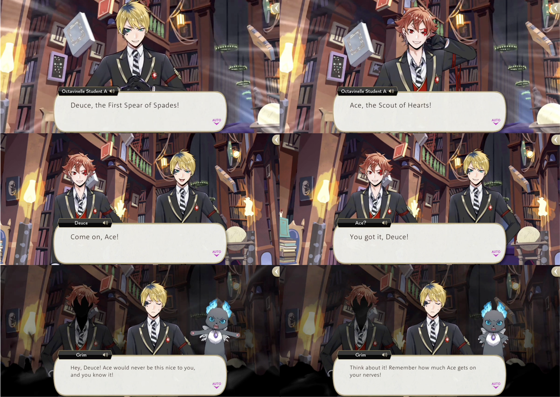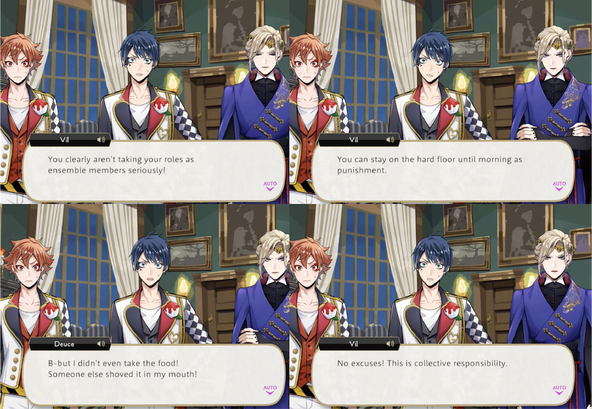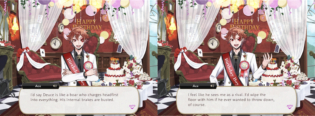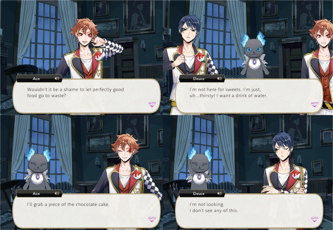 When Ace begins eating chocolate cake (against Vil’s orders) Deuce says, “I’m not looking. I don’t see any of this.” Ace shoves apple pie into Deuce’s mouth, making him into a “partner in crime” and Deuce responds, “I can’t let the slice go to waste now that I’ve bitten into it. If it’s just one piece…”