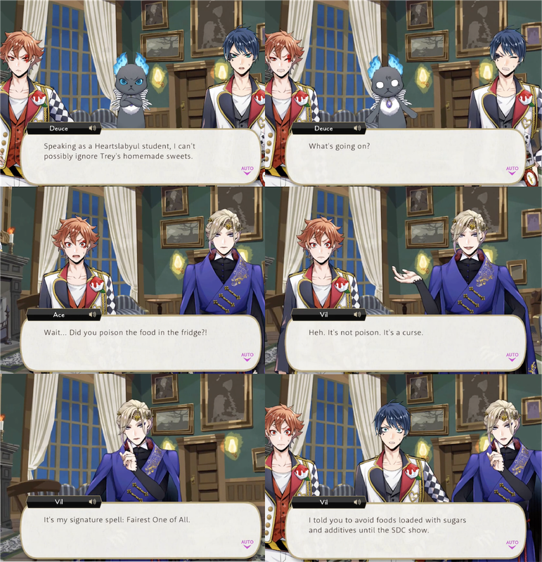 It is then revealed that Vil cursed the treats to immobilize them, with Deuce, Ace and Grim then left paralyzed on the floor in the kitchen together until the following morning.
