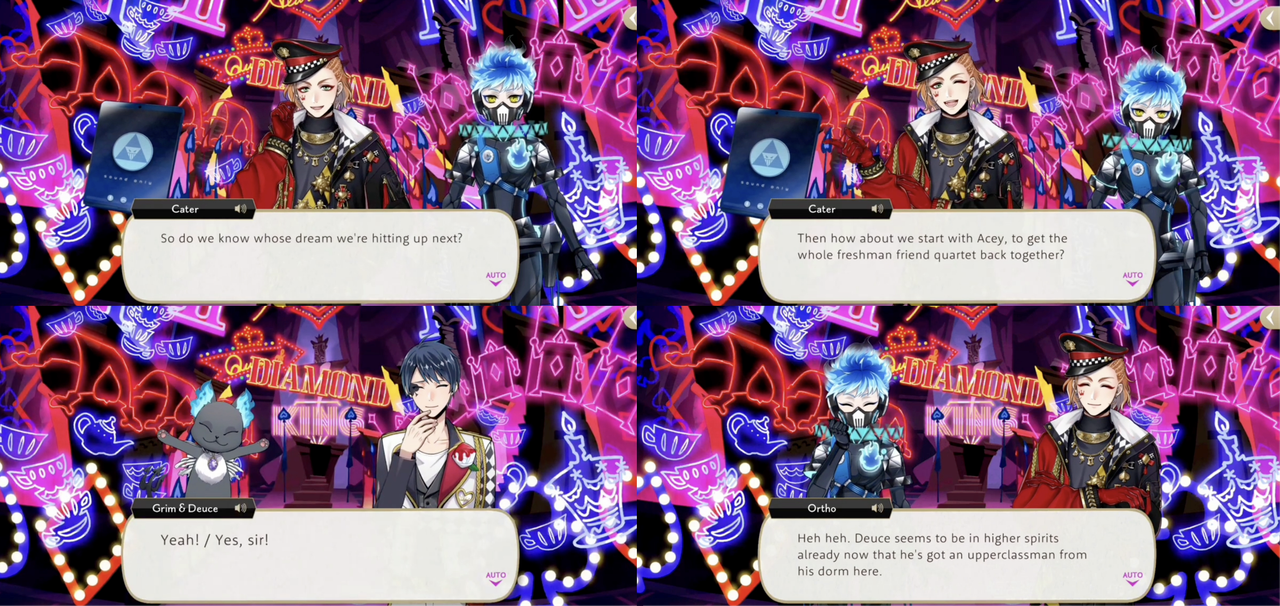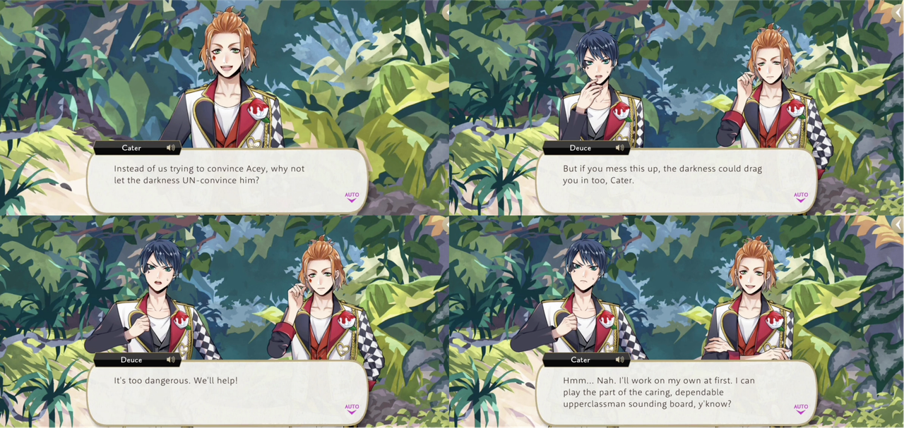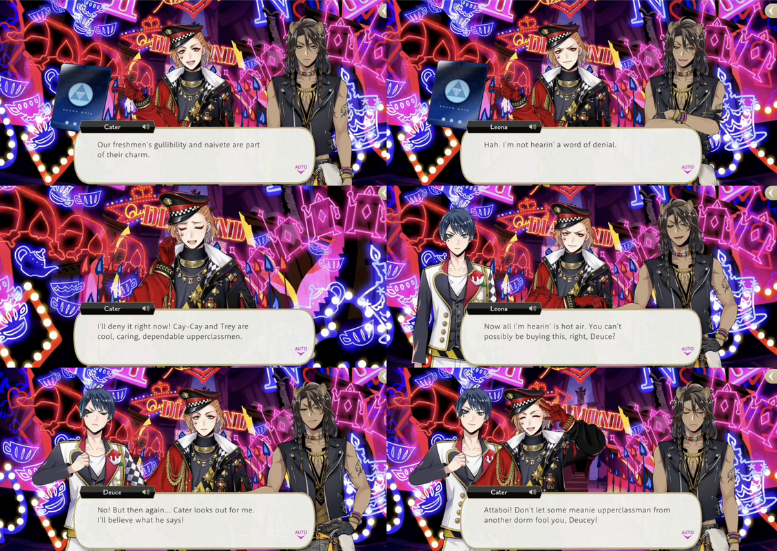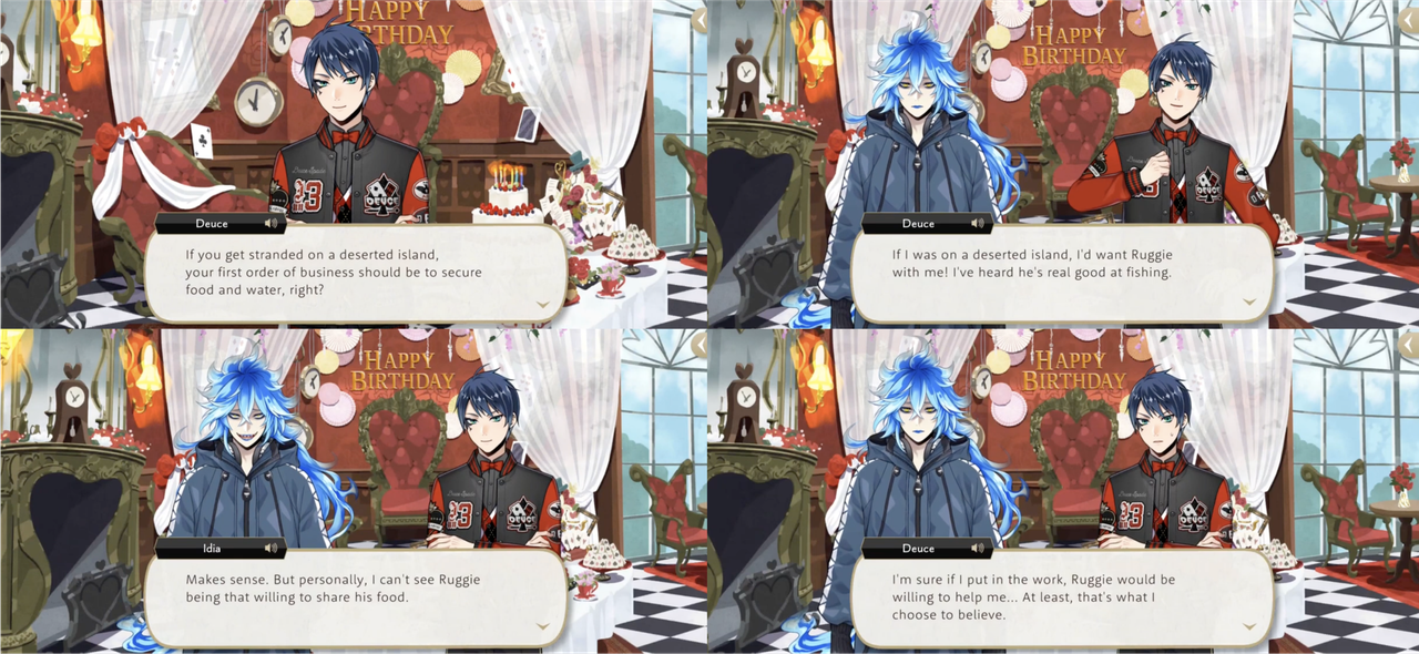 When Leona asks if Deuce actually believes such “hot air” Deuce responds, “No! But then again… Cater looks out for me. I’ll believe what he says!,” and Deuce actively choosing to believe people even if it go against what he knows about them is possibly a theme: