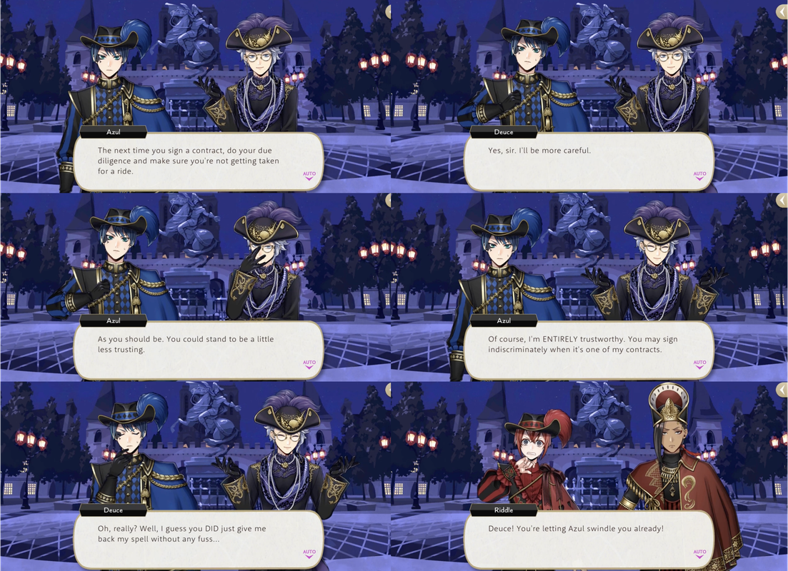 When Azul assures him that he may sign his contracts indiscriminately Deuce responds, “Oh, really? Well, I guess you DID just give me back my spell without any fuss…” (Riddle: “Deuce! You’re letting Azul swindle you already!”)