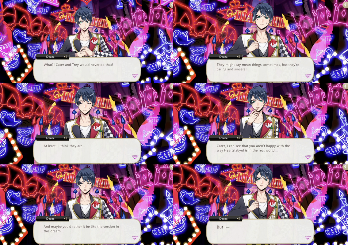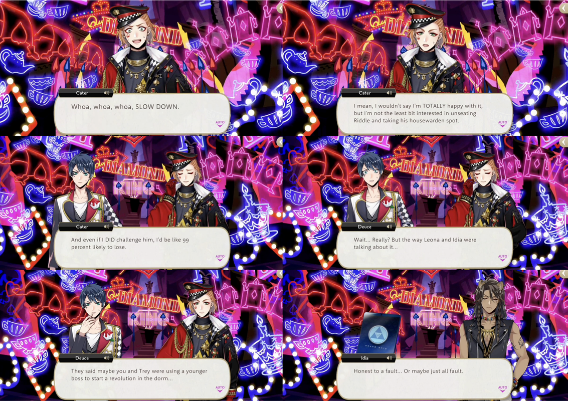 When Deuce goes to Cater on the topic of his being unsatisfied with Riddle (after seeing Cater’s dream of Book 7) Cater denies it, saying he isn’t “totally happy” with Heartslabyul but he is not interested in unseating Riddle, and would lose even if he tried.