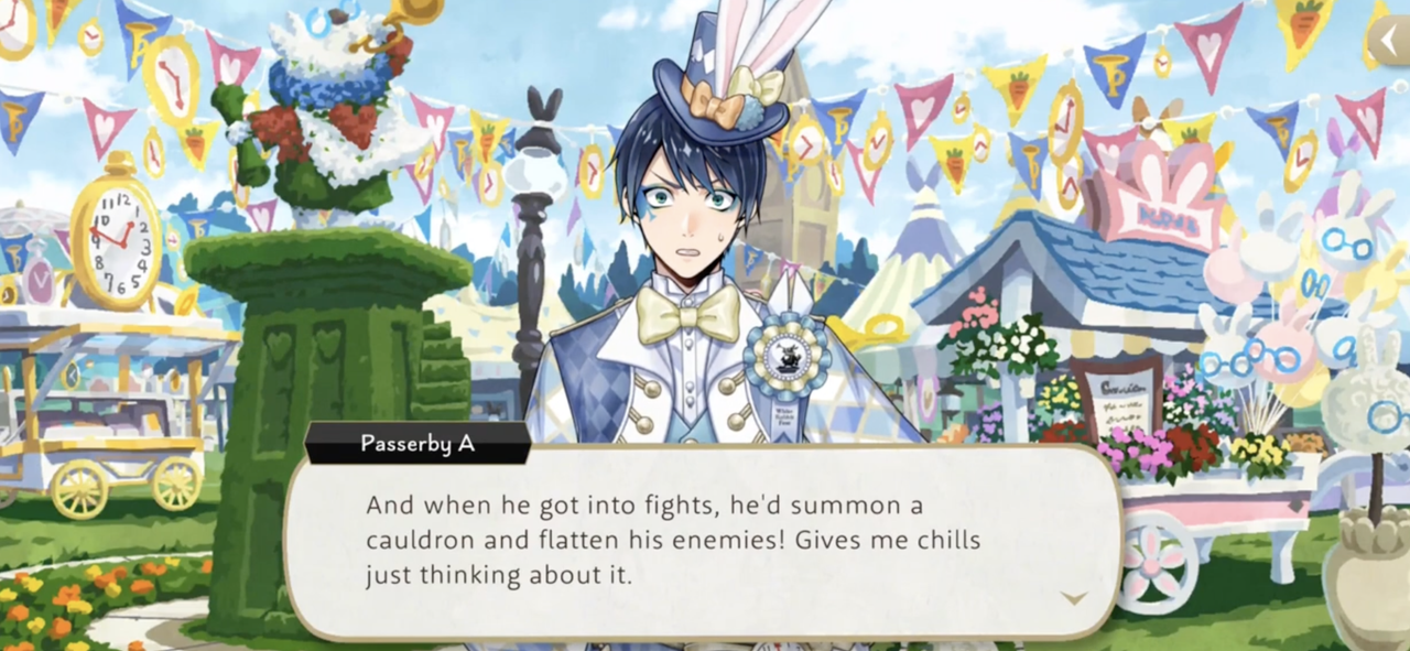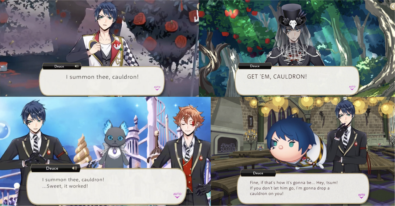 Deuce summons a cauldron during the overblot fight against Riddle, underwater in a fight against Jade and Floyd, onto bullies during Halloween, for protection during Rabbit Fes and Vargas Camp, and threatens his tsum with a cauldron during Tsumsted.