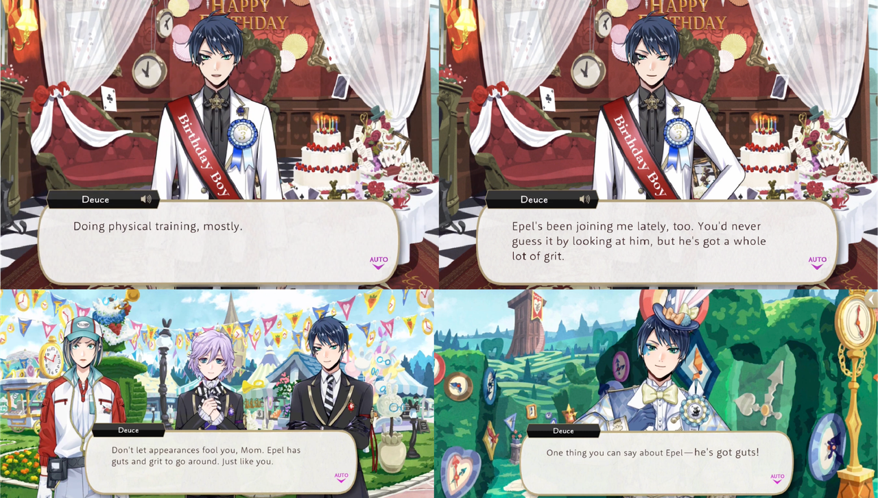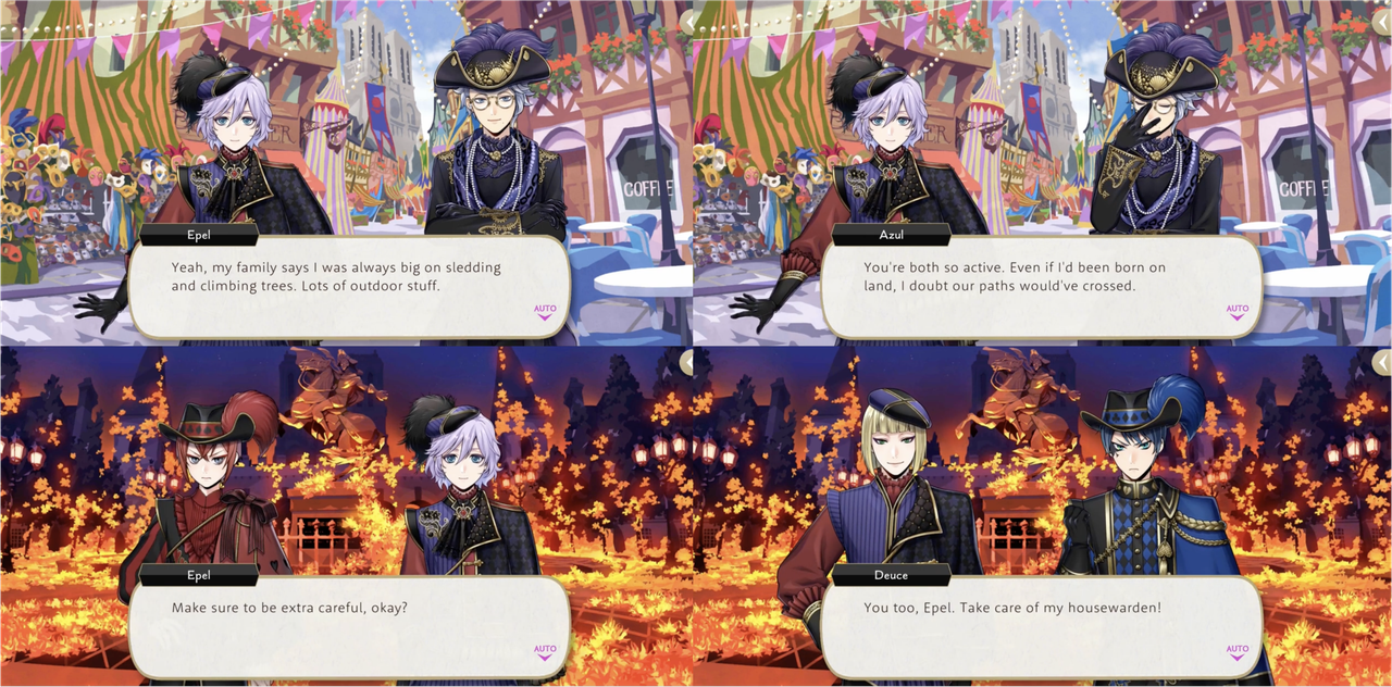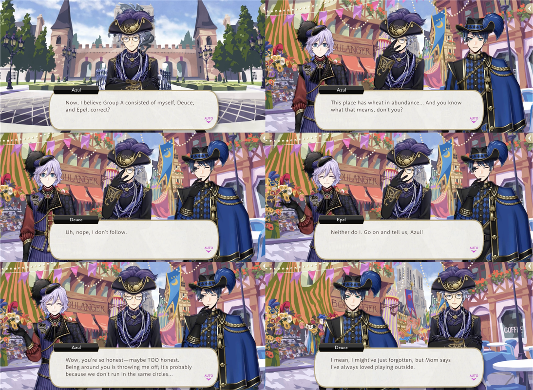 Deuce and Epel are in a group together with Azul during Glorious Masquerade, where Azul comments on them being too honest and throwing him off. They both say that they loved playing outside as children.