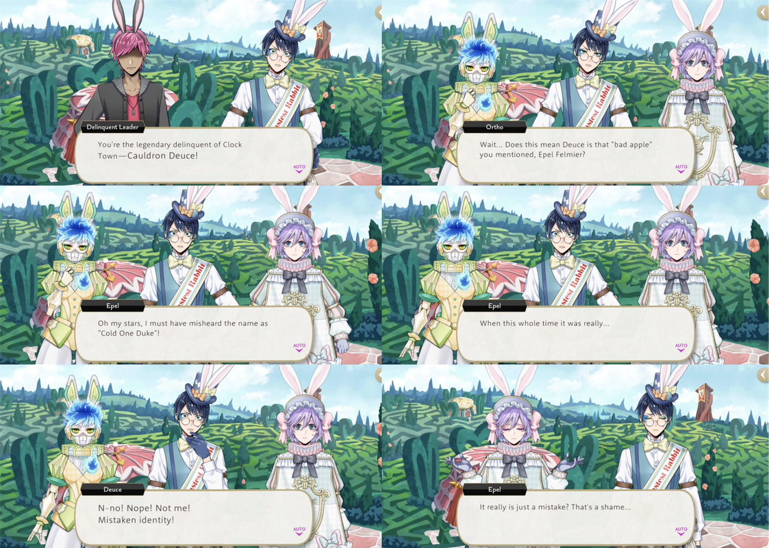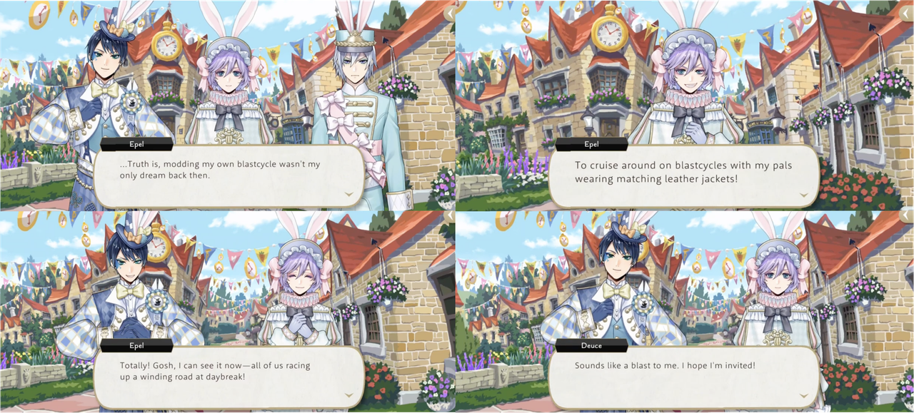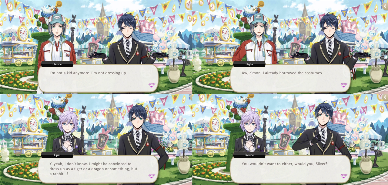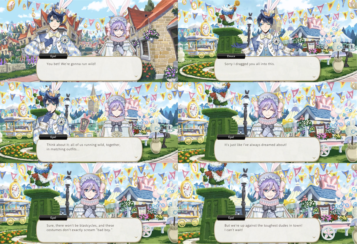 Both Deuce and Epel are against wearing bunny costumes for White Rabbit Fes, but when every other character is in favor of doing so Epel wonders, “Maybe we’re the weird ones?”