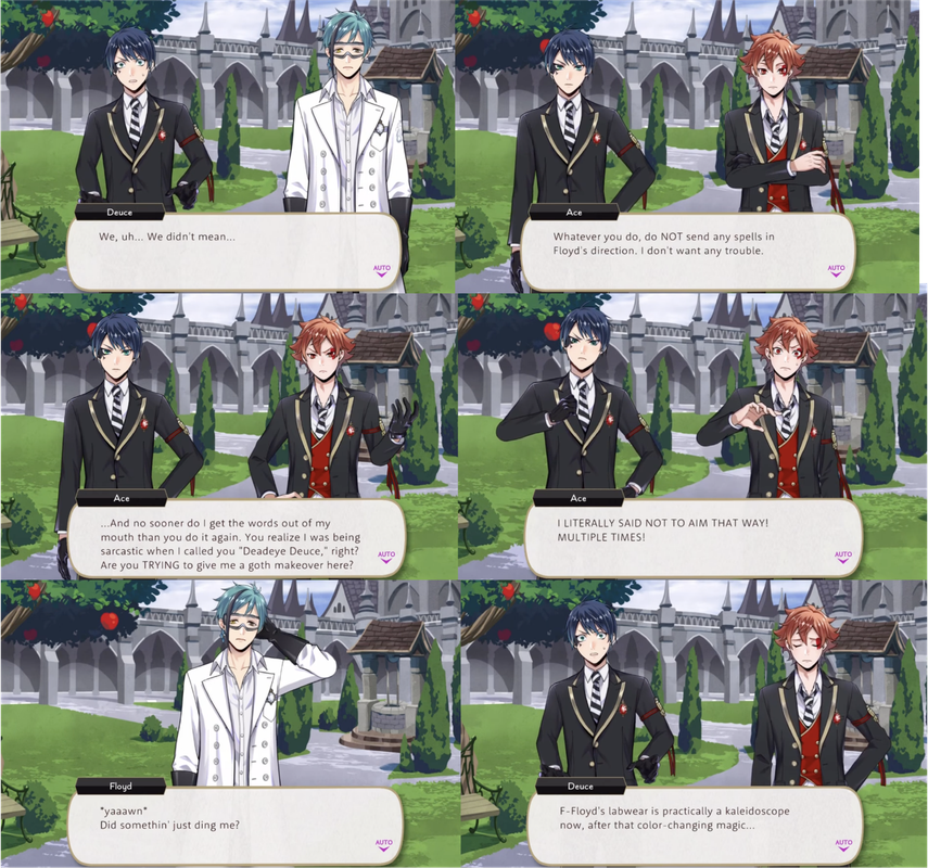 Floyd does not appreciate Deuce’s insinuation that he won’t be able to evade their “lame attempts at magic,” but Deuce ultimately does hit him with a spell, turning his labwear into “practically a kaleidoscope.”