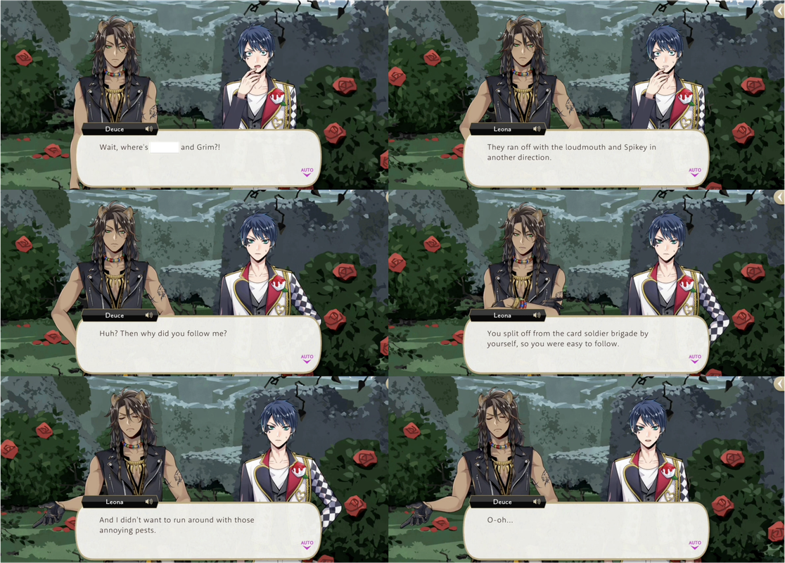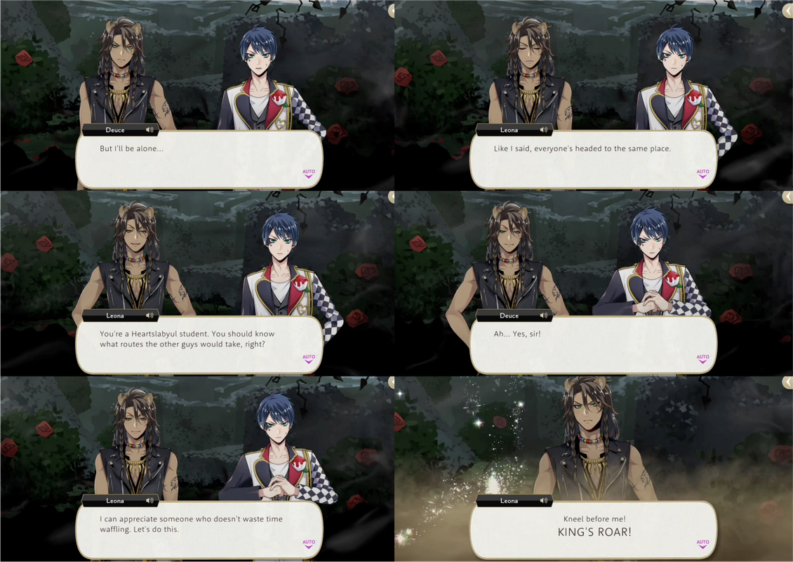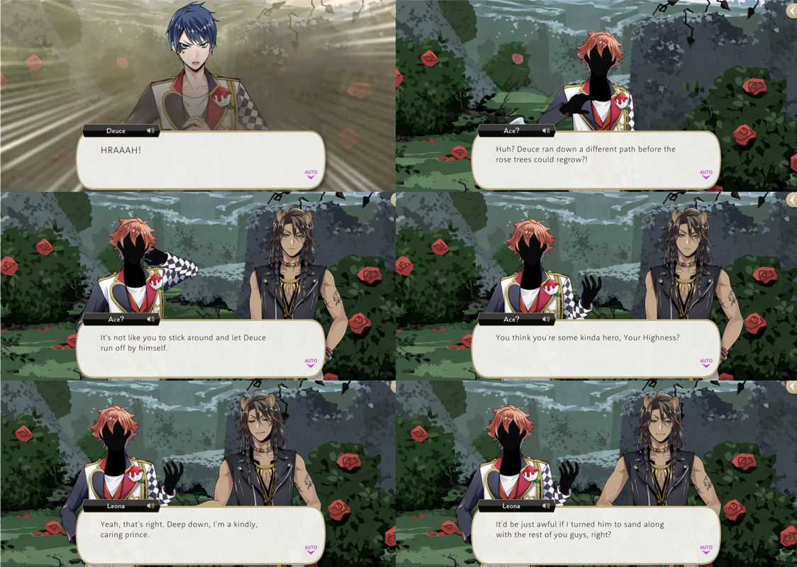 (Darkness Ace: “It’s not like you to stick around and let Deuce run off by himself. You think you’re some kinda hero, Your Highness?” – Leona: “Yeah, that’s right. Deep down, I’m a kindly, caring prince.”)