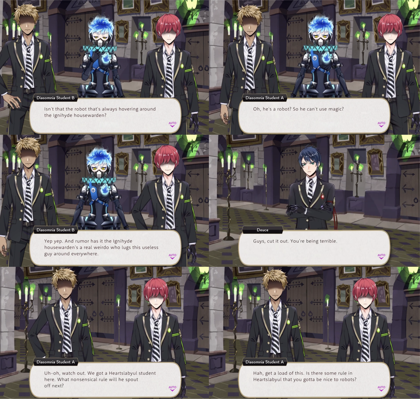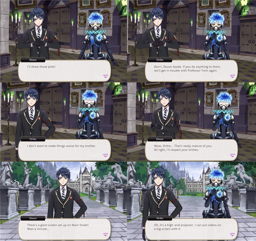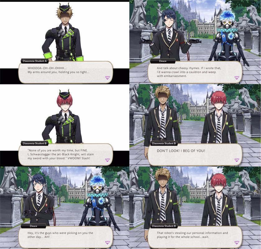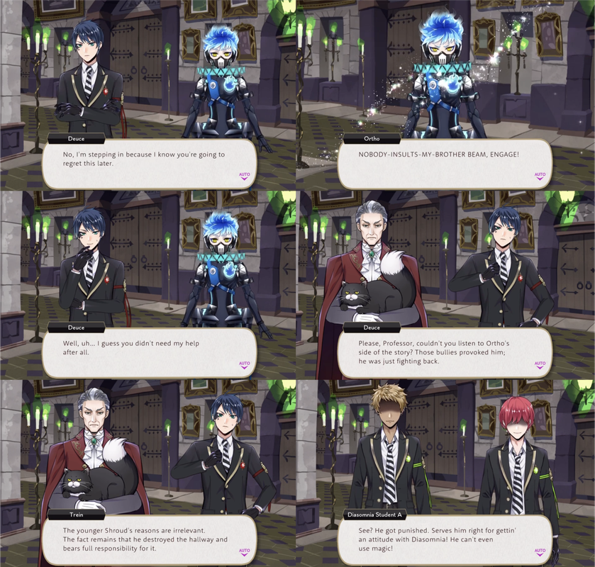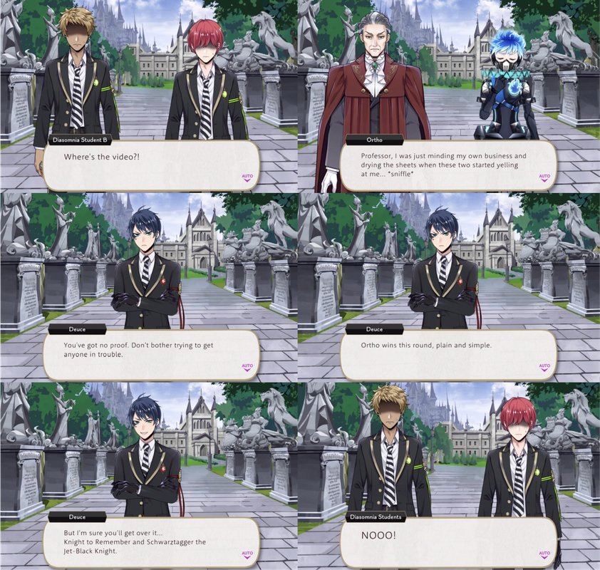 Deuce and Ortho overlap in a vignette where Deuce tries to stop Diasomnia students from bullying Ortho, saying that he knows they are going to regret it later.