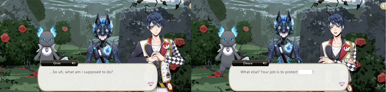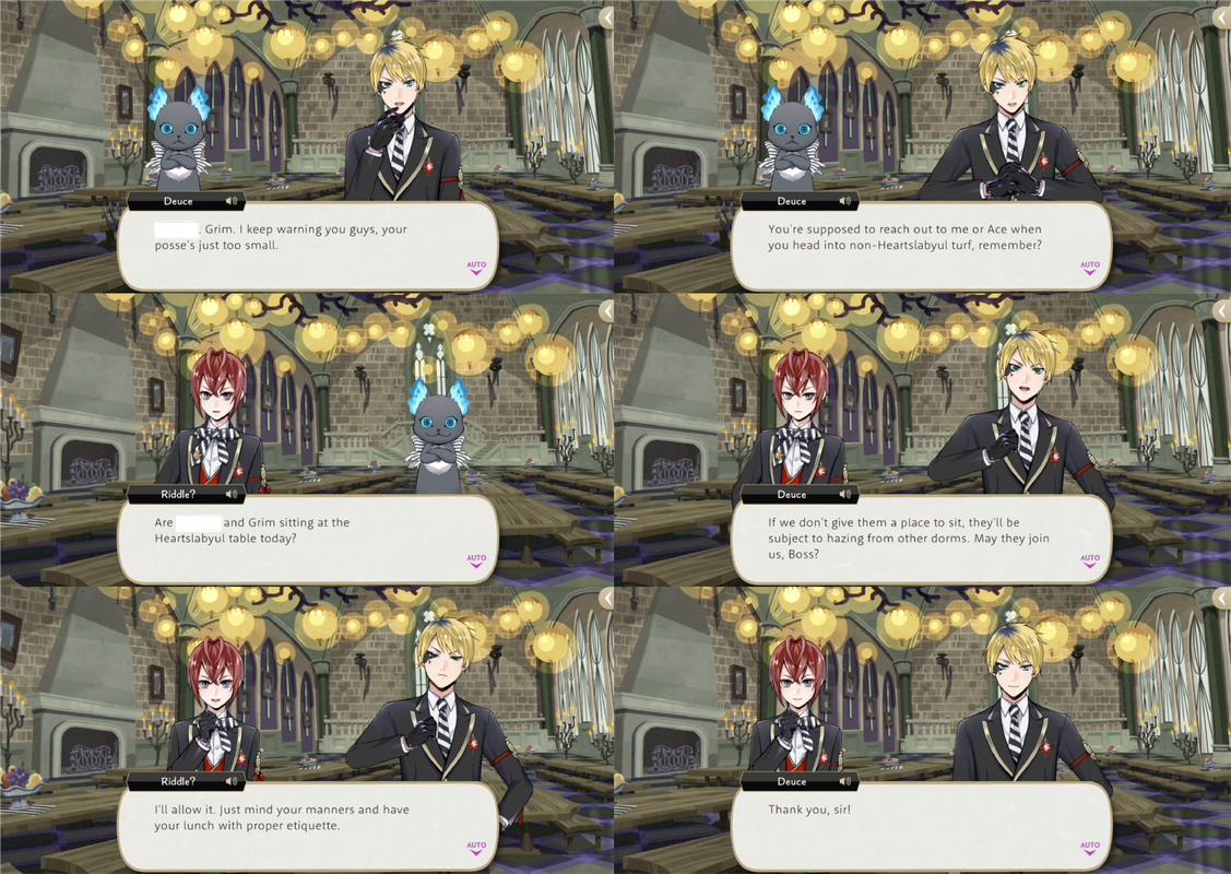 Deuce asks and receives permission from Dream-Riddle for the prefect and Grim to sit with Heartslabyul during lunch in order to protect them from hazing by other dorms.