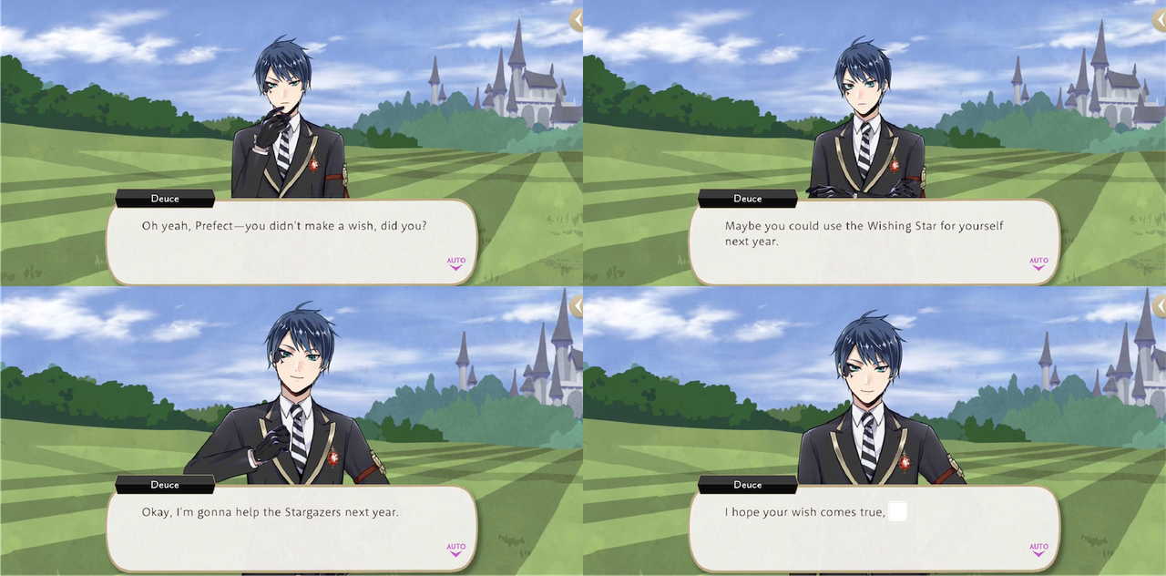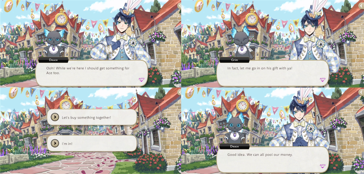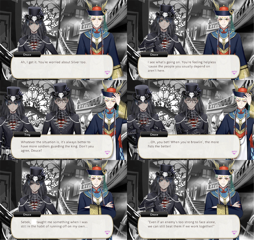 The prefect, Deuce and Grim pool their money together to buy a souvenir for Ace, and Deuce invites the prefect back to his hometown again after White Rabbit Fes (“I’ll try and be a better tour guide next time”).