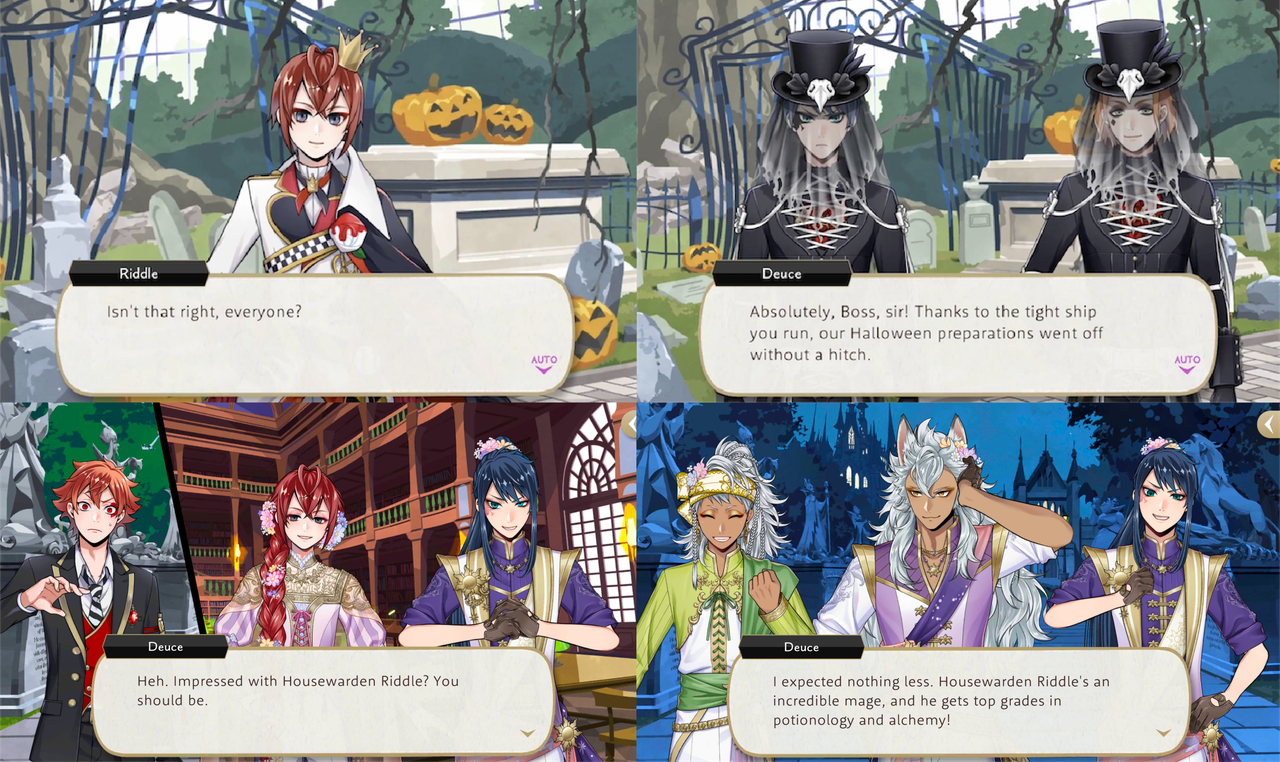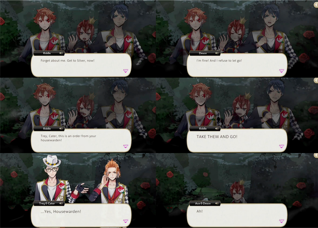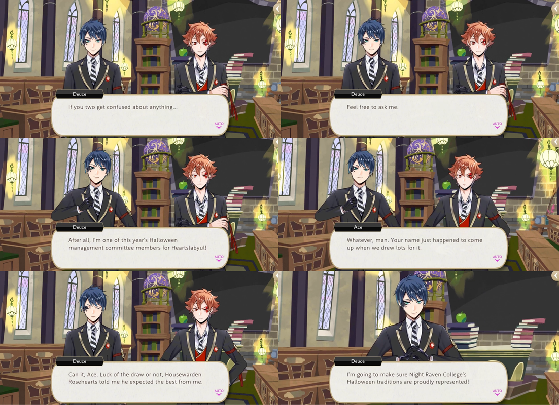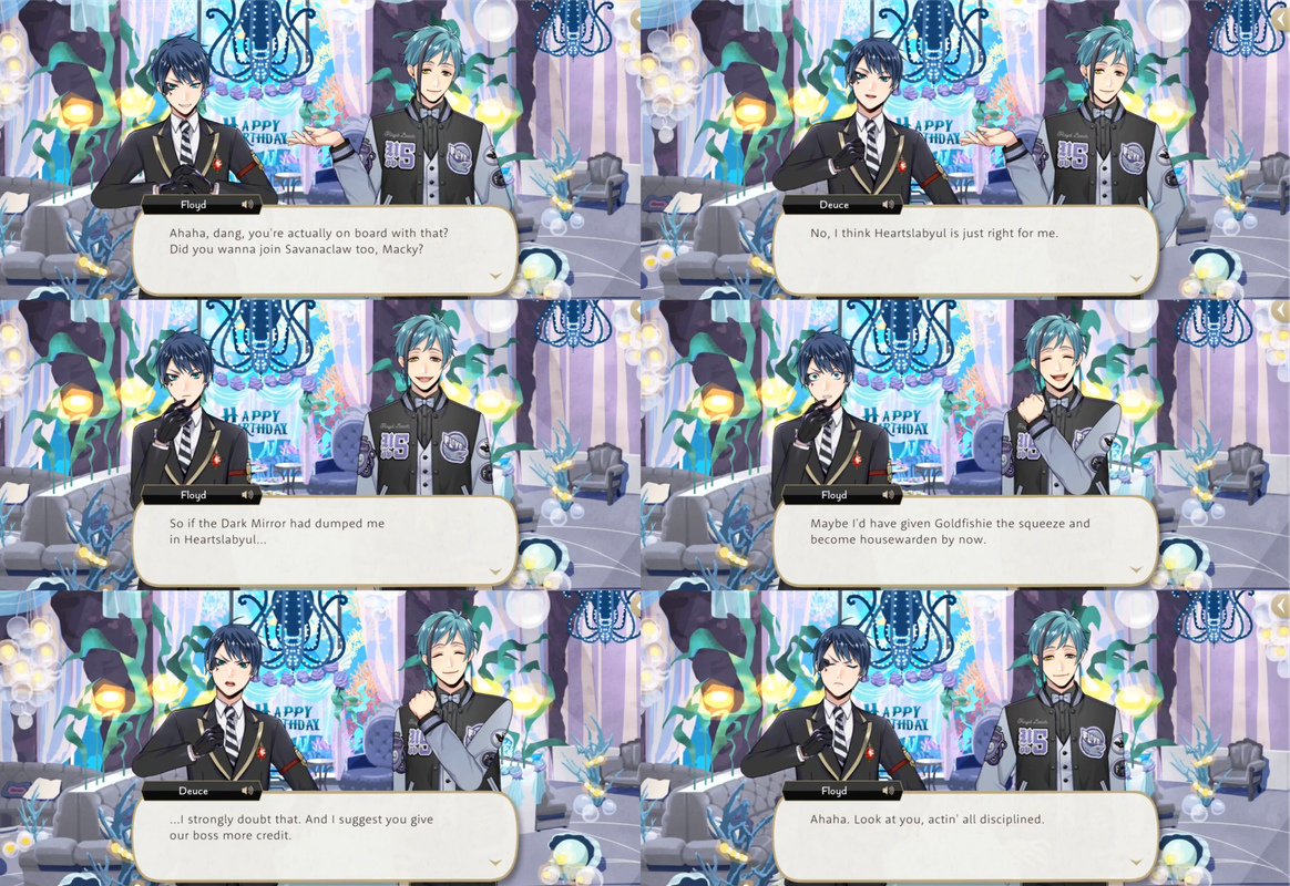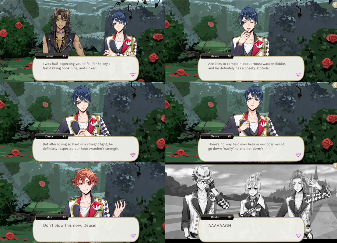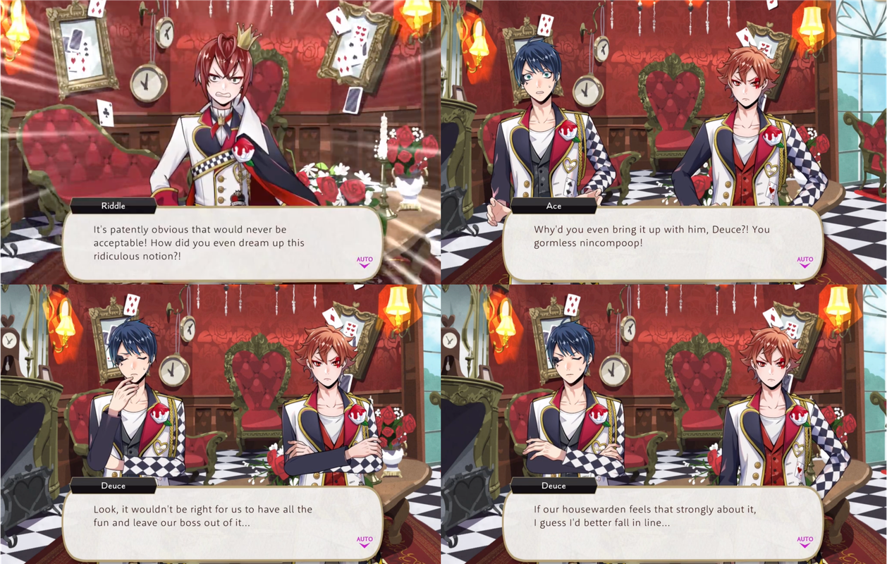 When Ace invites Deuce to skip school in favor of visiting Playfulland, Deuce invites Riddle to join them: “it wouldn’t be right for us to have all the fun and leave our boss out of it…”