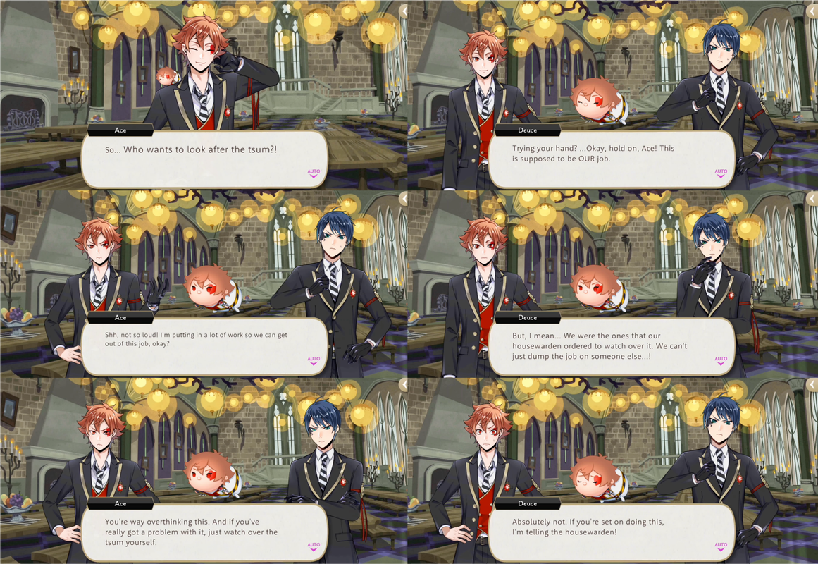 When Ace tries to find other students to look out for his tsum during Tsumsted Deuce refuses to be complicit, saying that he will be informing Riddle, who instructed them to do the job themselves.